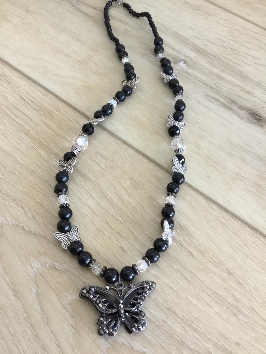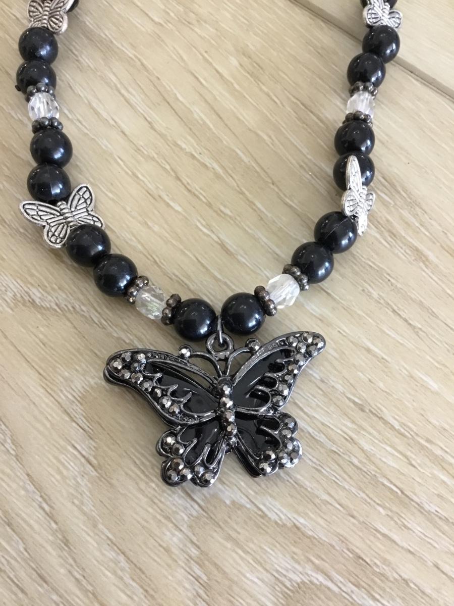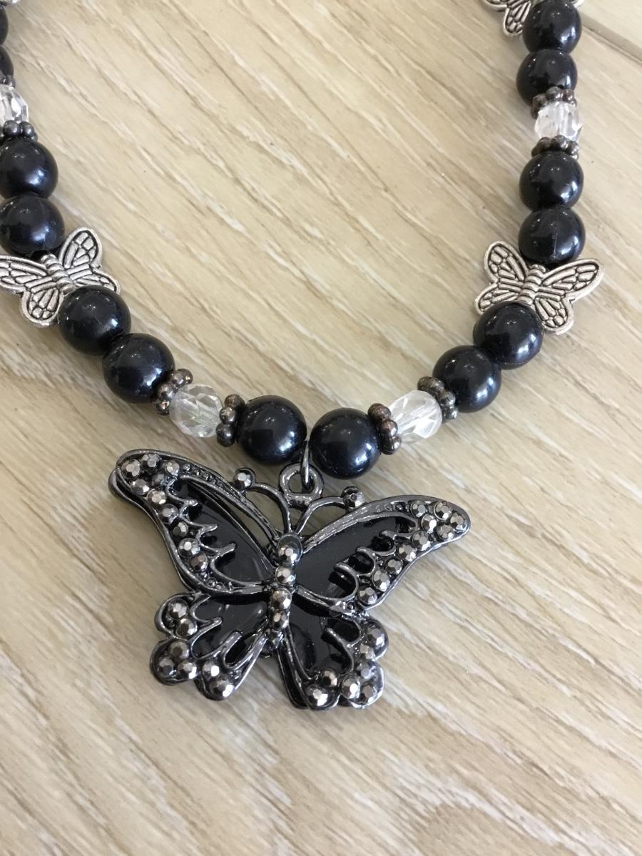 Cute, silver toned, black bead and crystal bead necklace with black butterfly pendant