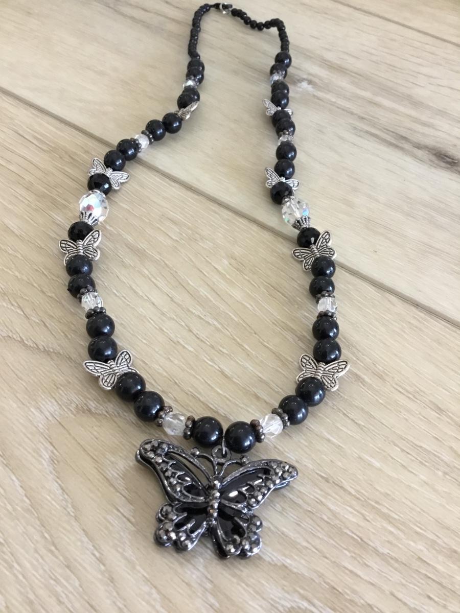 Cute, silver toned, black bead and crystal bead necklace with black butterfly pendant