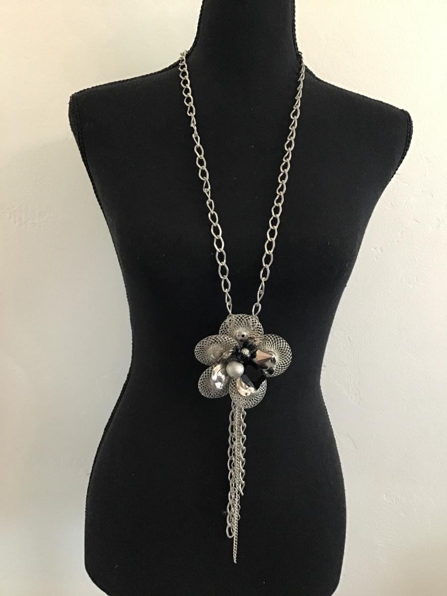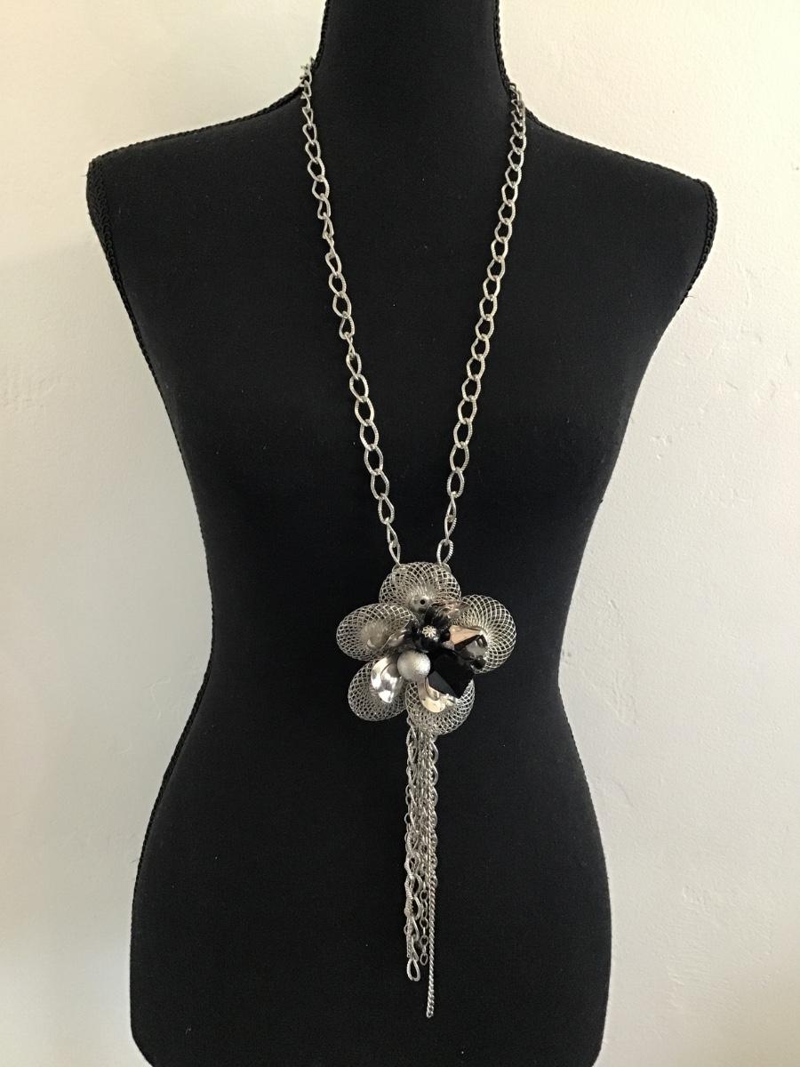Cute Silver, toned, , flower, mesh statement, tassel necklace