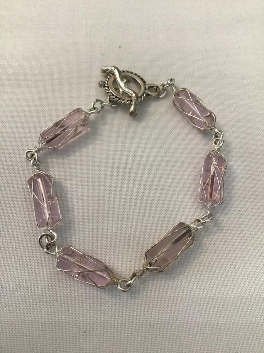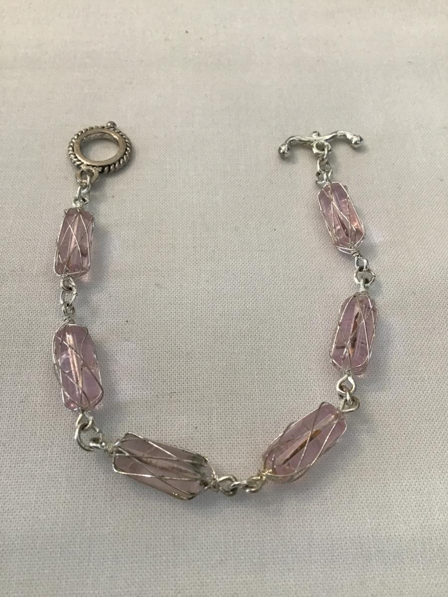 Cute, silver toned, rose quartz, crystal caged, beaded toggle bracelet