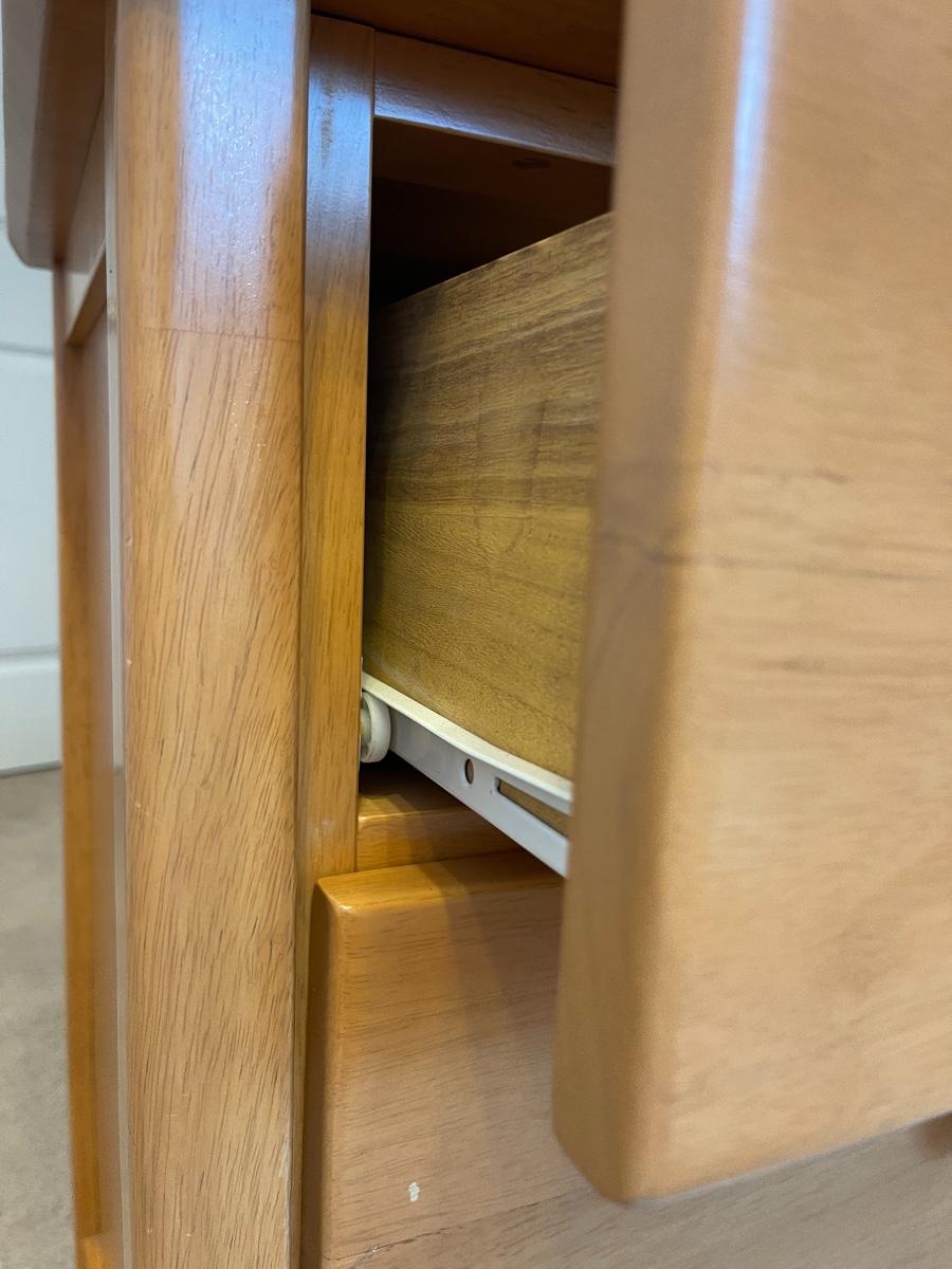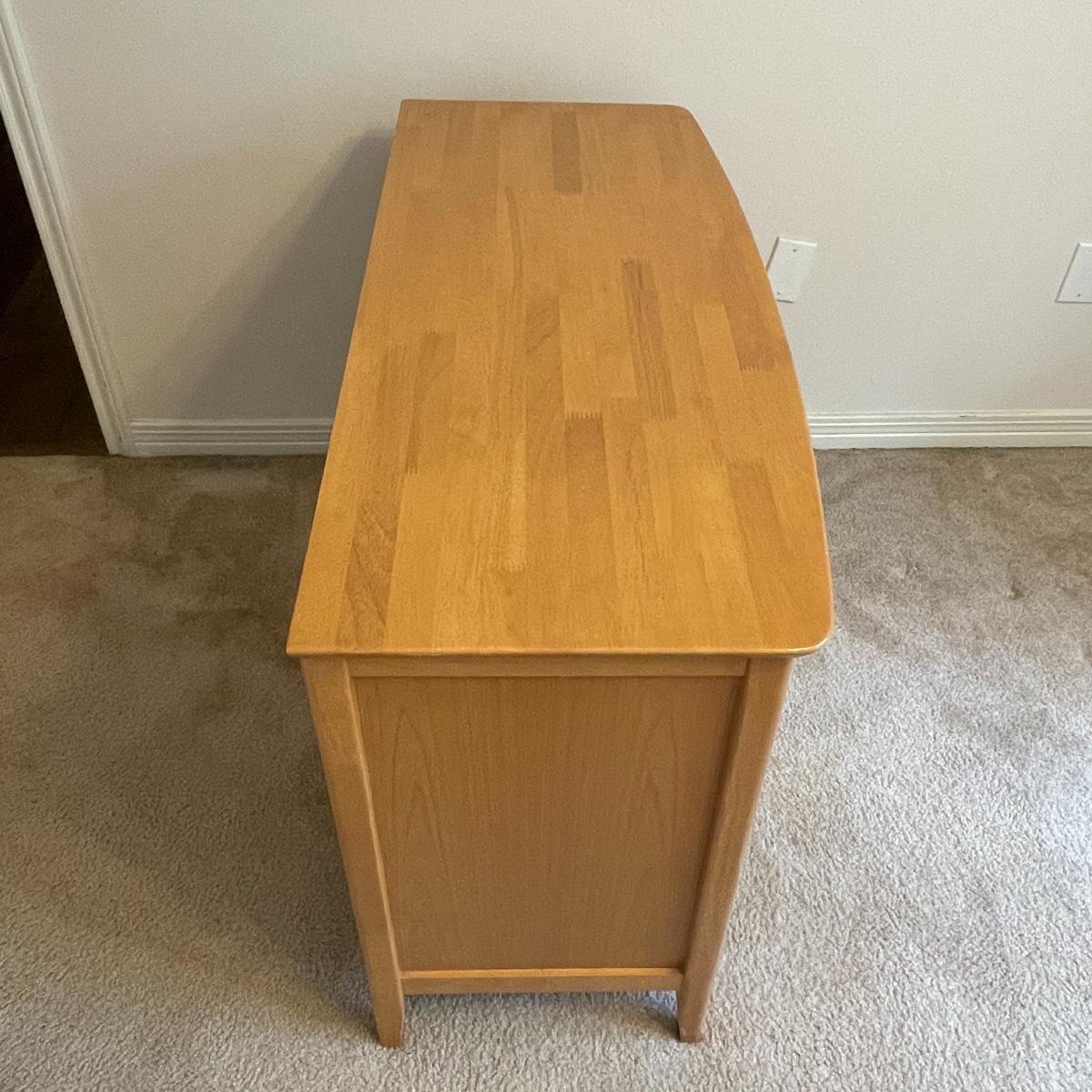 Natural wood finish. All drawers open and close easily. No brand or marking found.