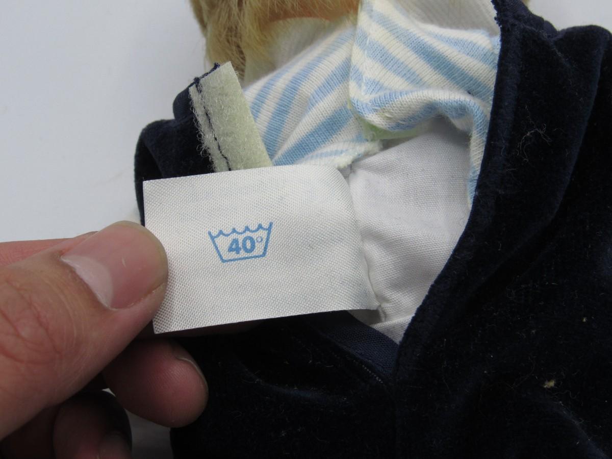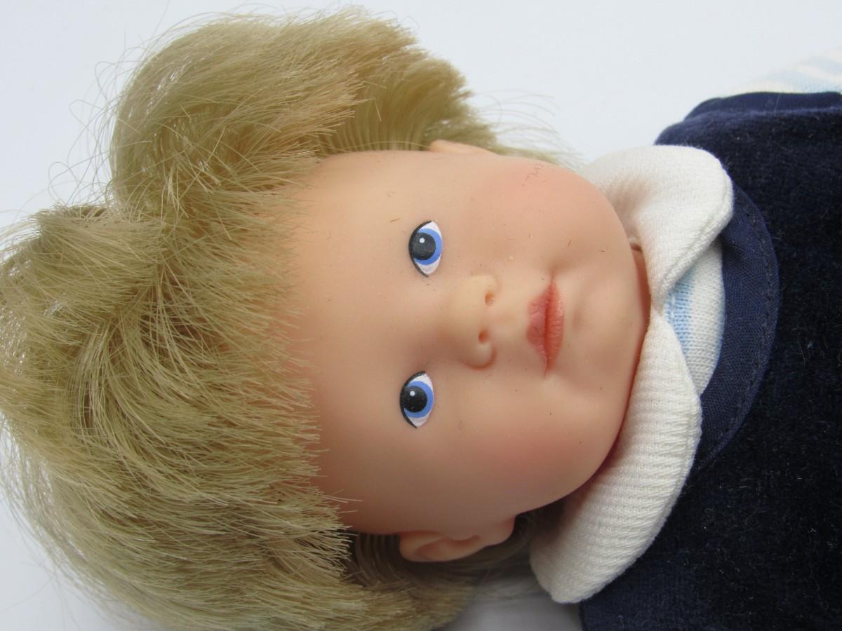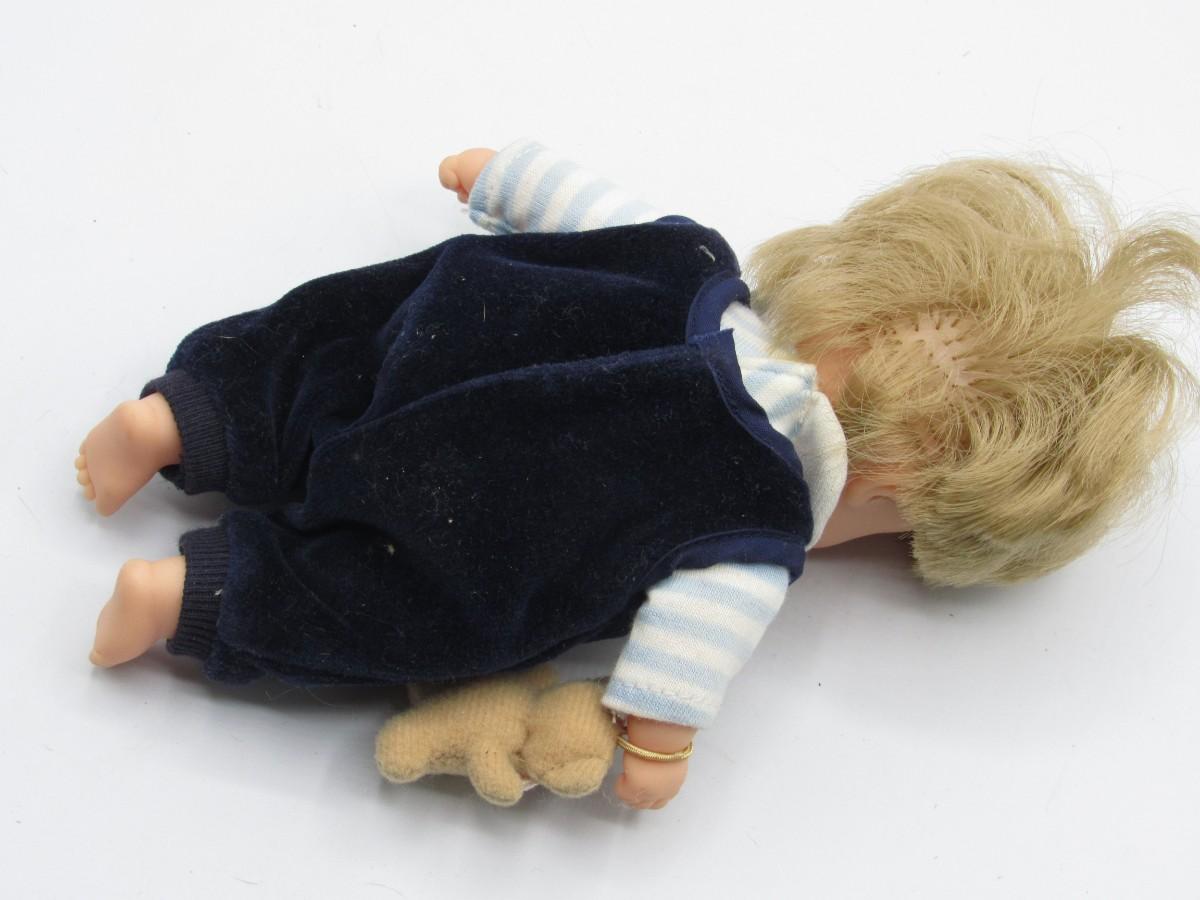Toddler Doll with onesie and teddy bear attached to wrist. Life-like hair. Approx. 8" tall. Very clean, in good condition.