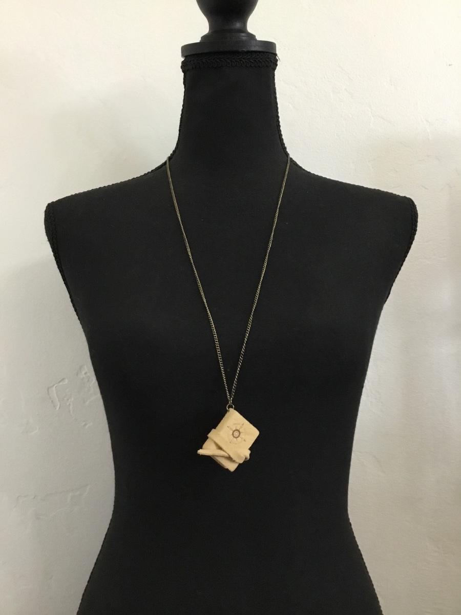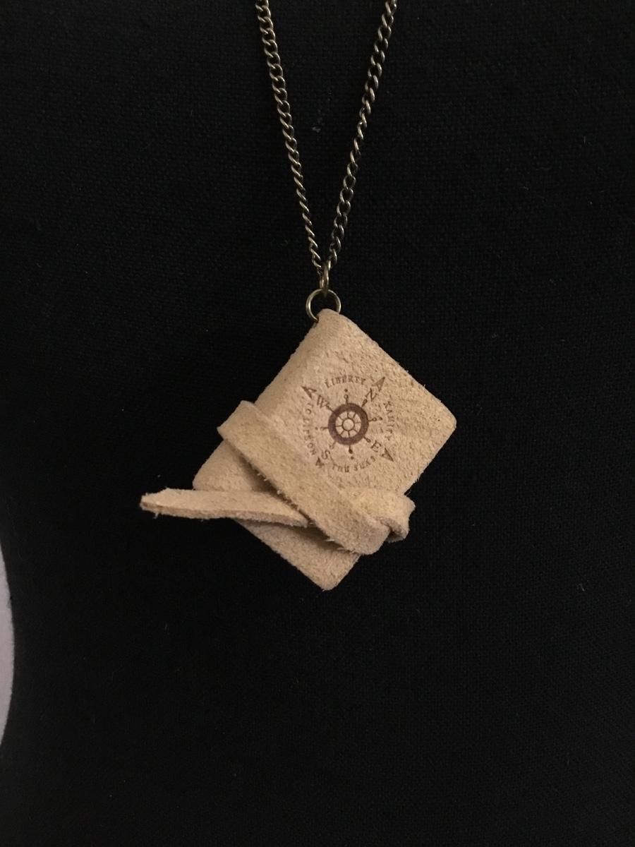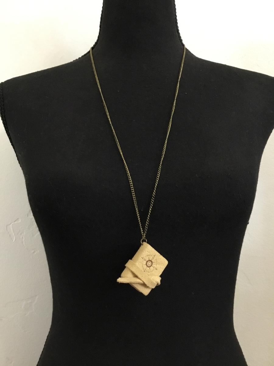 Cute vintage, gold tone, chain necklace with faux leather compass notebook pendant