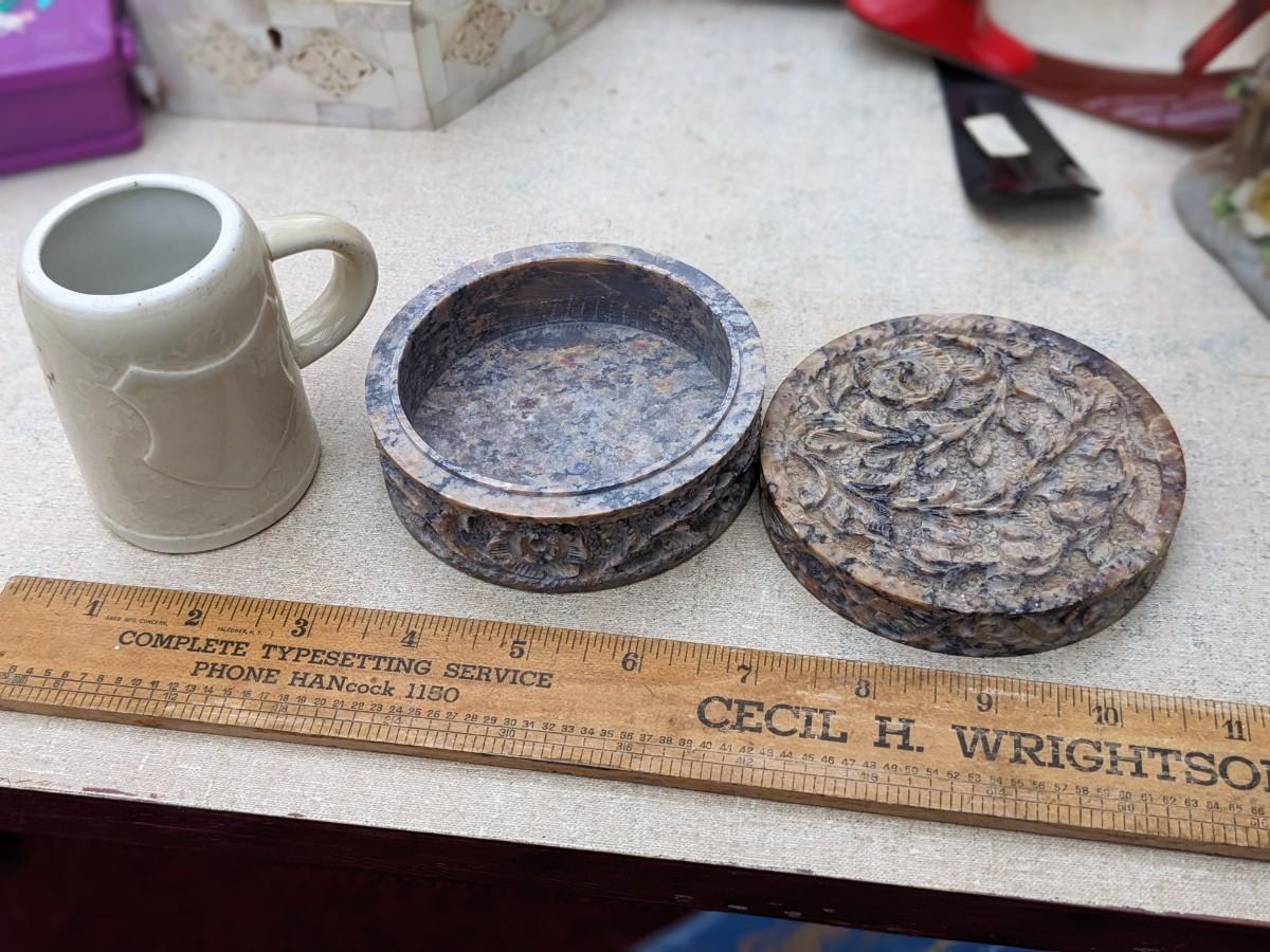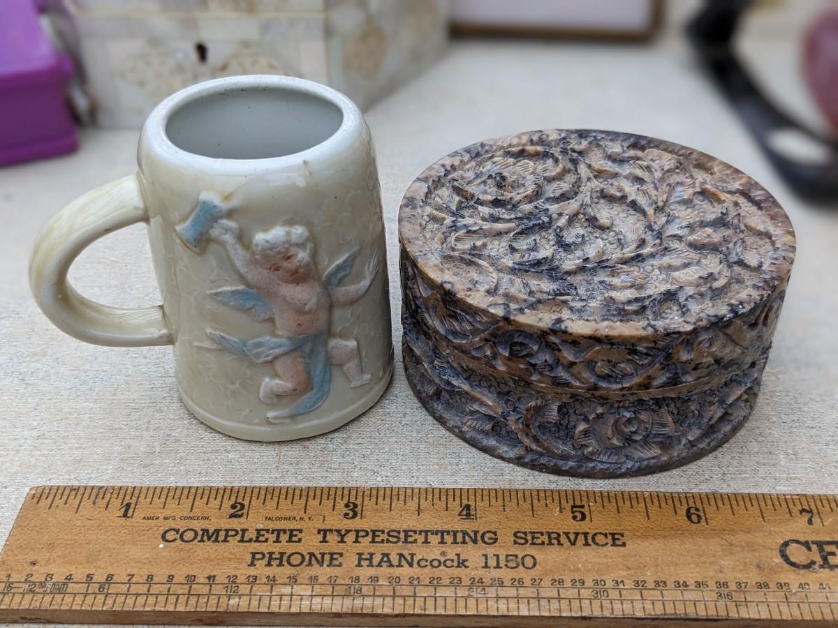 Cute Vtg Cherub Mug and Carved Stone Trinket holder