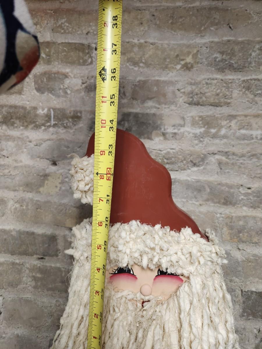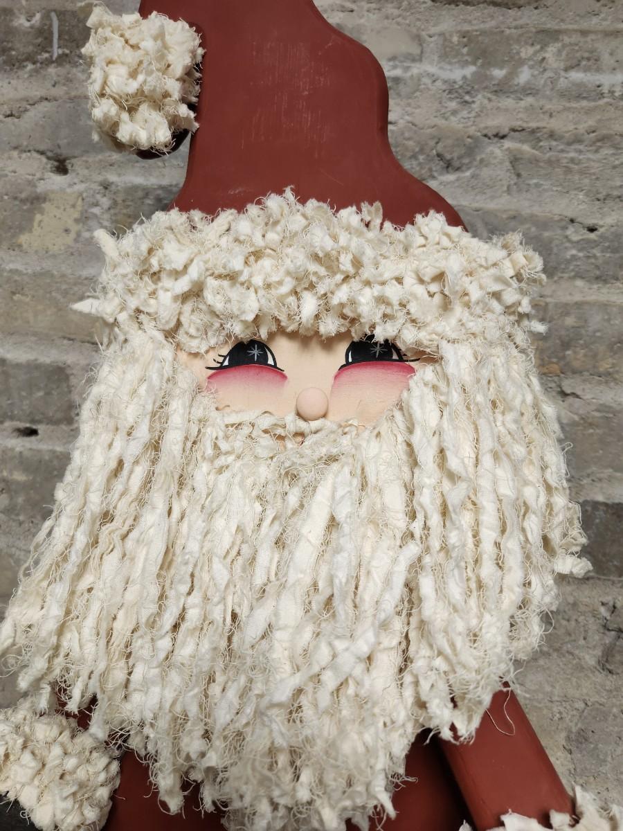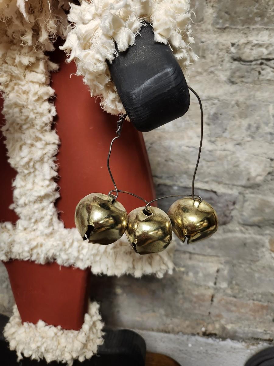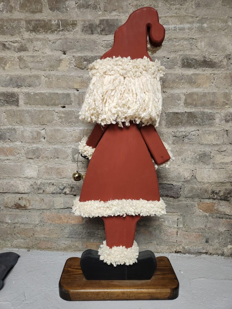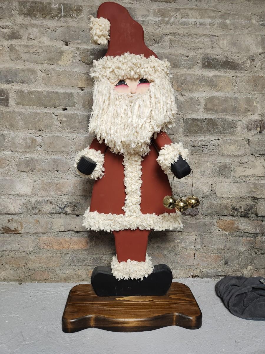 Tall wooden Santa with fabric beard and bells. Super cute decor