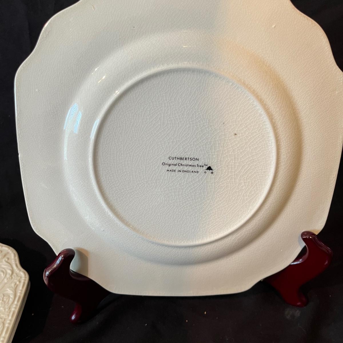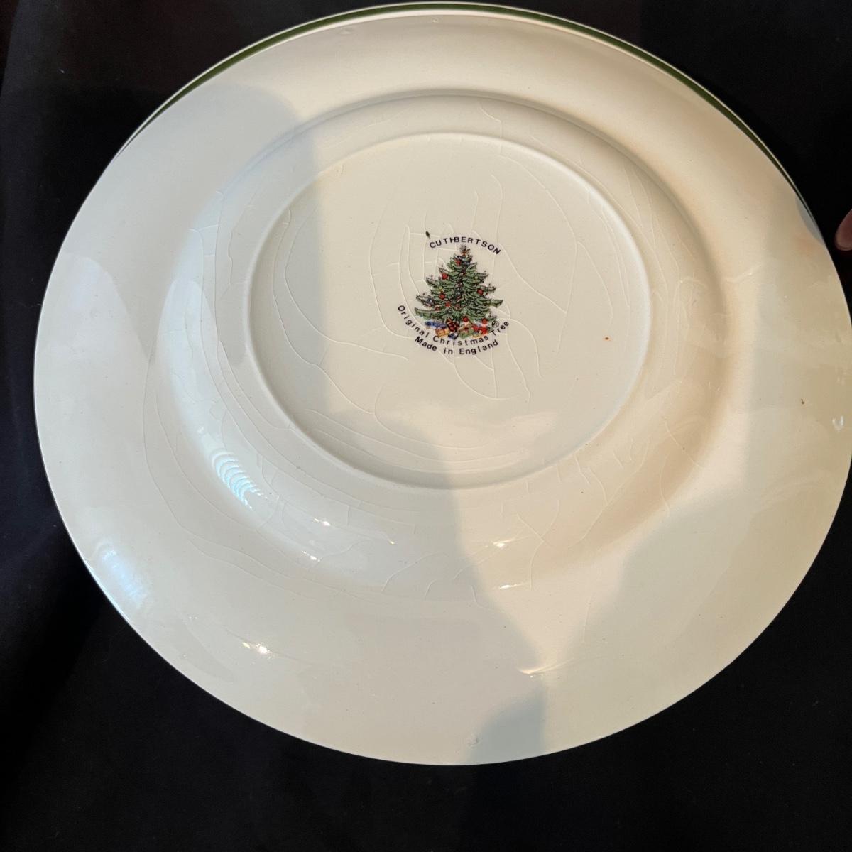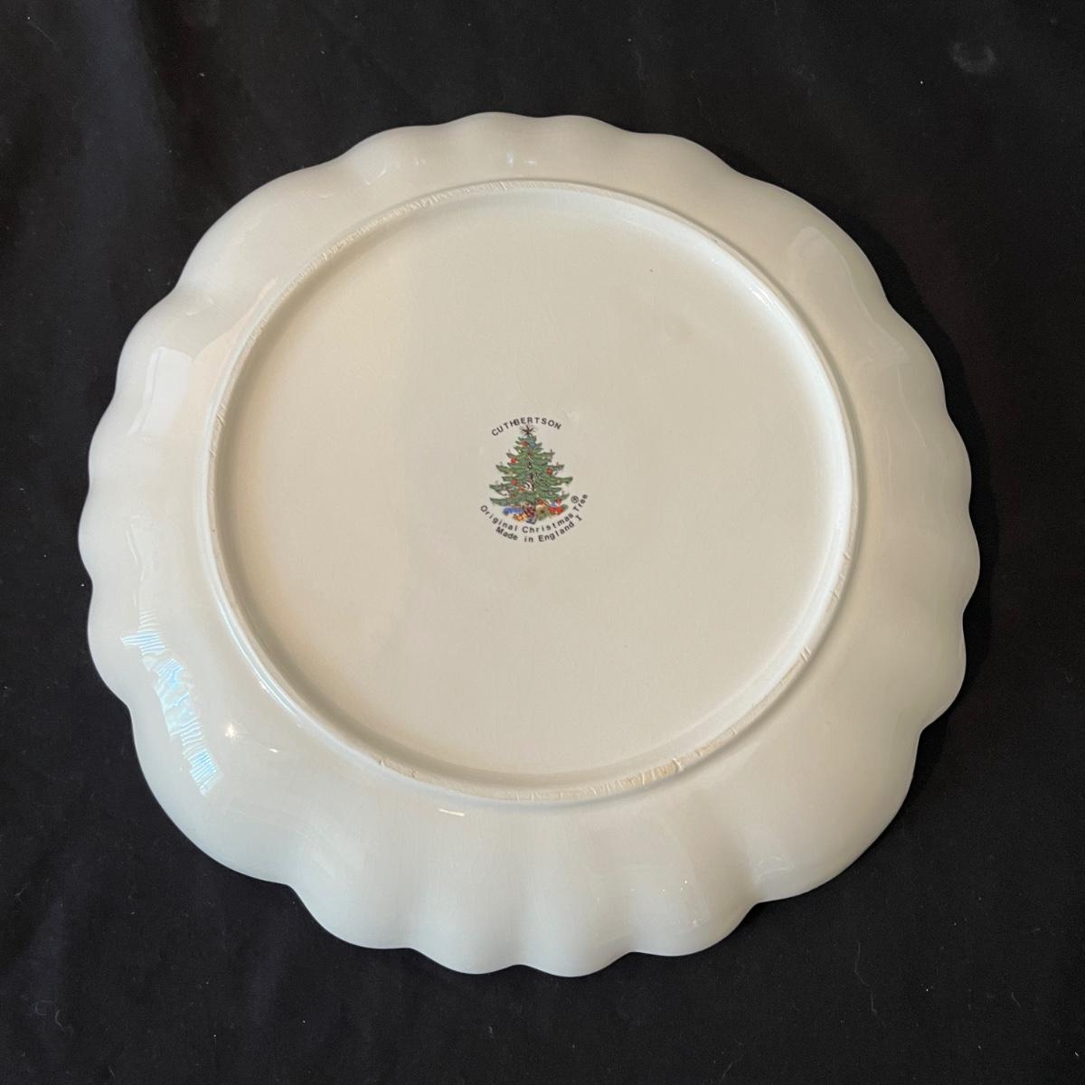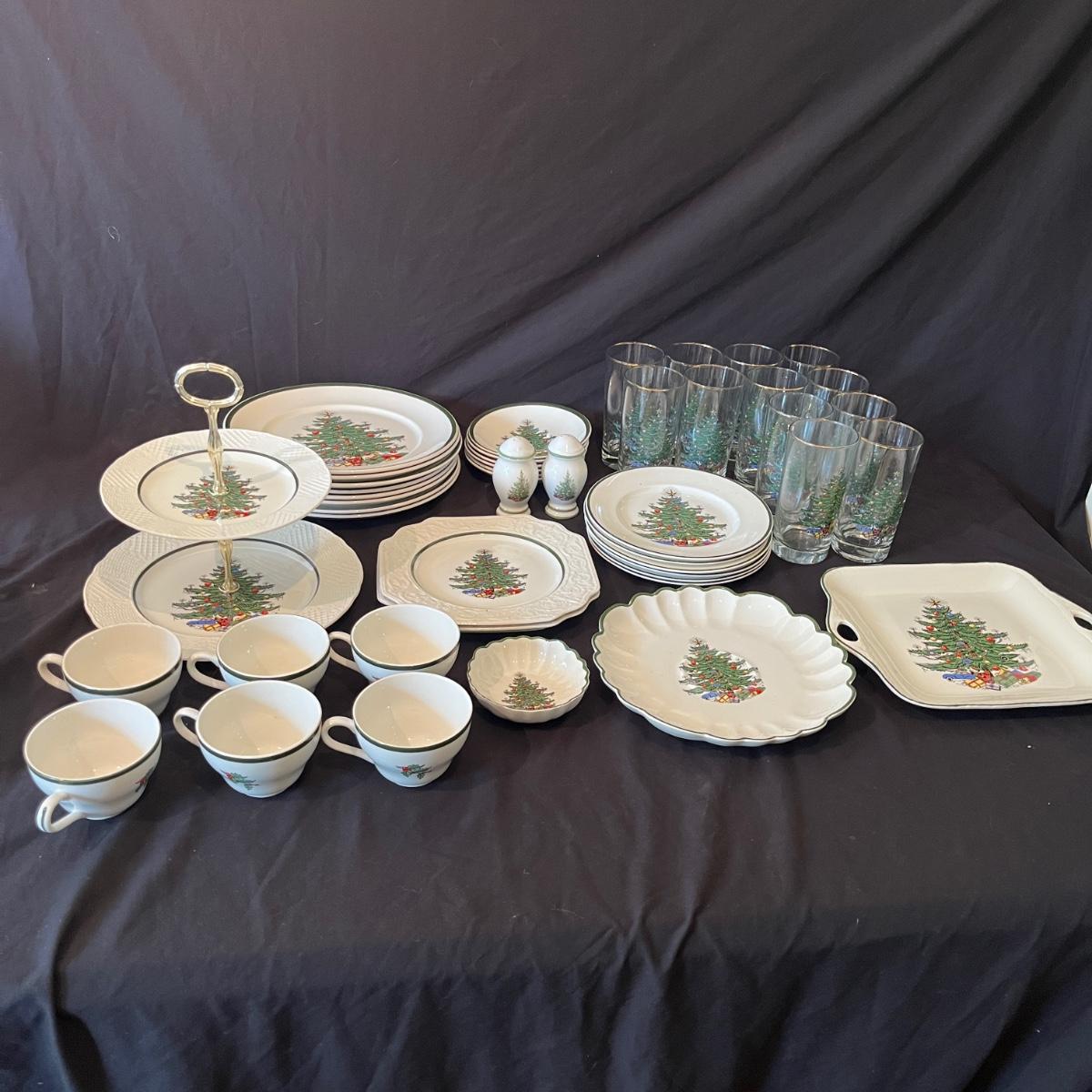 This Cuthbertson set of dishes includes salt and pepper shakers, 12 glasses, six small plates, six medium plates, six teacups, eight dinner plates, two small serving plates, tiered tray and more. Dinner plates measure 10”D. Some overall crazing. Please see photos for details. Plate stand is not included in lot.