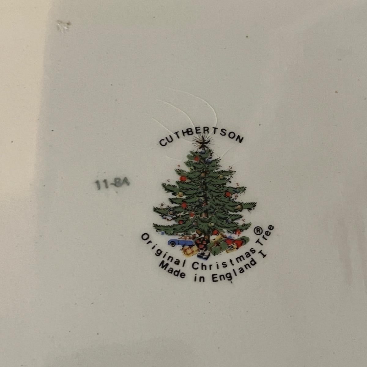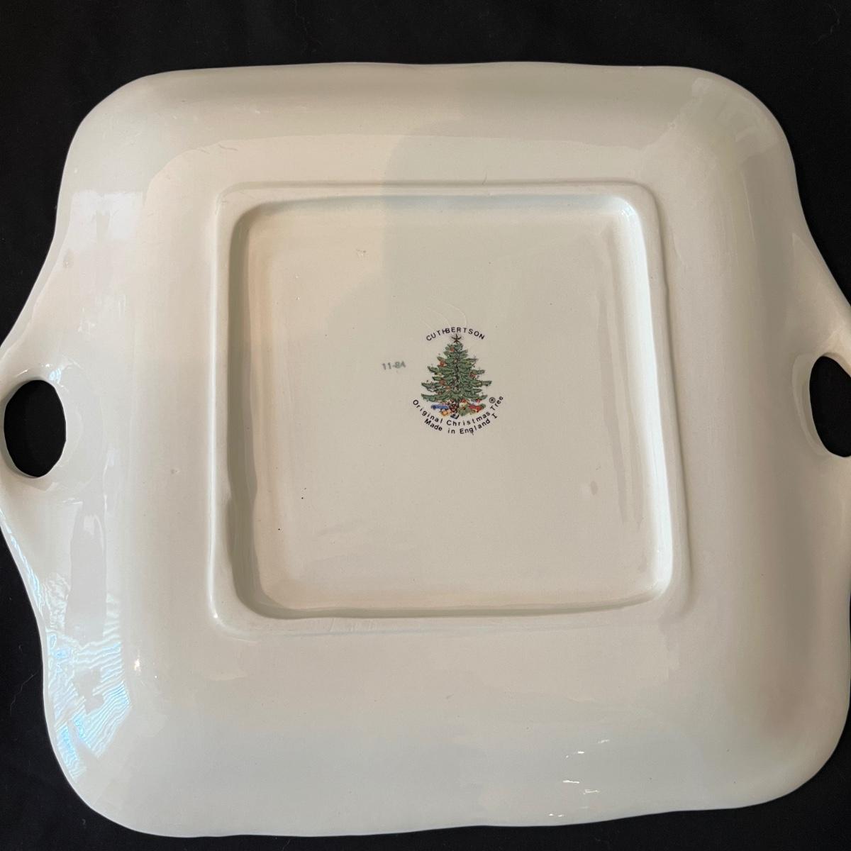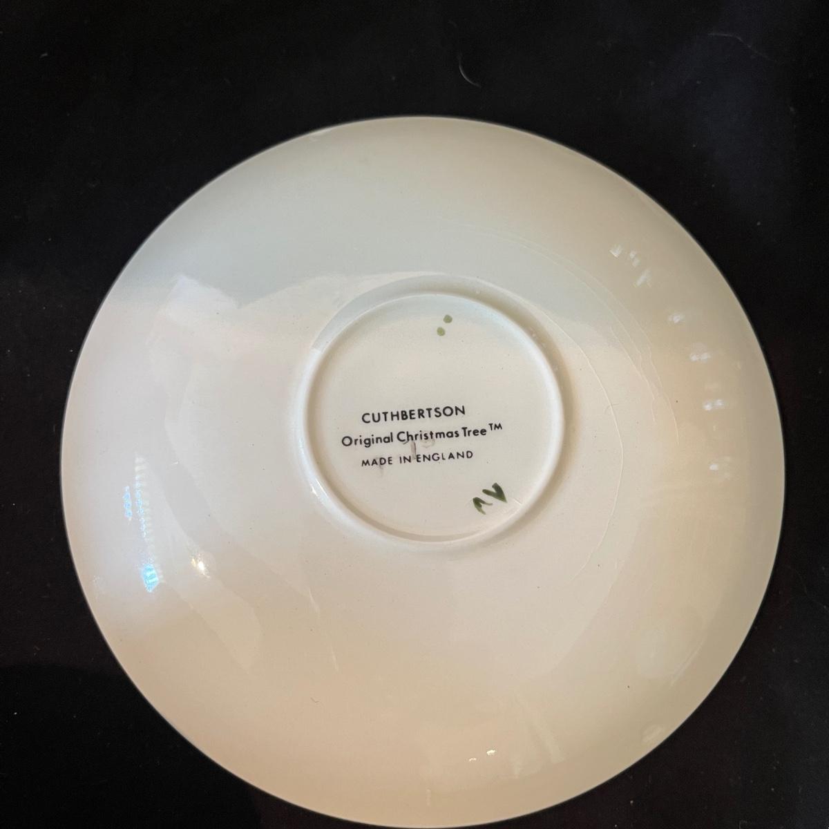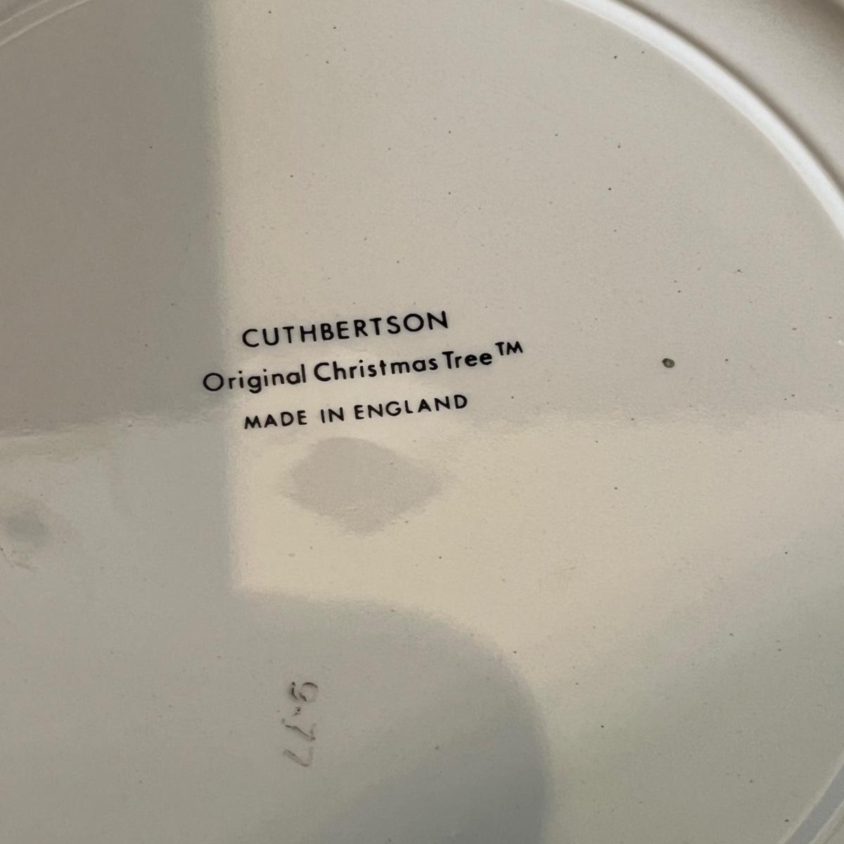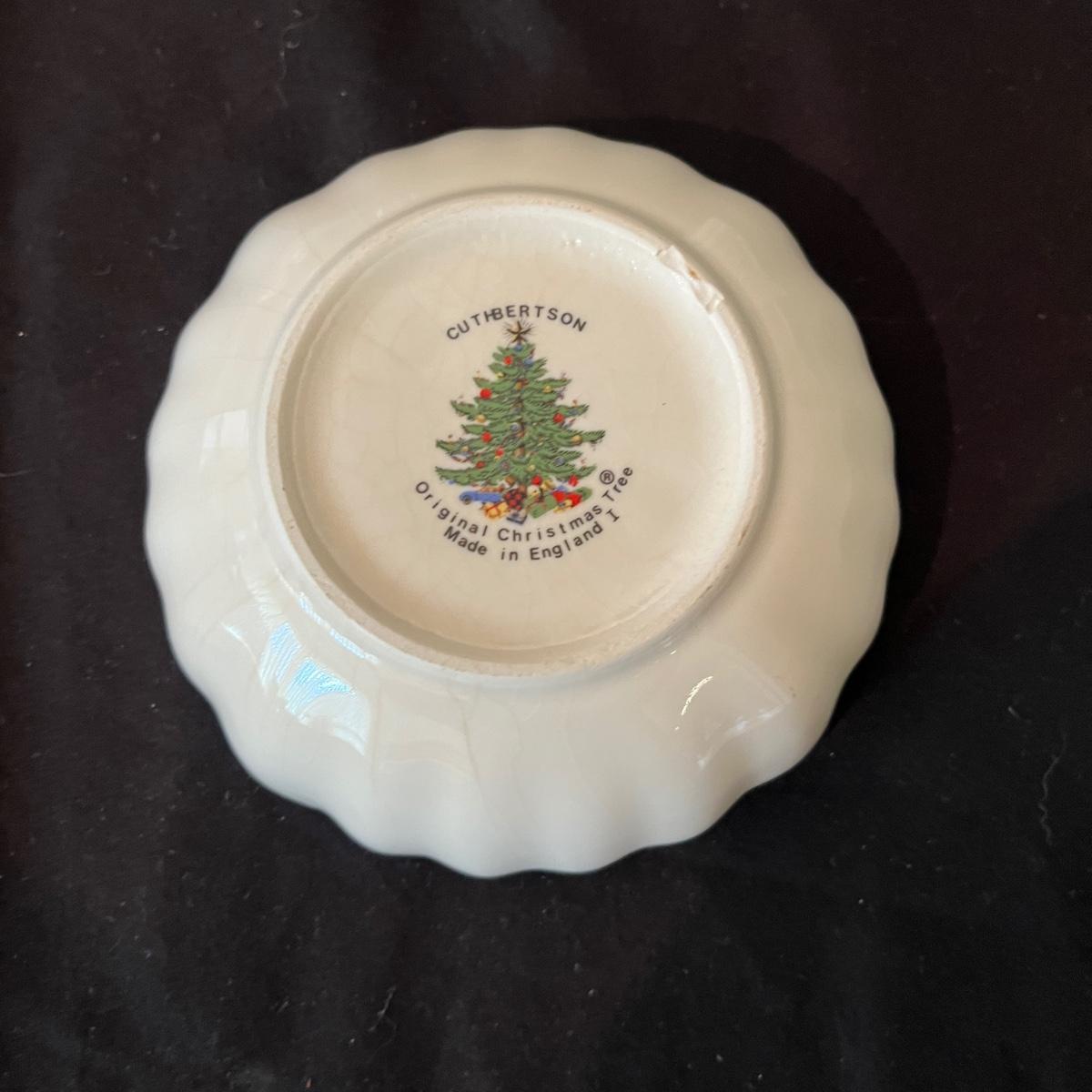 This Cuthbertson set of dishes includes salt and pepper shakers, 12 glasses, six small plates, six medium plates, six teacups, eight dinner plates, two small serving plates, tiered tray and more. Dinner plates measure 10”D. Some overall crazing. Please see photos for details. Plate stand is not included in lot.