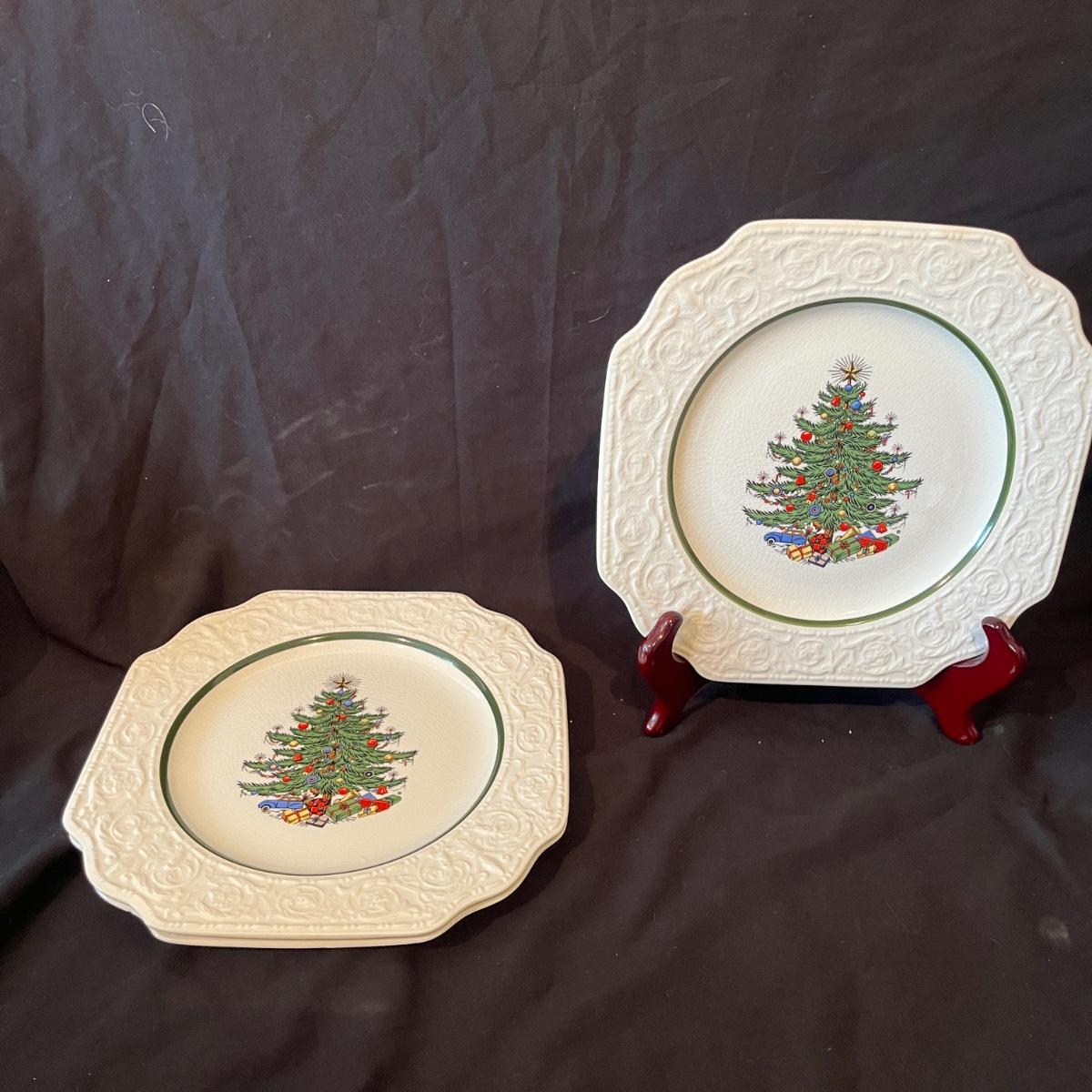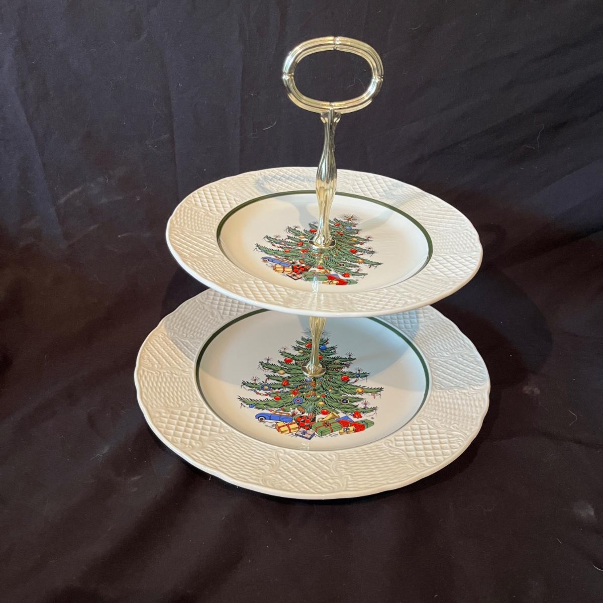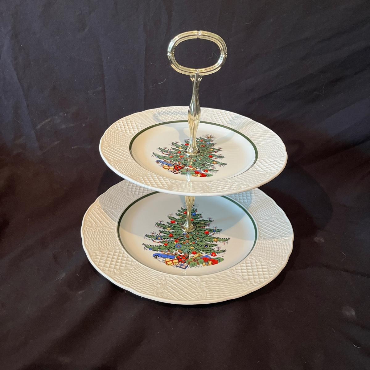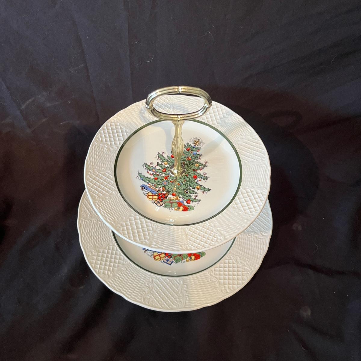 This Cuthbertson set of dishes includes salt and pepper shakers, 12 glasses, six small plates, six medium plates, six teacups, eight dinner plates, two small serving plates, tiered tray and more. Dinner plates measure 10”D. Some overall crazing. Please see photos for details. Plate stand is not included in lot.