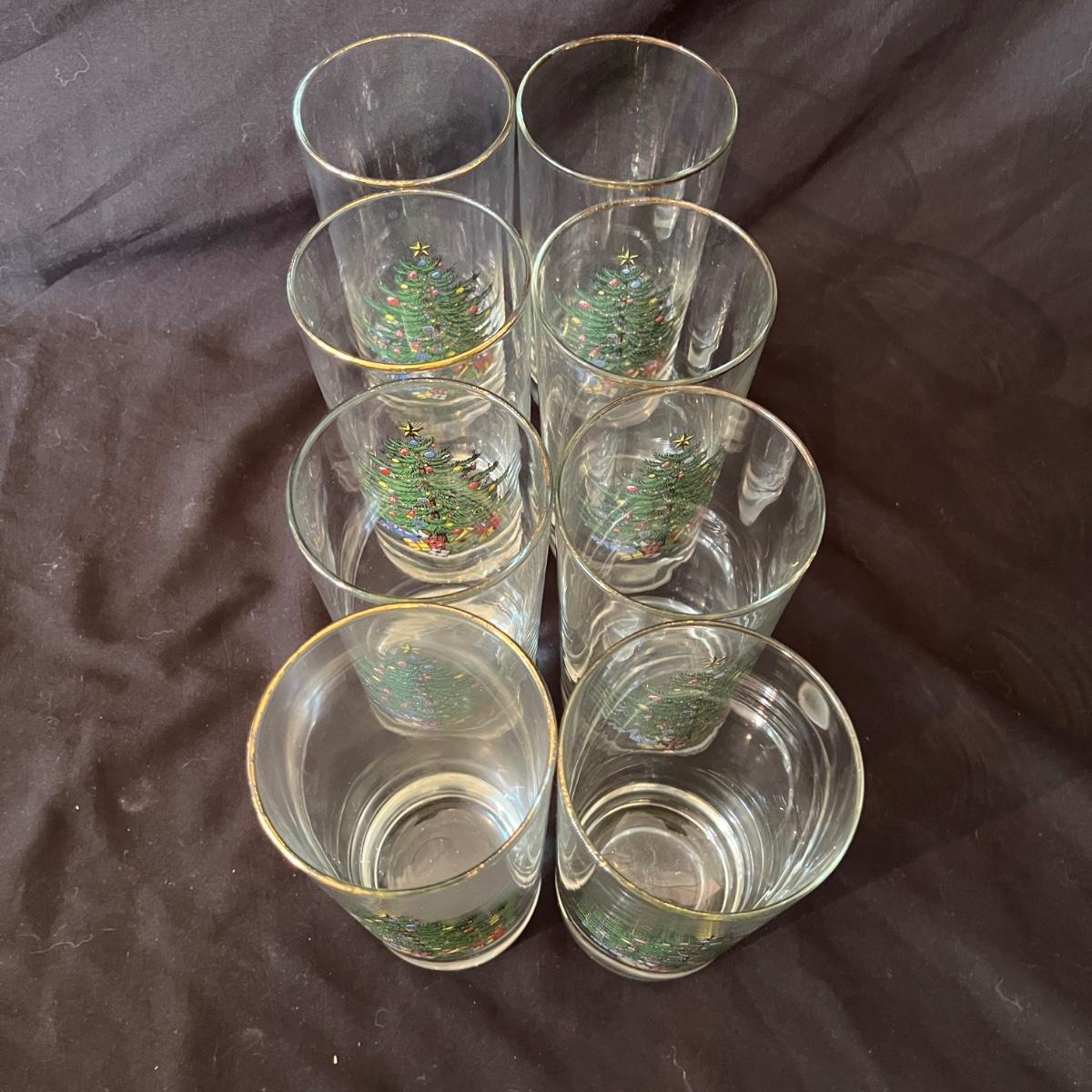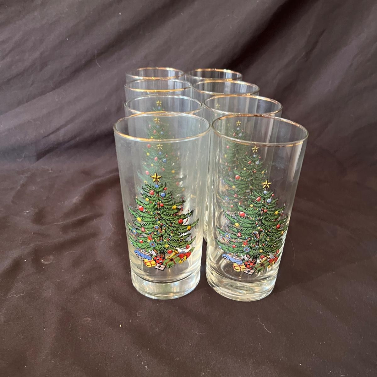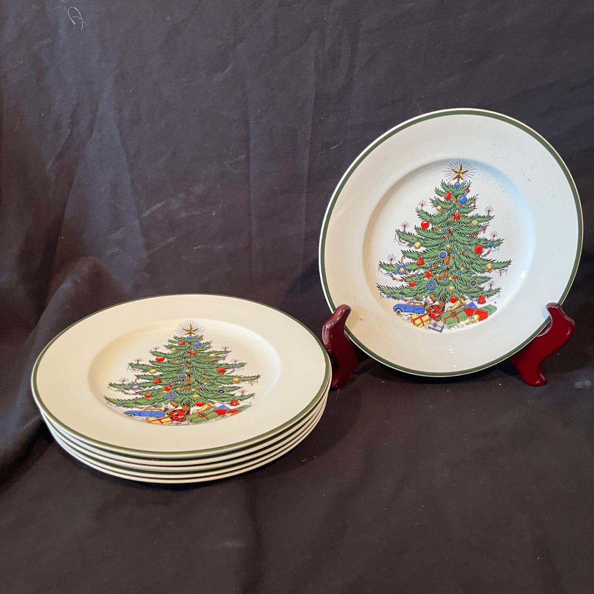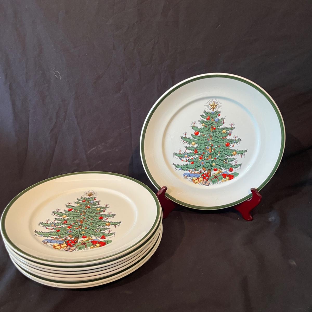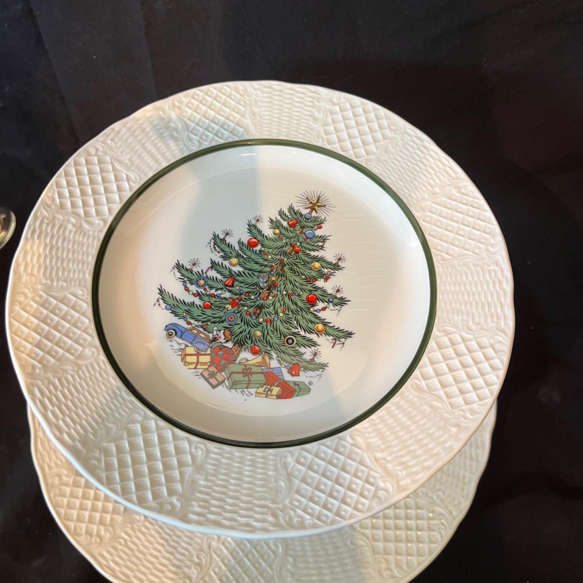 This Cuthbertson set of dishes includes salt and pepper shakers, 12 glasses, six small plates, six medium plates, six teacups, eight dinner plates, two small serving plates, tiered tray and more. Dinner plates measure 10”D. Some overall crazing. Please see photos for details. Plate stand is not included in lot.