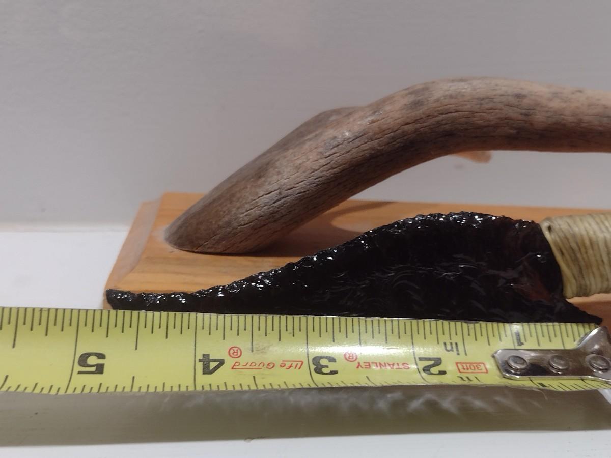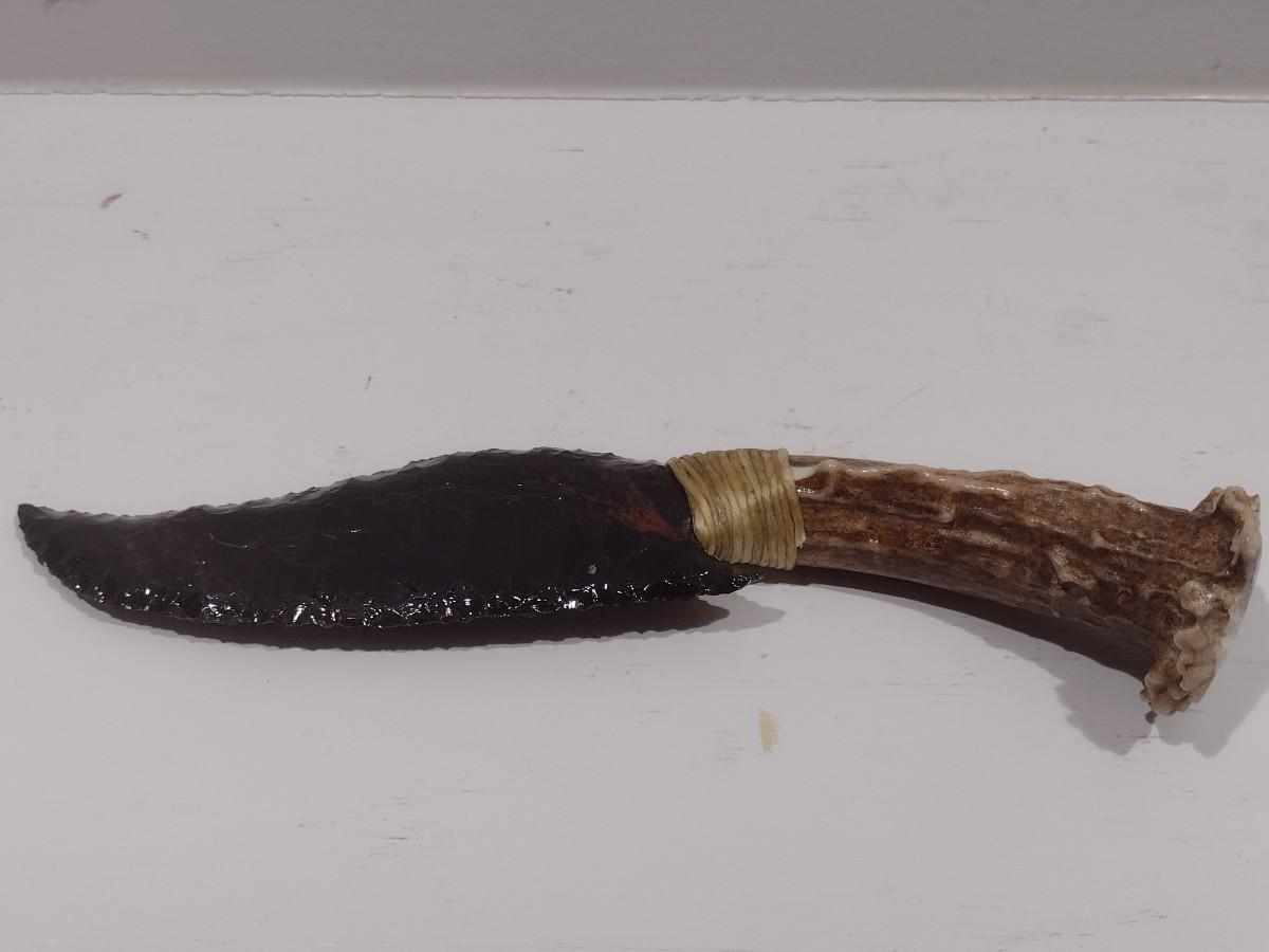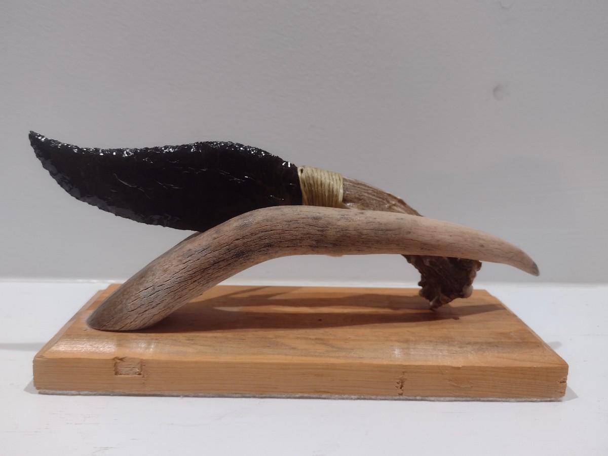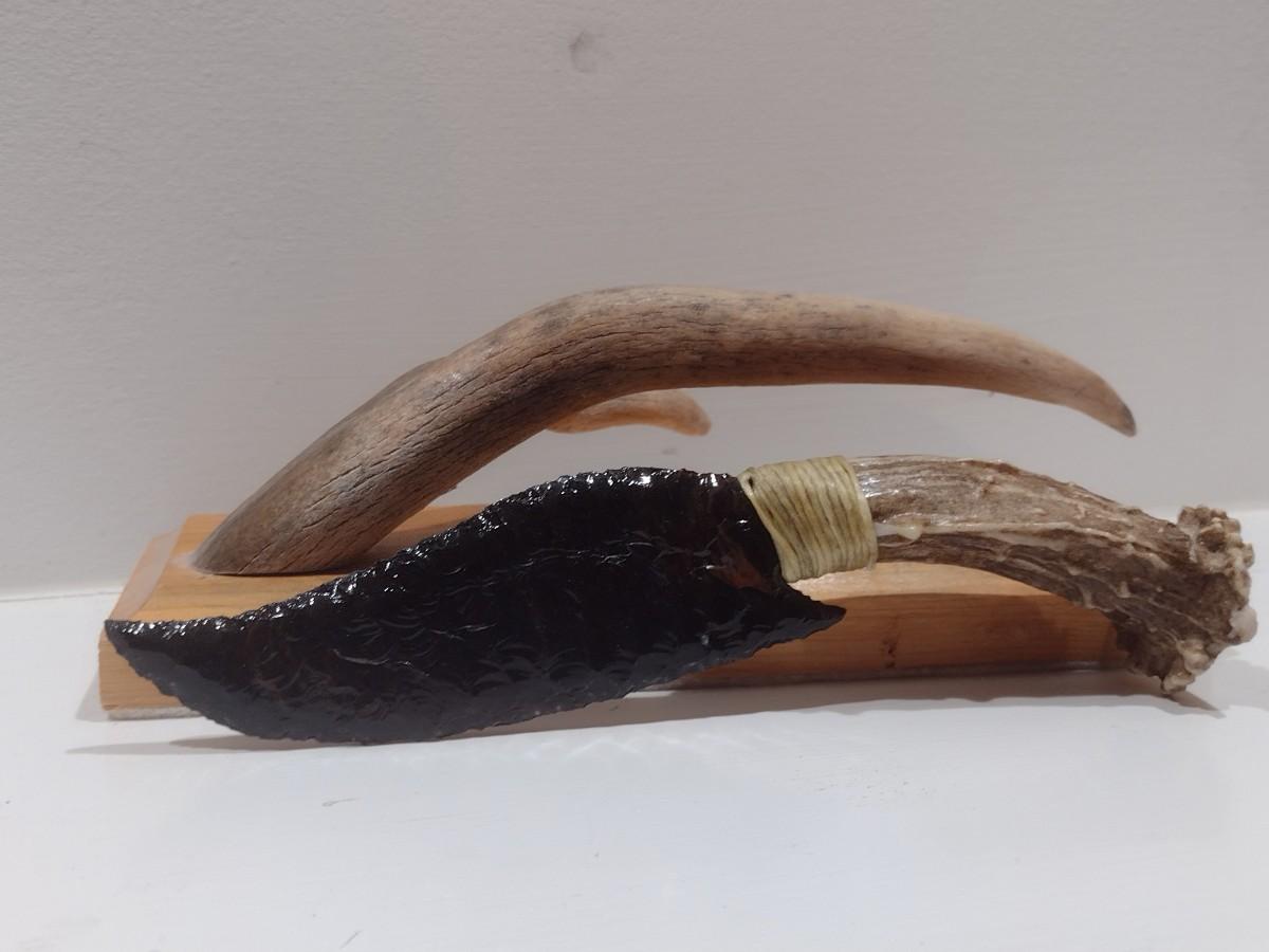 Banded Obsidian Hunter Cutlery with Deer Antler Handle and Display