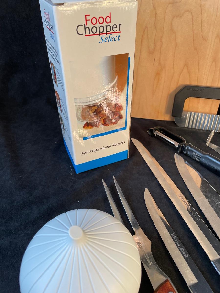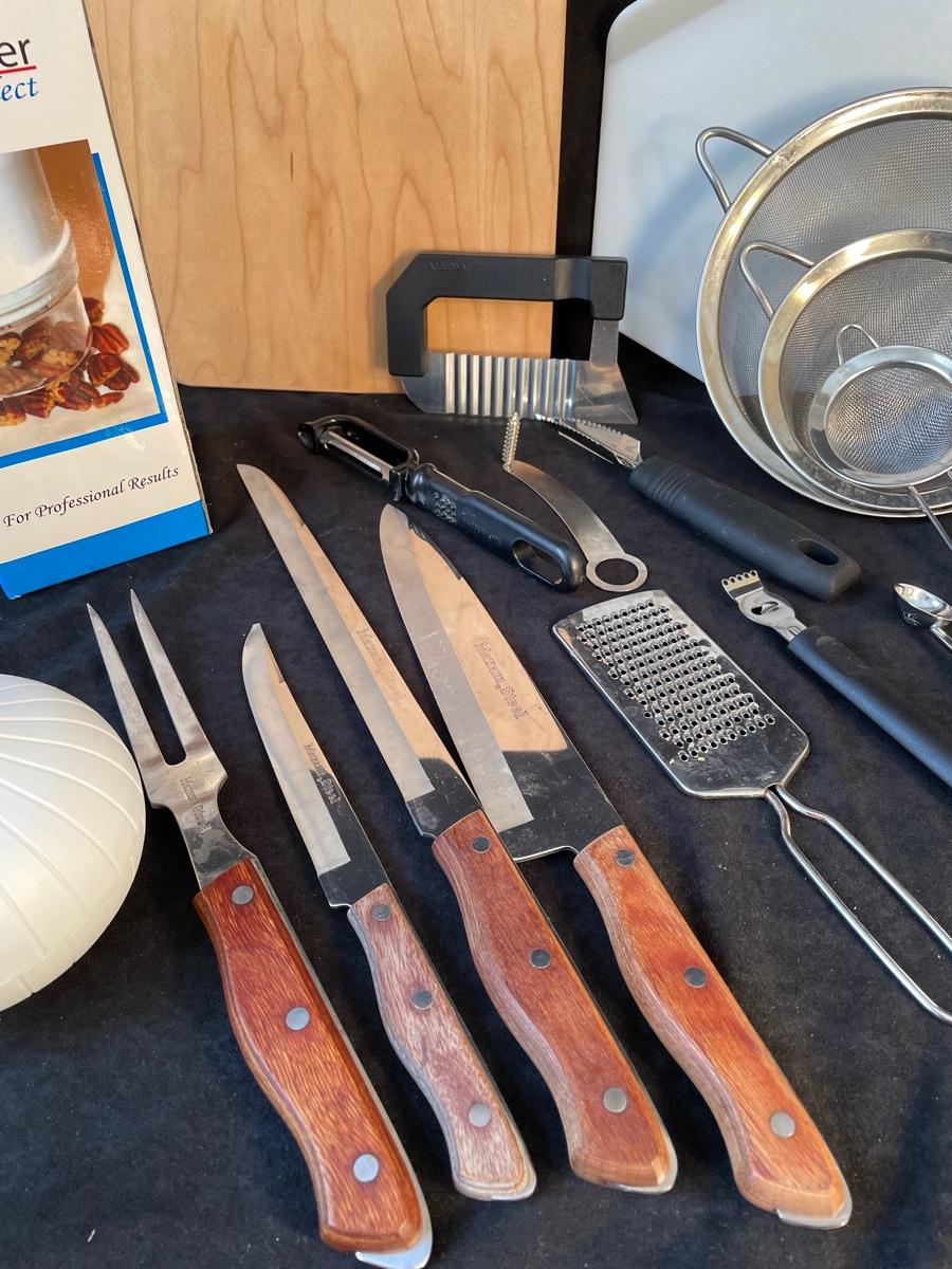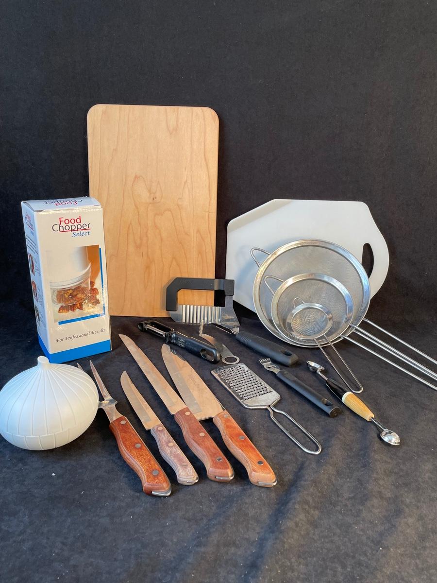 Two cutting boards, food chopper, knife set, onion keeper, assorted utensils and set of 3 strainers