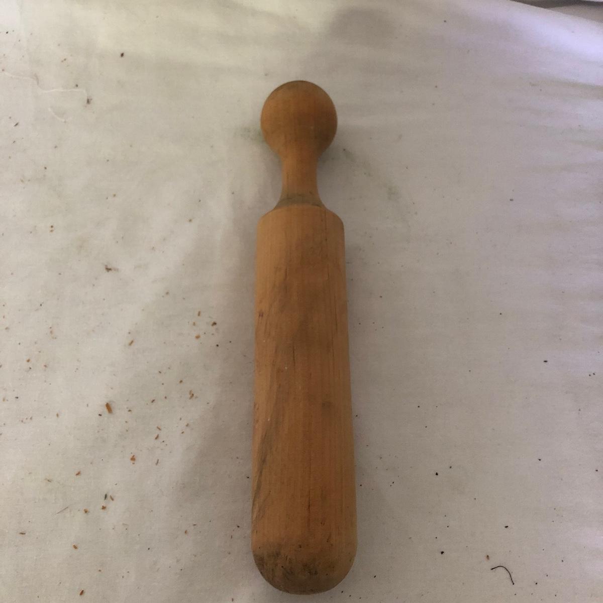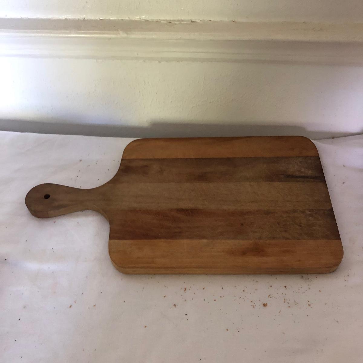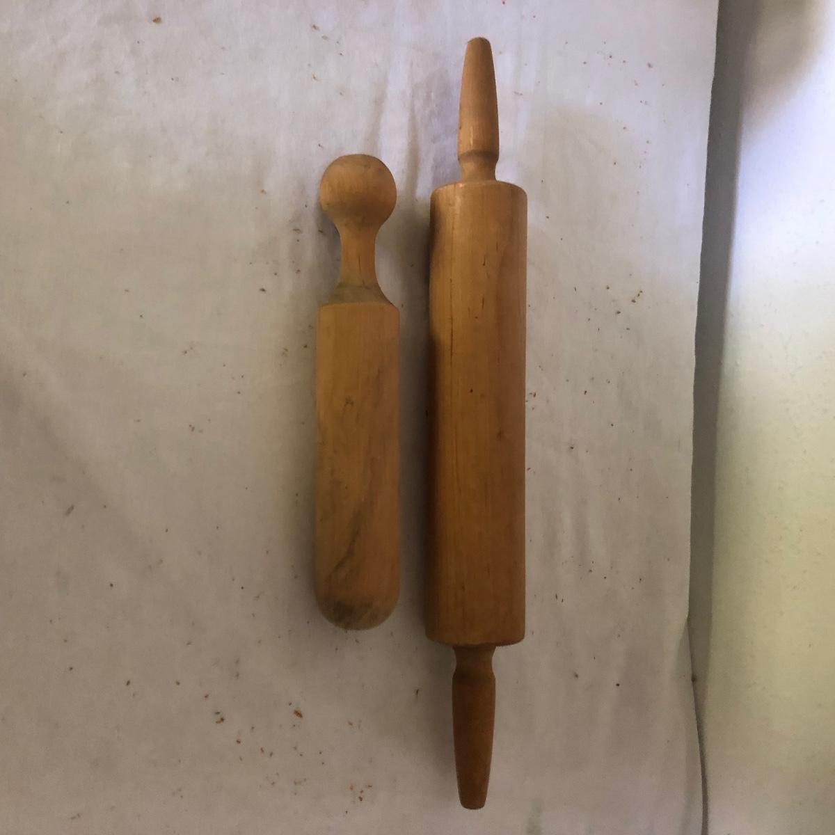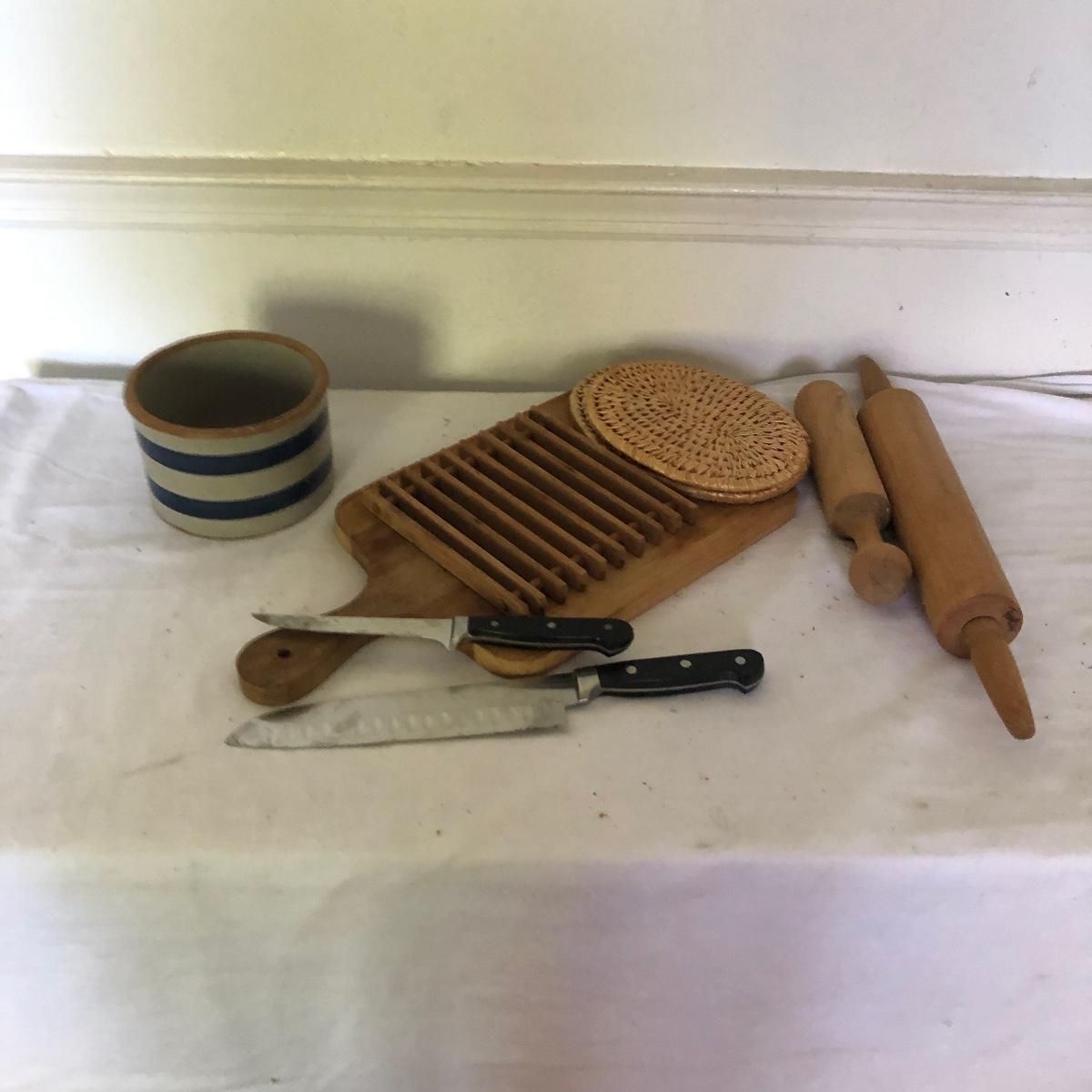 Lot includes wooden cutting board, rolling pin and muddler, pottery bowl, Santoku knife, unmarked knife, two woven mats and a wooden slatted board. Cutting board measures 9” x 18”. Shipping Available