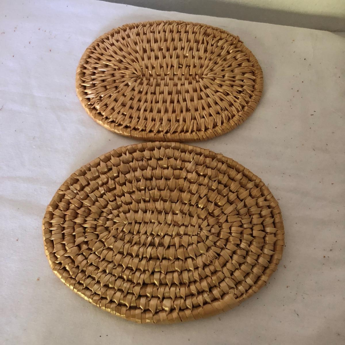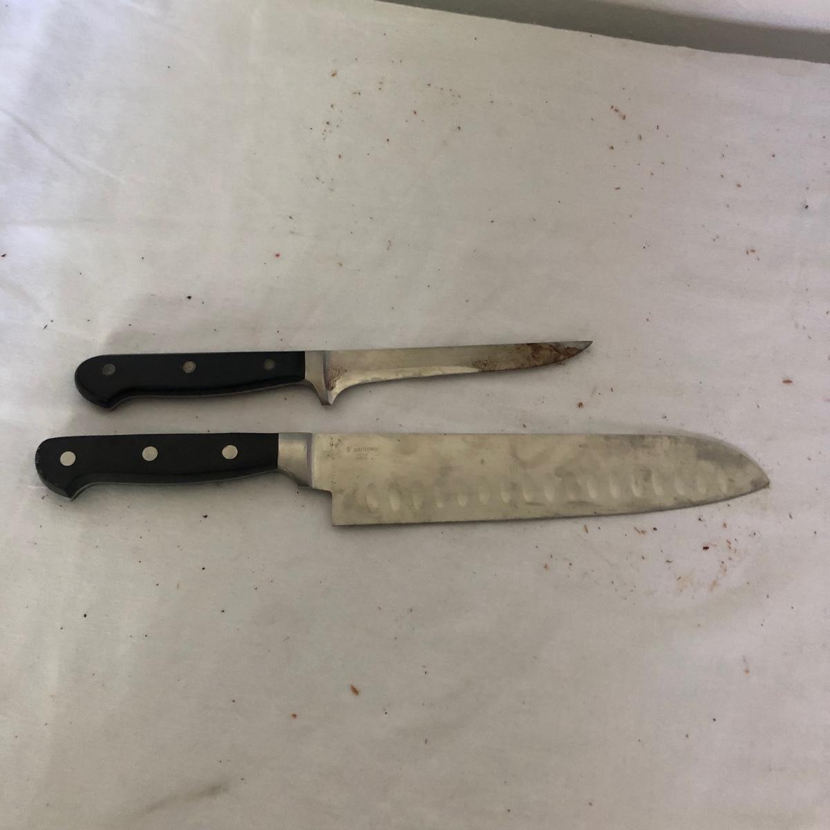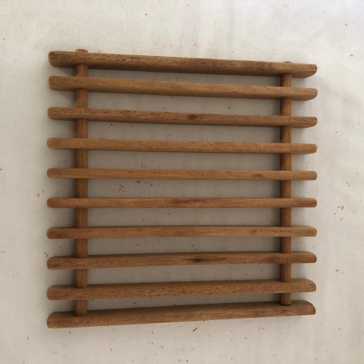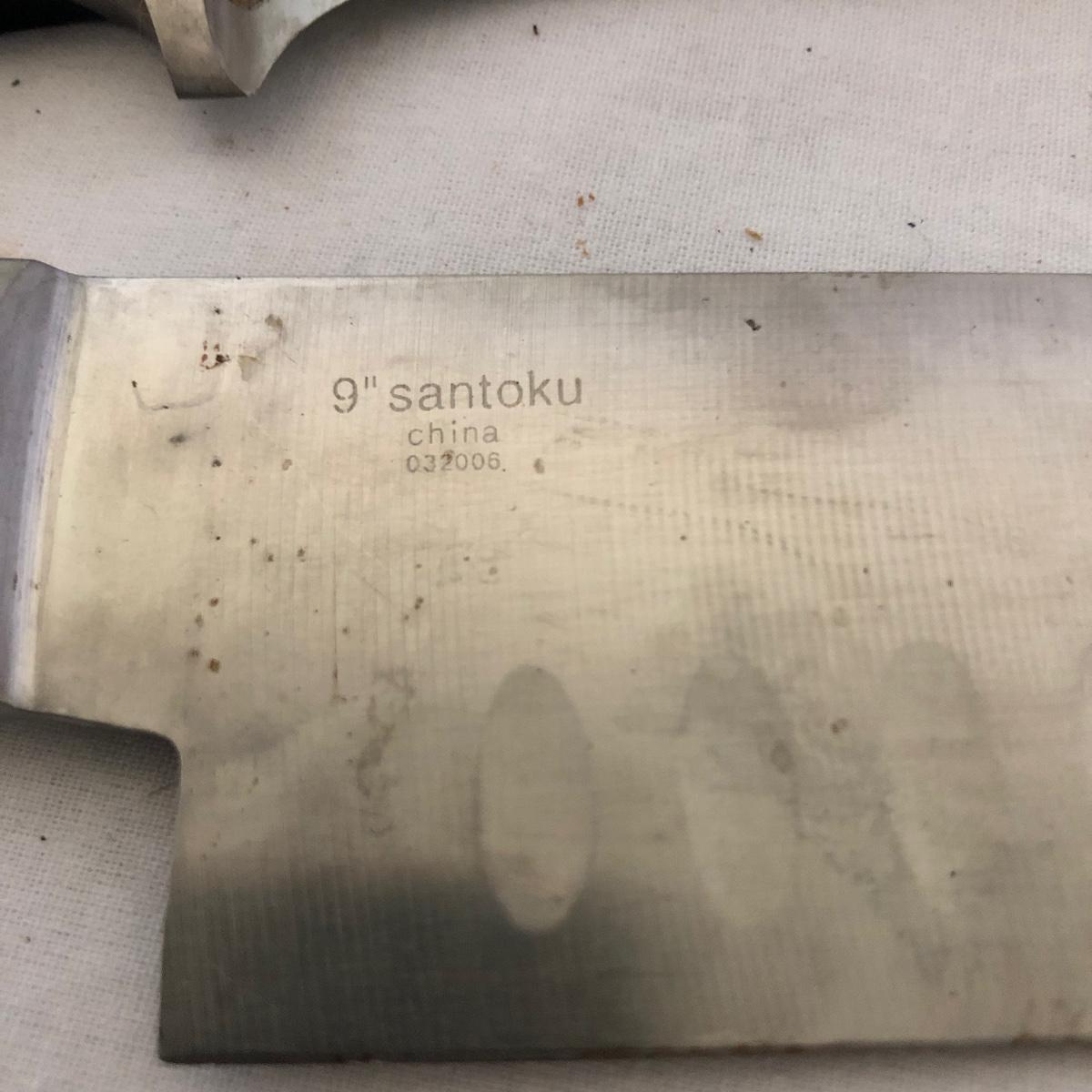 Lot includes wooden cutting board, rolling pin and muddler, pottery bowl, Santoku knife, unmarked knife, two woven mats and a wooden slatted board. Cutting board measures 9” x 18”. Shipping Available