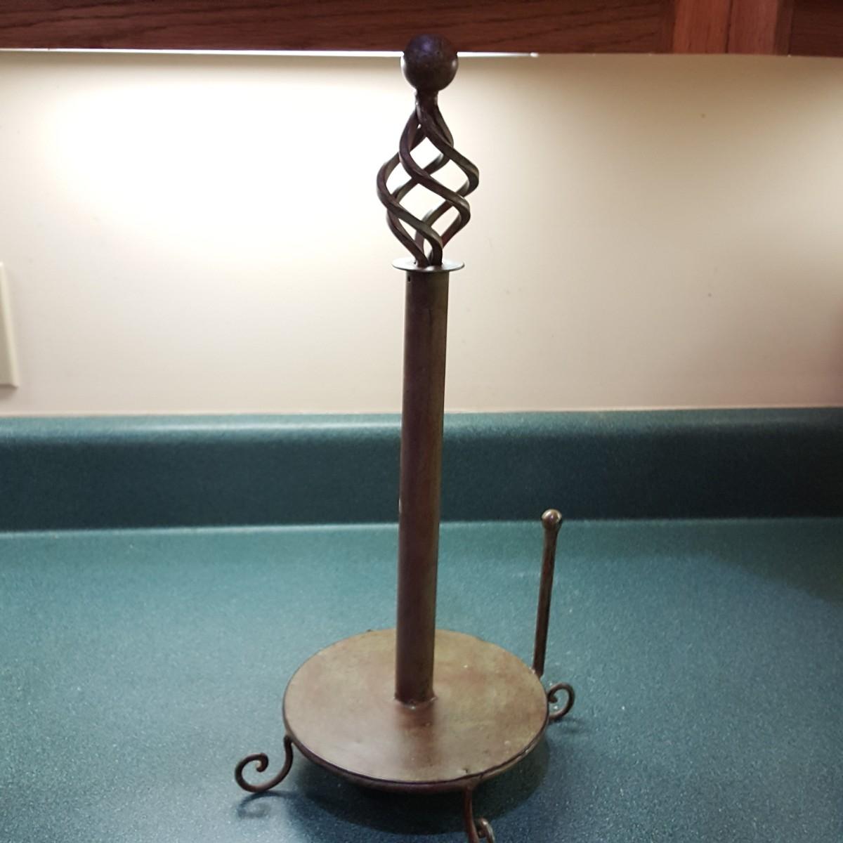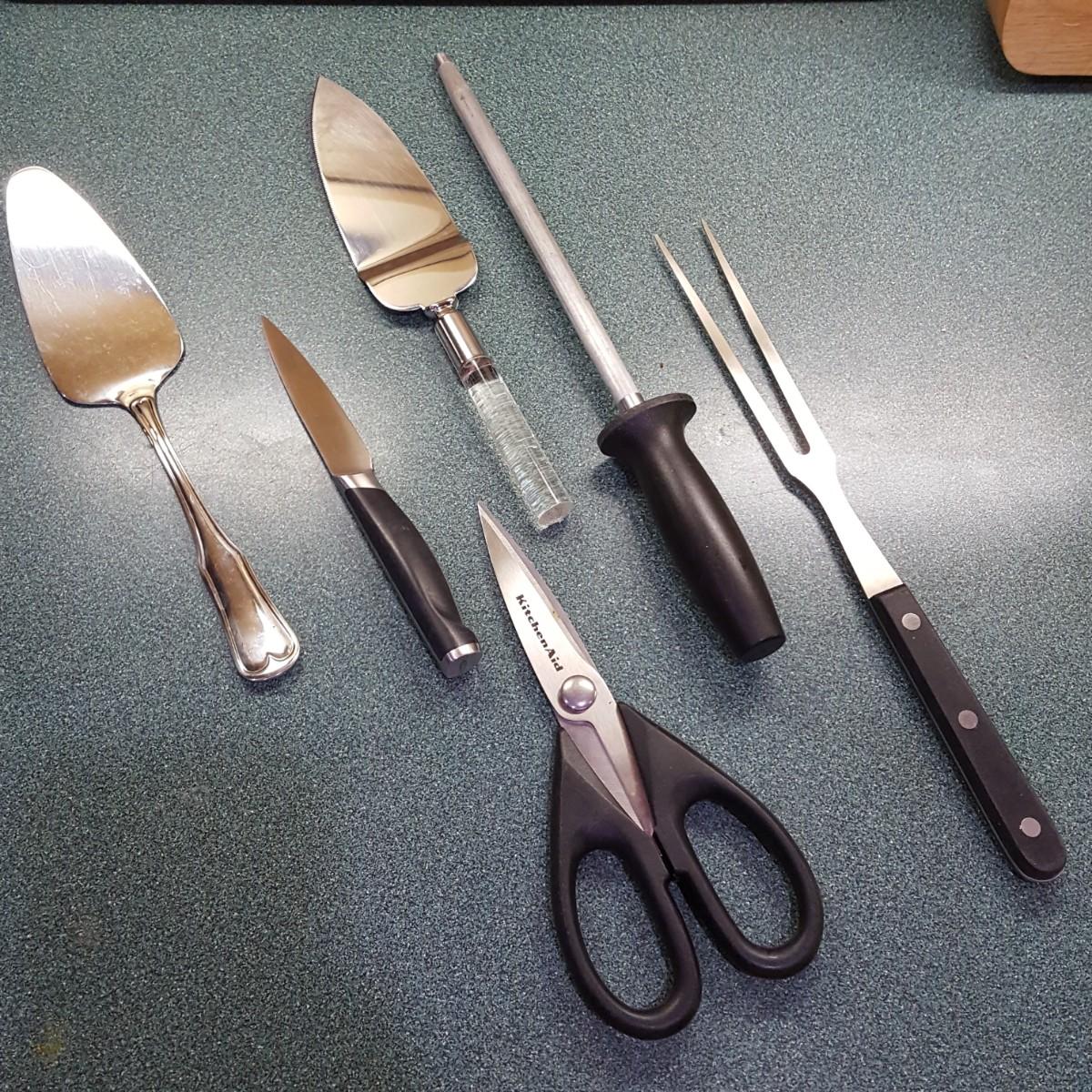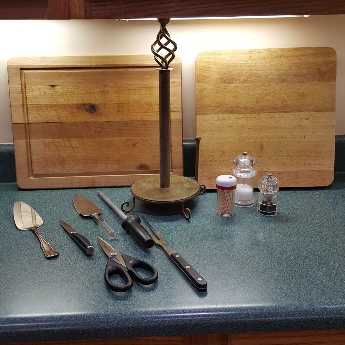 Here we have a decorative metal 9"d x 18" paper towel holder. A thick wooden 14"sq x 3" cutting board and a thin wooden 14" x 18" x 1" cutting board. Lot offers six various serving utensils featuring a pairing knife by OXO , Kitchen Aid scissors, a sharpening knife, a 13" meat fork and 2 pie spoons. Lastly, no kitchen is complete without a salt grinder, pepper mill and toothpick dispenser. The cutting boards have been used, see pictures for details. Local pick up only.