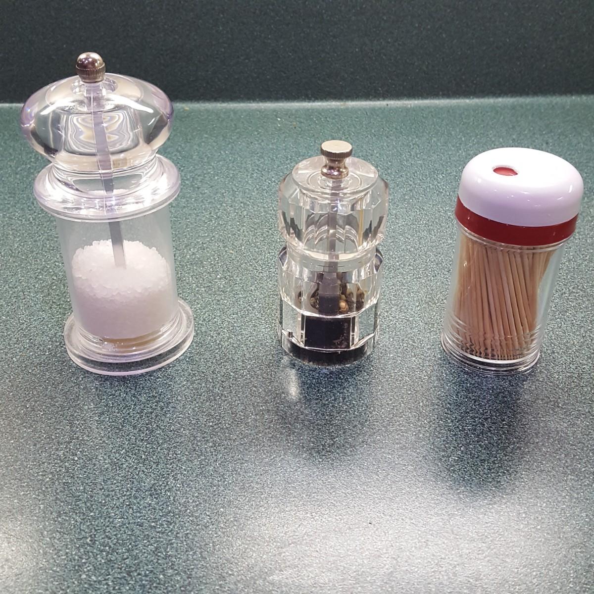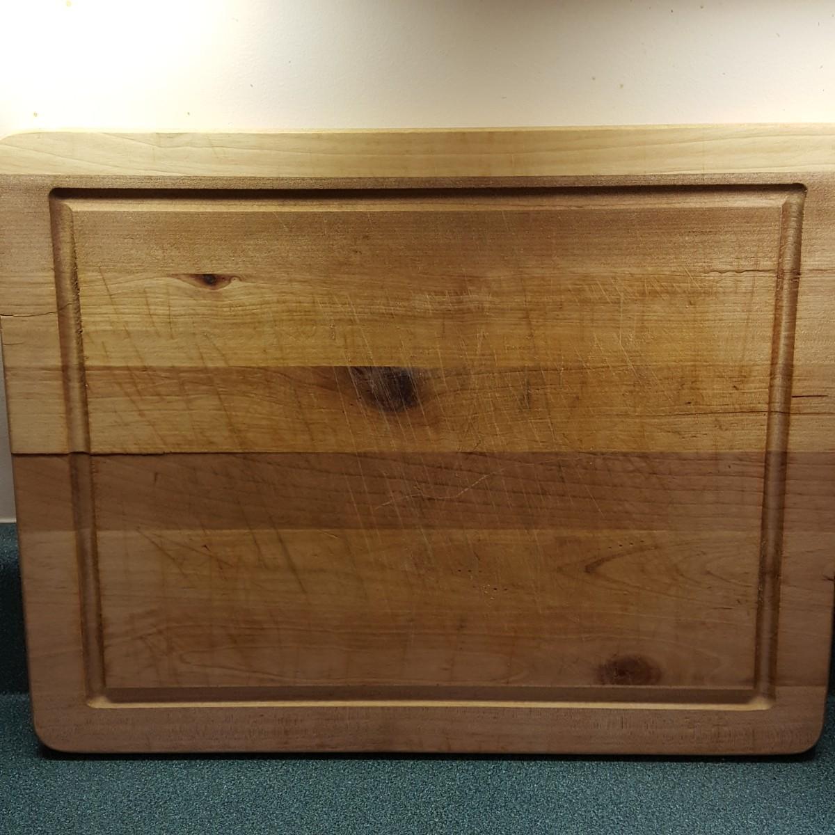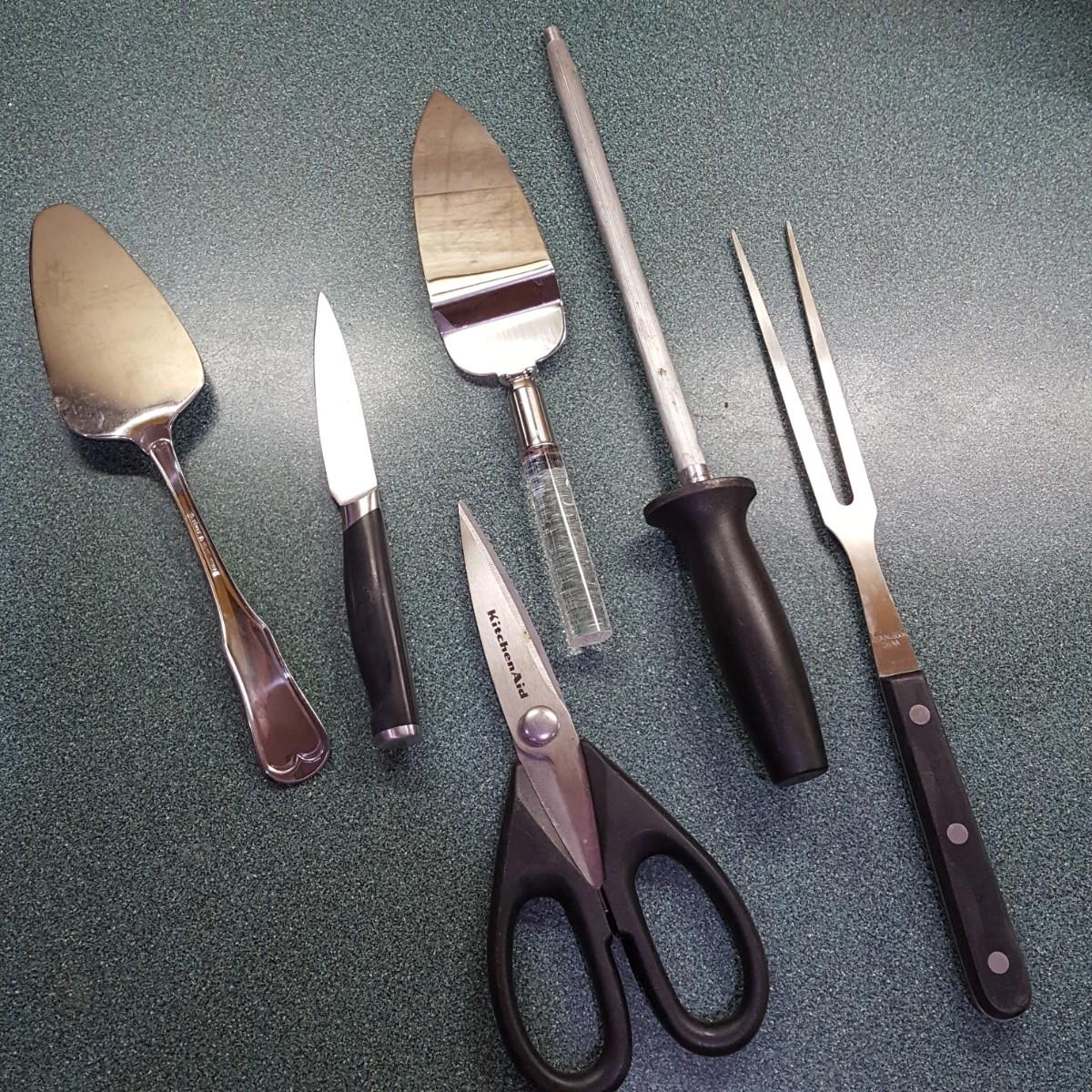 Here we have a decorative metal 9"d x 18" paper towel holder. A thick wooden 14"sq x 3" cutting board and a thin wooden 14" x 18" x 1" cutting board. Lot offers six various serving utensils featuring a pairing knife by OXO , Kitchen Aid scissors, a sharpening knife, a 13" meat fork and 2 pie spoons. Lastly, no kitchen is complete without a salt grinder, pepper mill and toothpick dispenser. The cutting boards have been used, see pictures for details. Local pick up only.