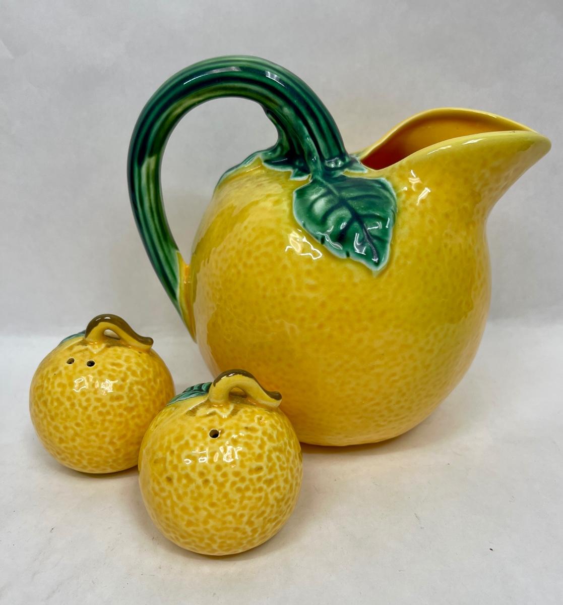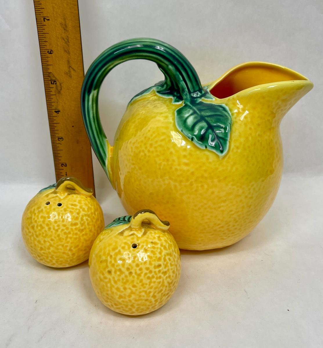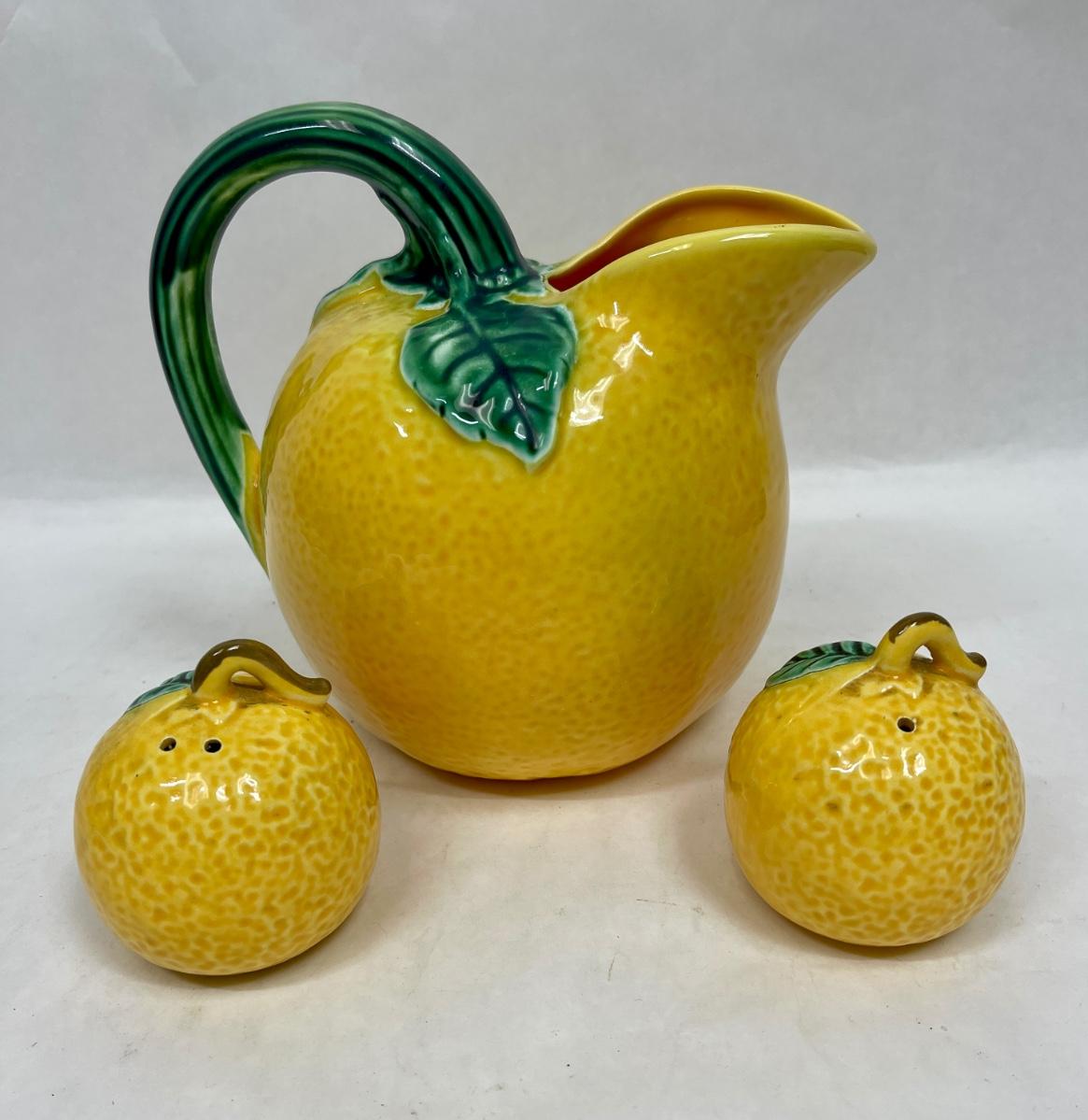 Vintage Majolica Style Large Ceramic Orange Pitcher with Salt and Pepper Shakers With Green Leaf Handle 6.5"