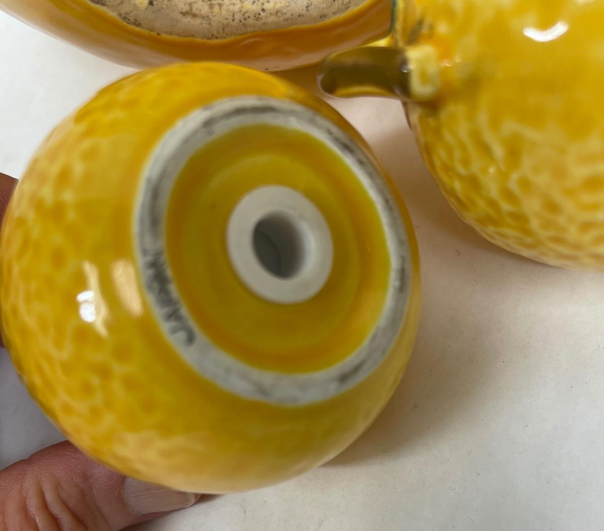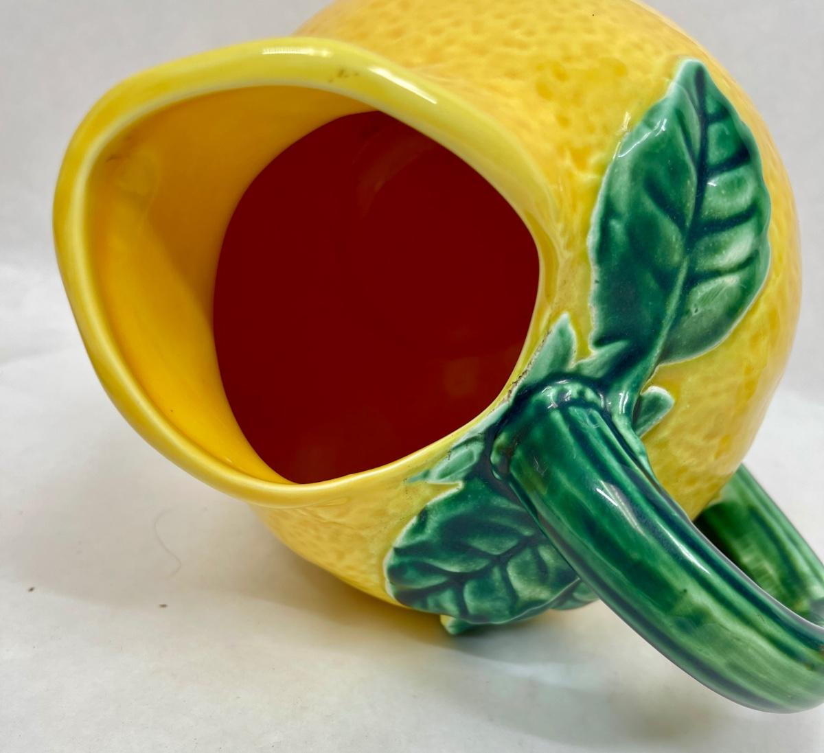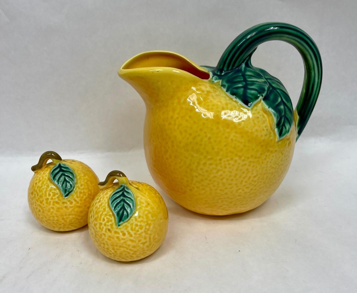 Vintage Majolica Style Large Ceramic Orange Pitcher with Salt and Pepper Shakers With Green Leaf Handle 6.5"