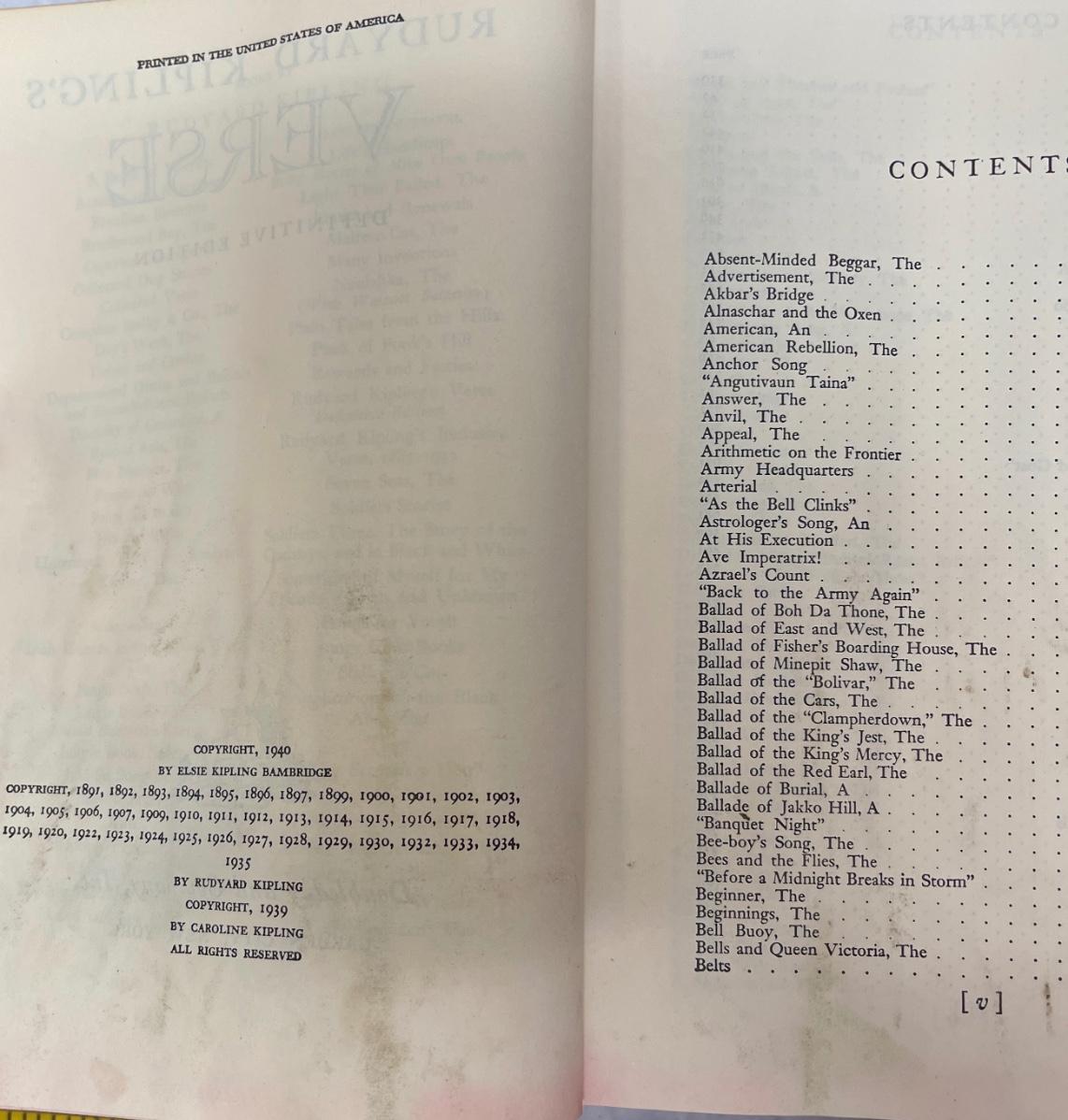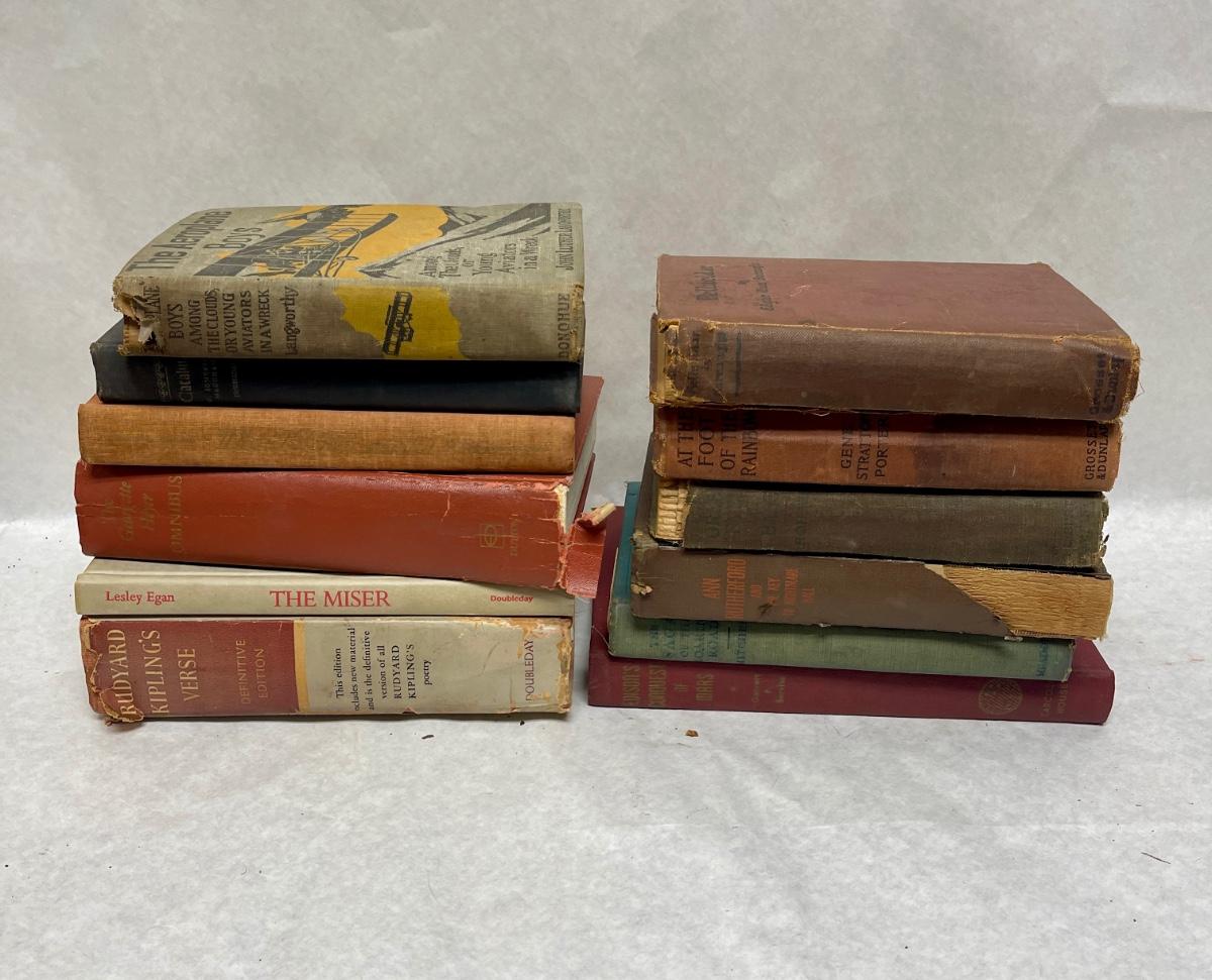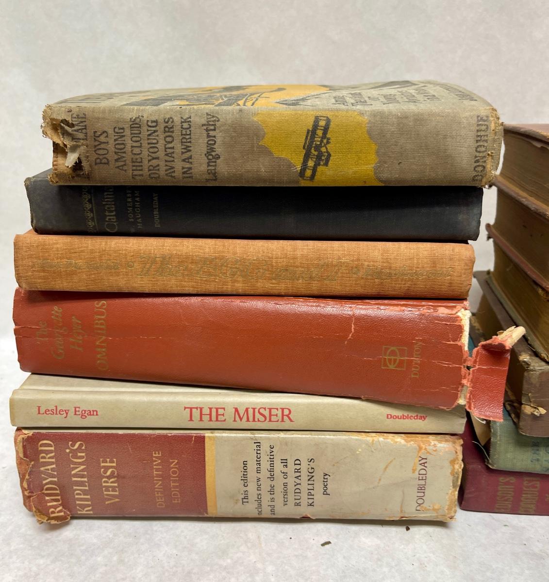Includes titles: The Aeroplane Boys by Langworthy (1912), Rudyard Kipling's Verse - The Definitive Edition (1940), The Egg and I by MacDonald (1945), Catalina - A Romance by Maughan (1948), and many others. Some have cover and/or spine damage, see photos.