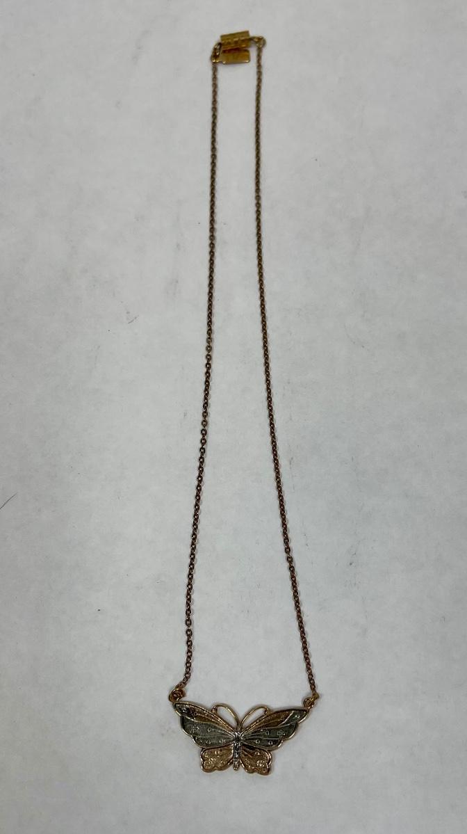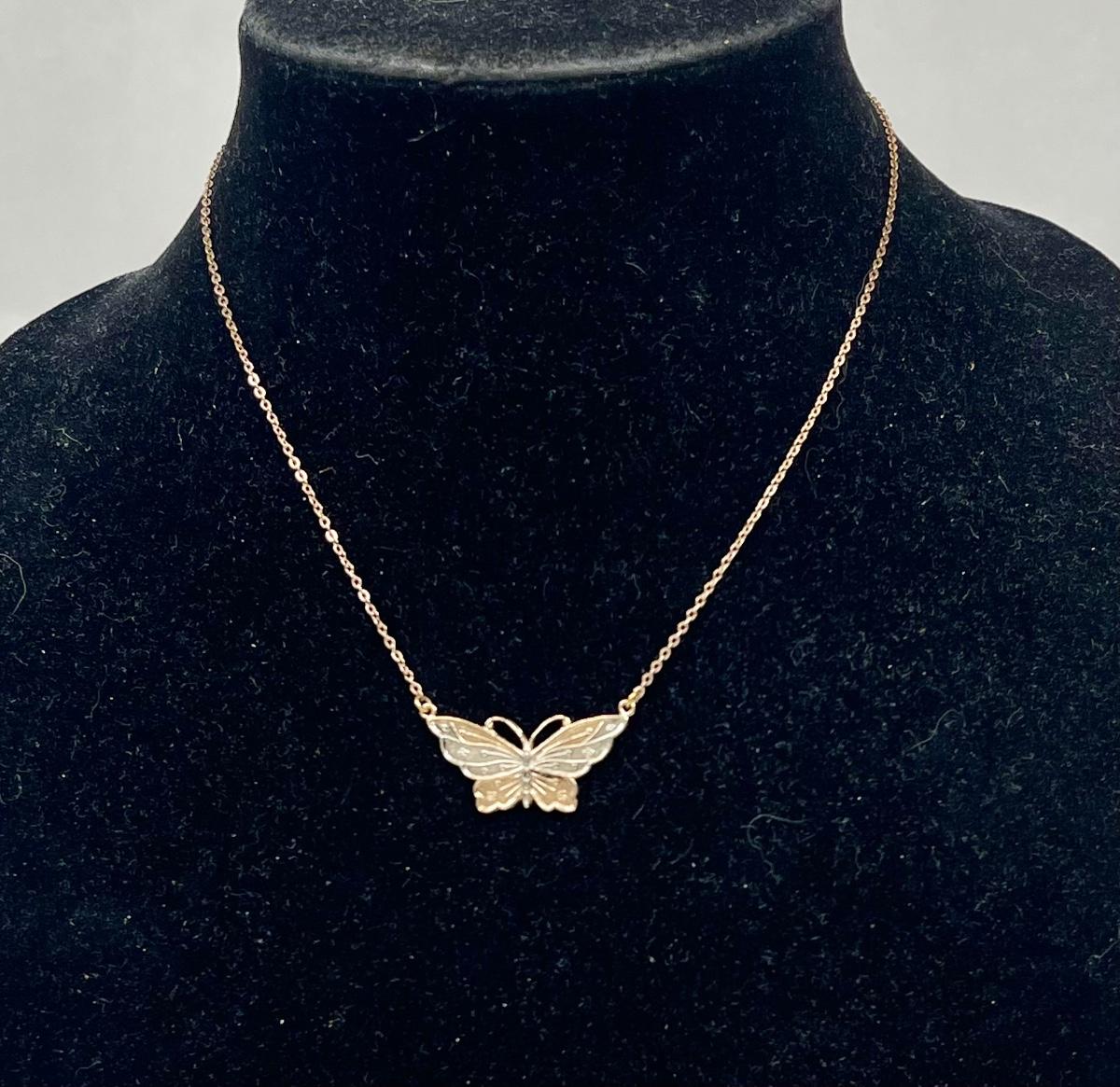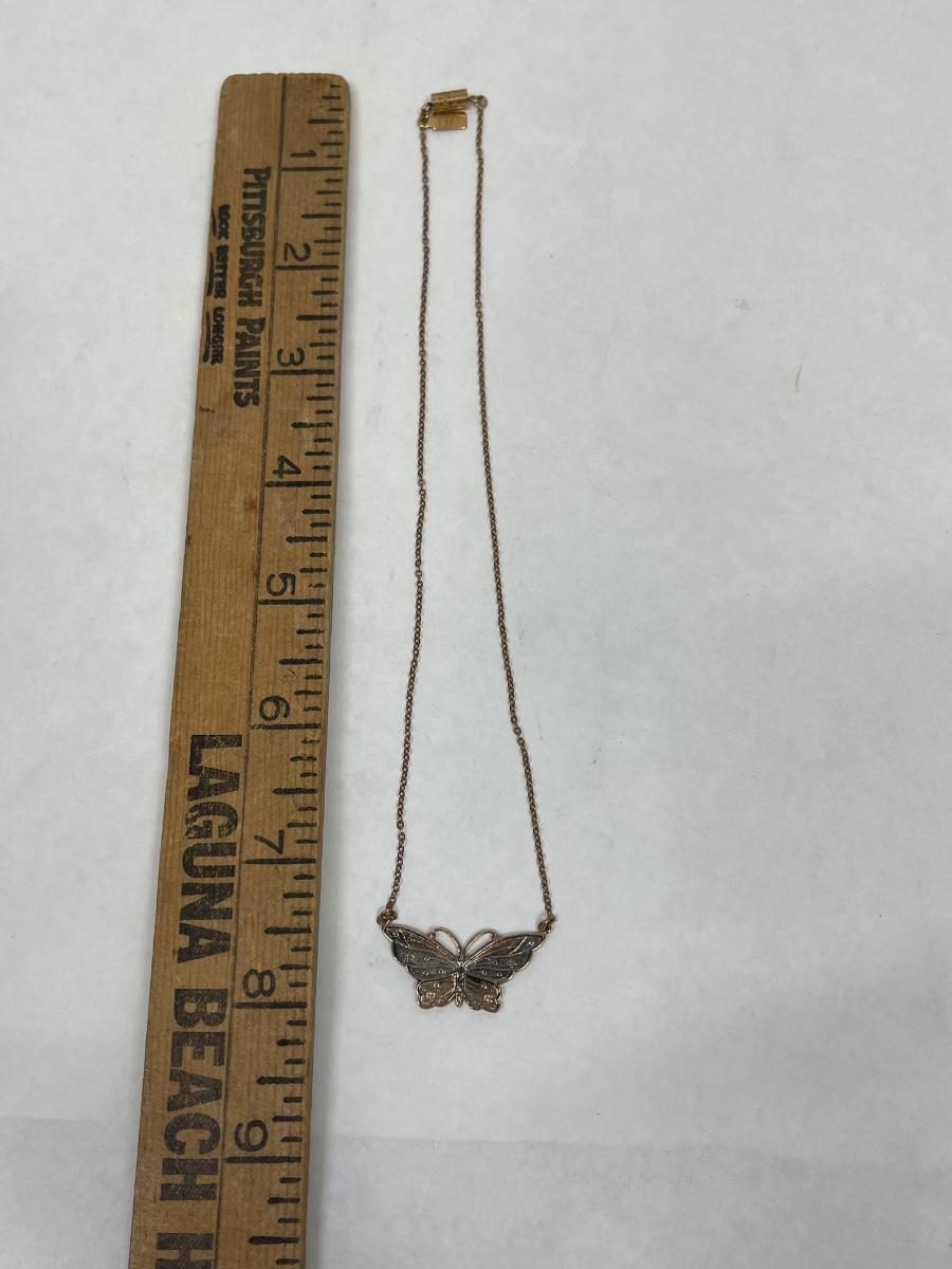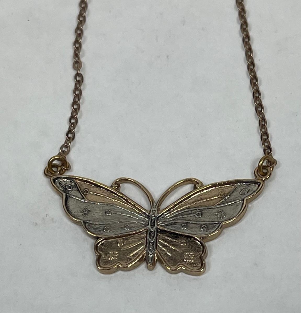 Costume jewelry necklace with butterfly pendant. Approx. 16" long, good condition.