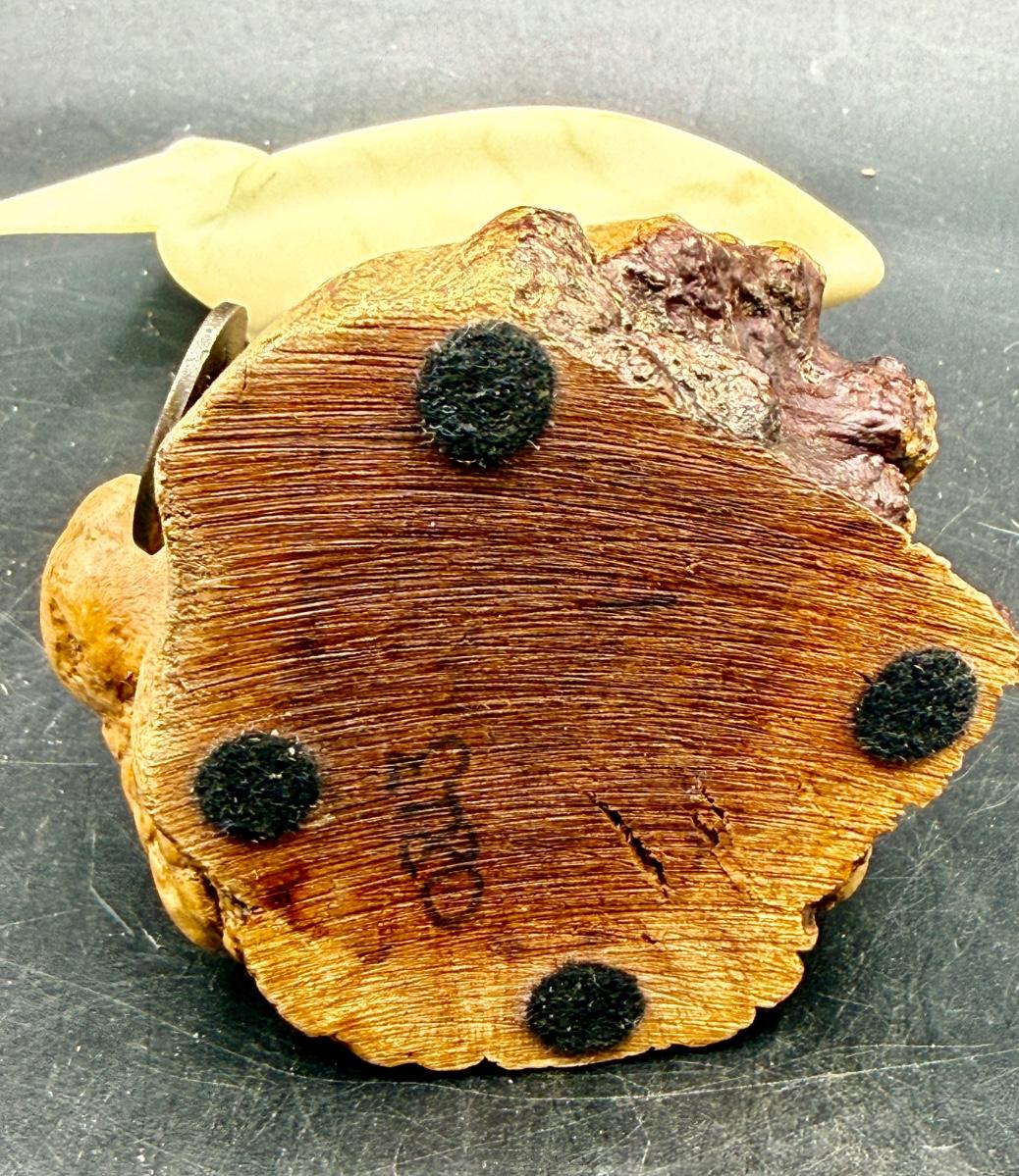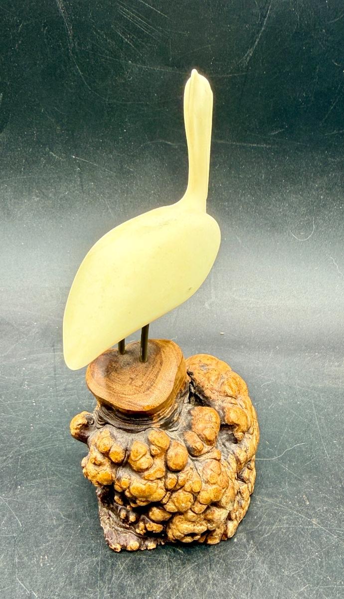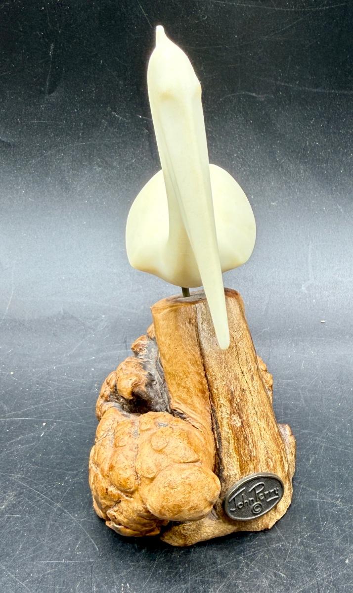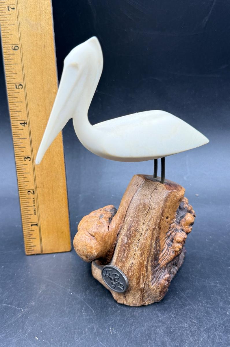 Vintage John Perry pelican sculpture made of Pellucida resin mounted on a natural burlwood base. Approx. 7" tall.