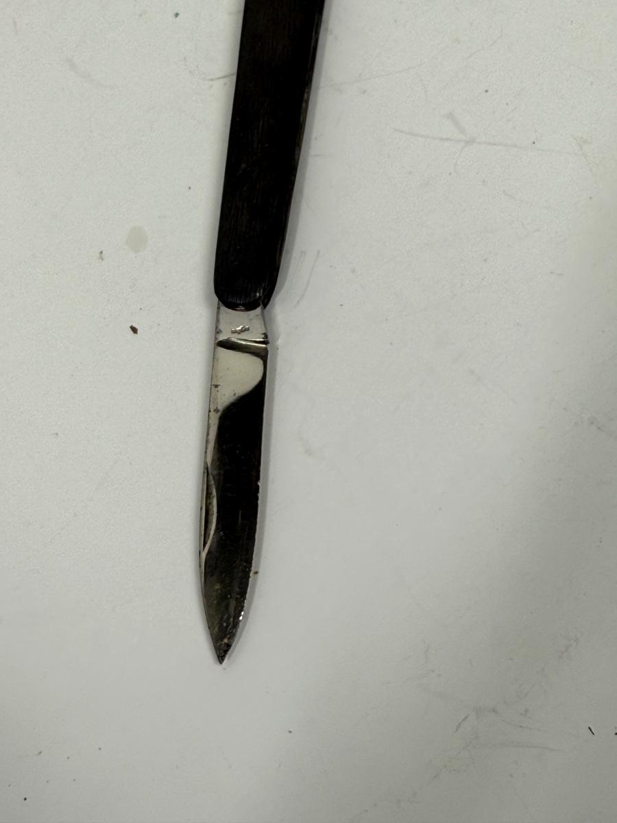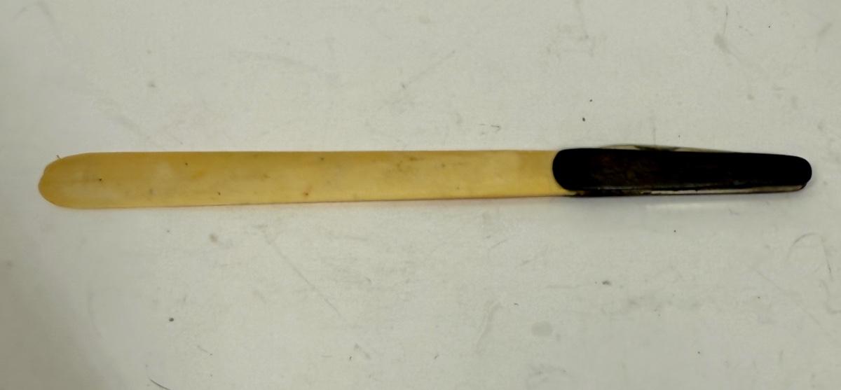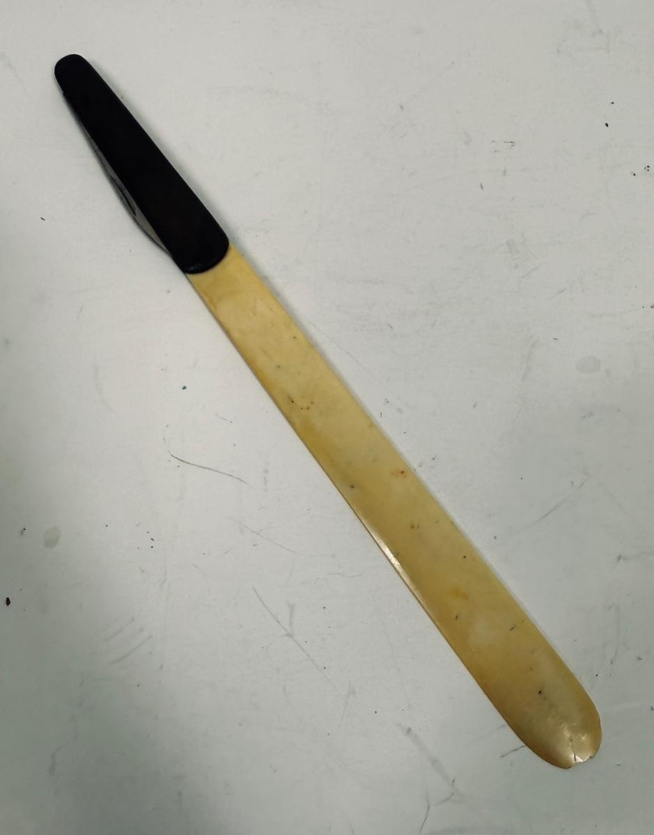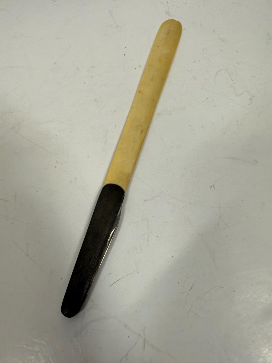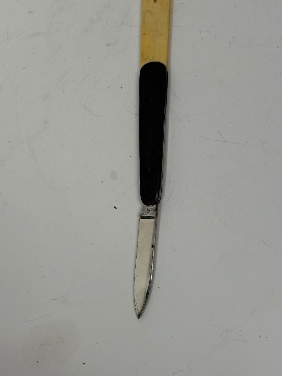 Approx. 10" long. Plastic letter opener blade permanently attached to a folding pocket knife. Folded knife acts as a handle for the letter opener, an knife can be opened and used to cut open boxes. Good condition.