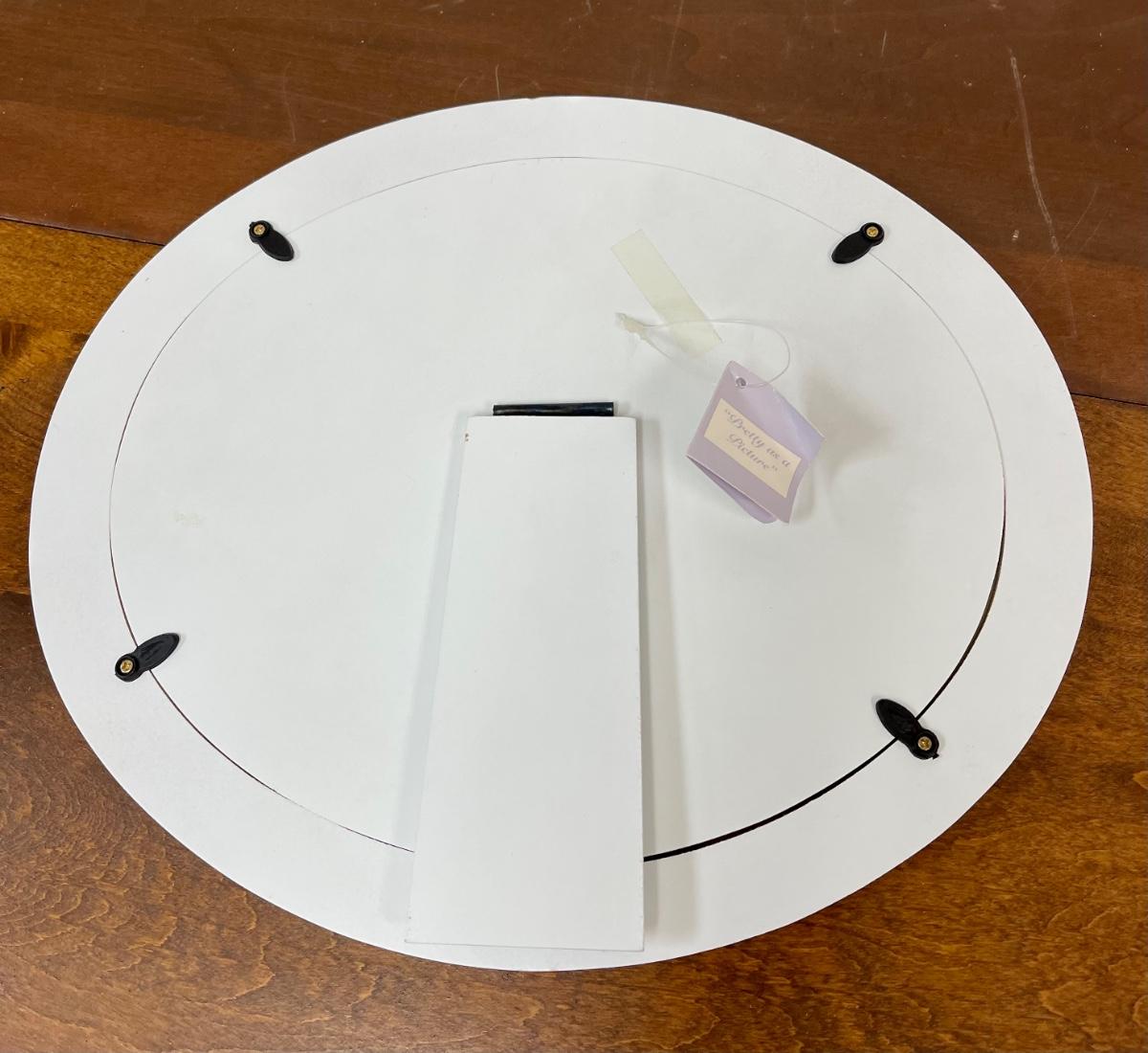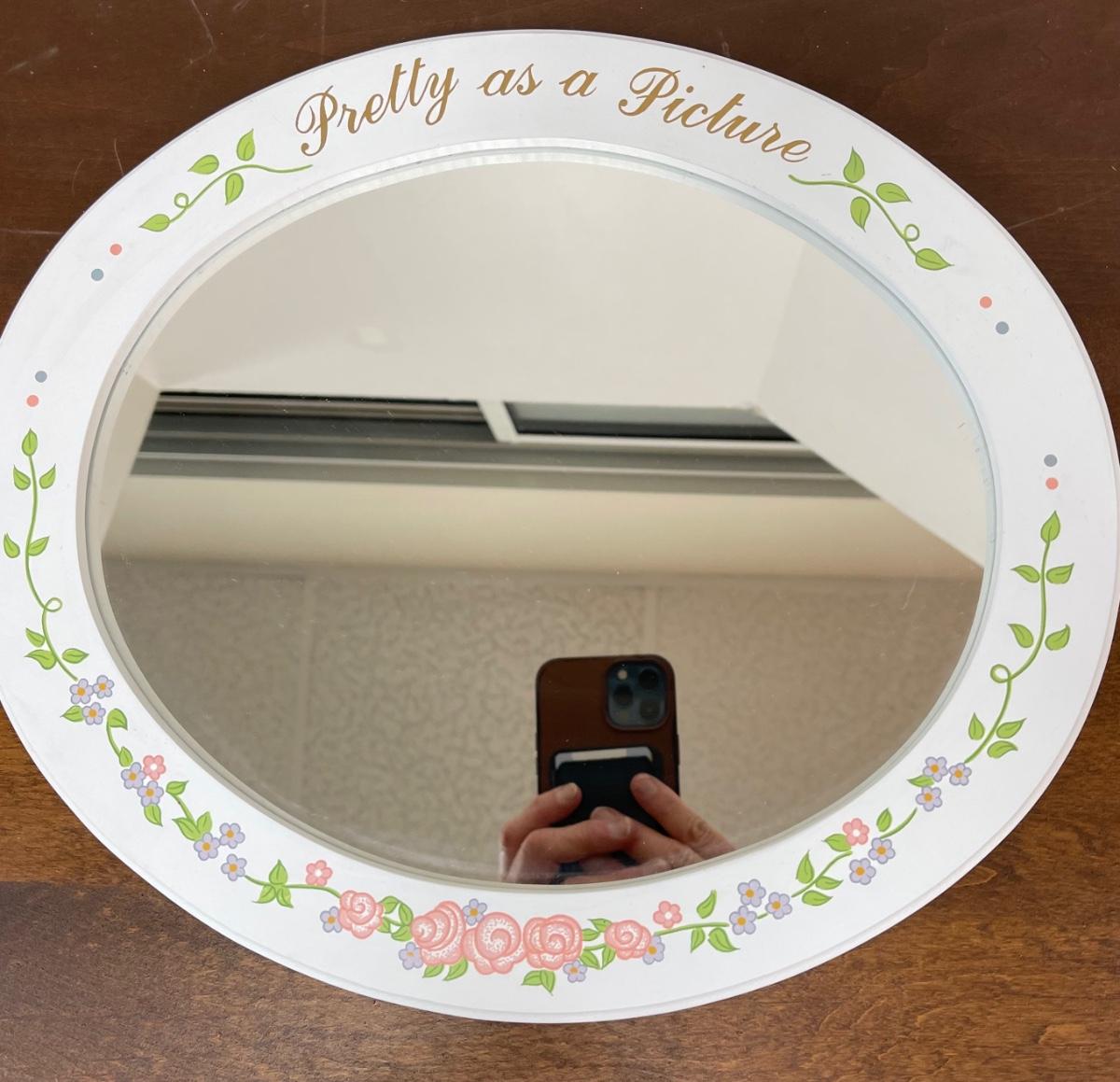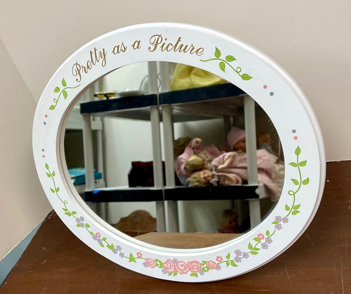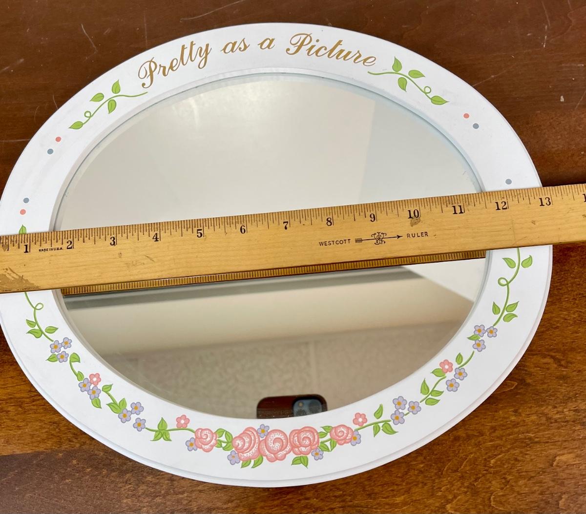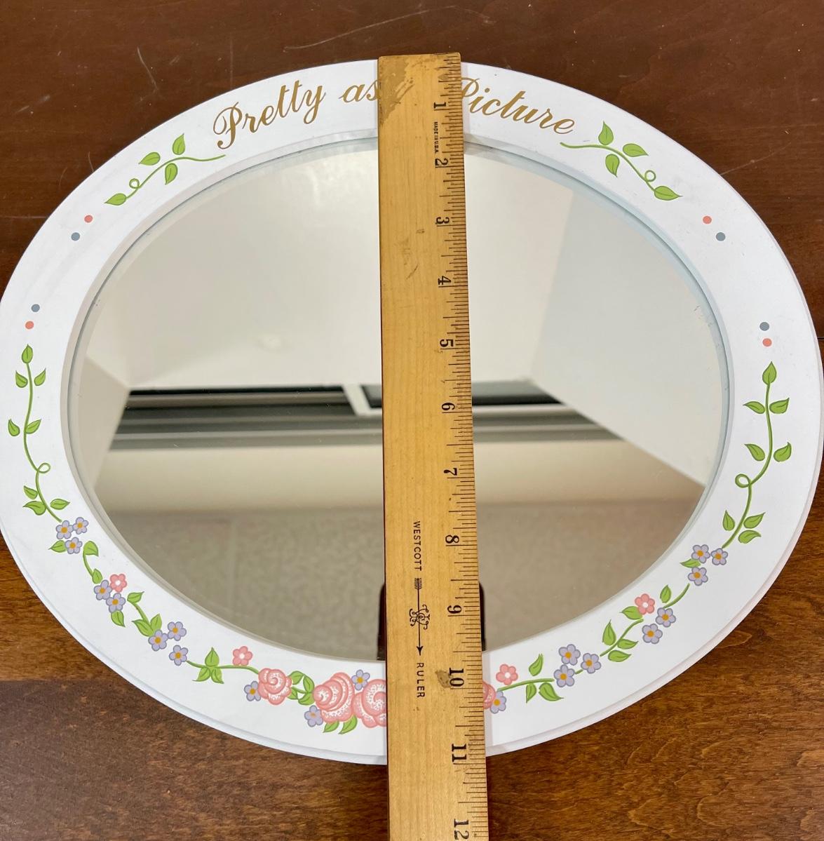 Pretty as a Picture Table Sitting Mirror Shabby Chic Cottagecore White with Flowers. Oval mirror, in good condition. Made for sitting on surface.