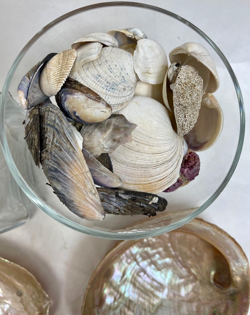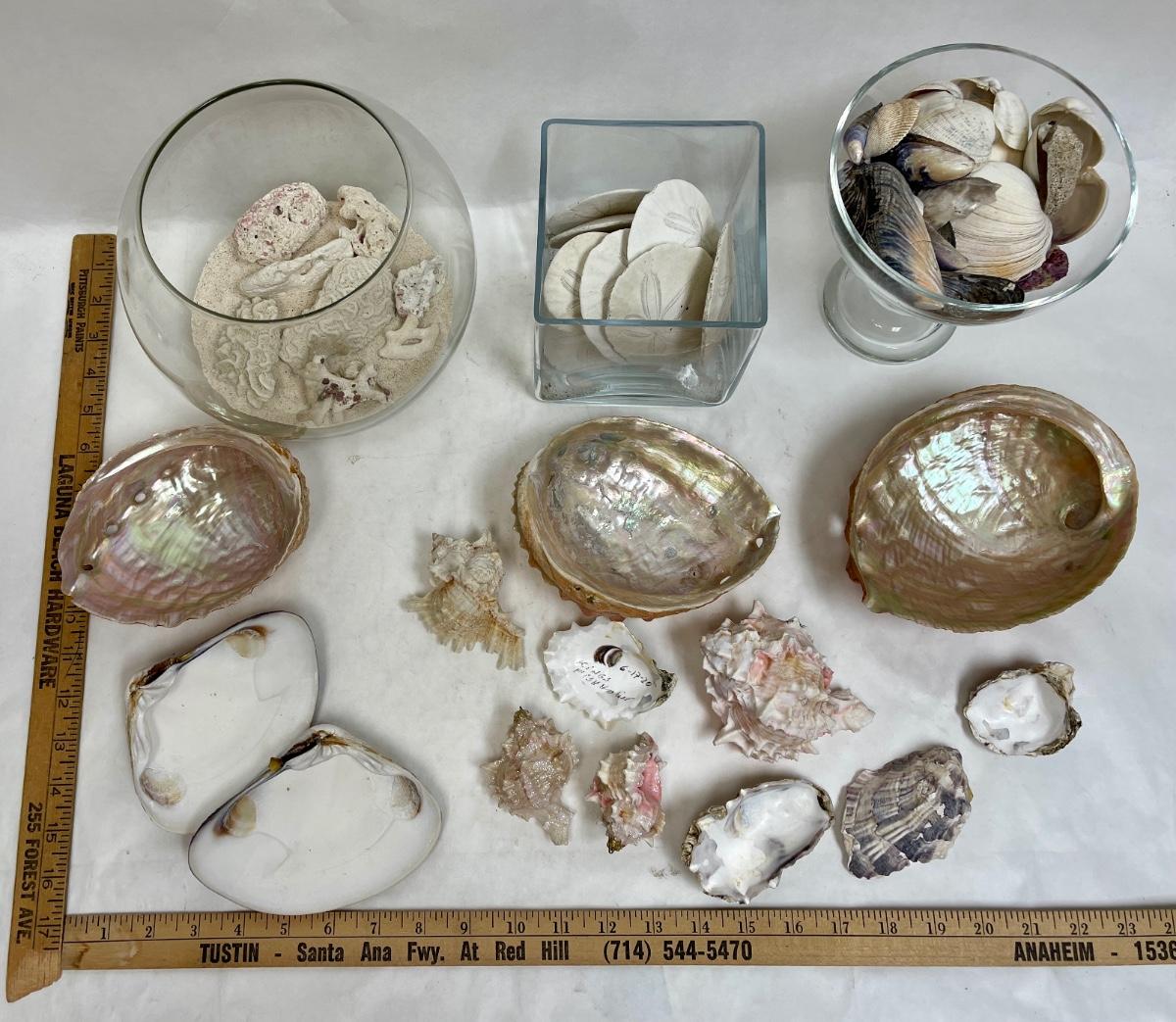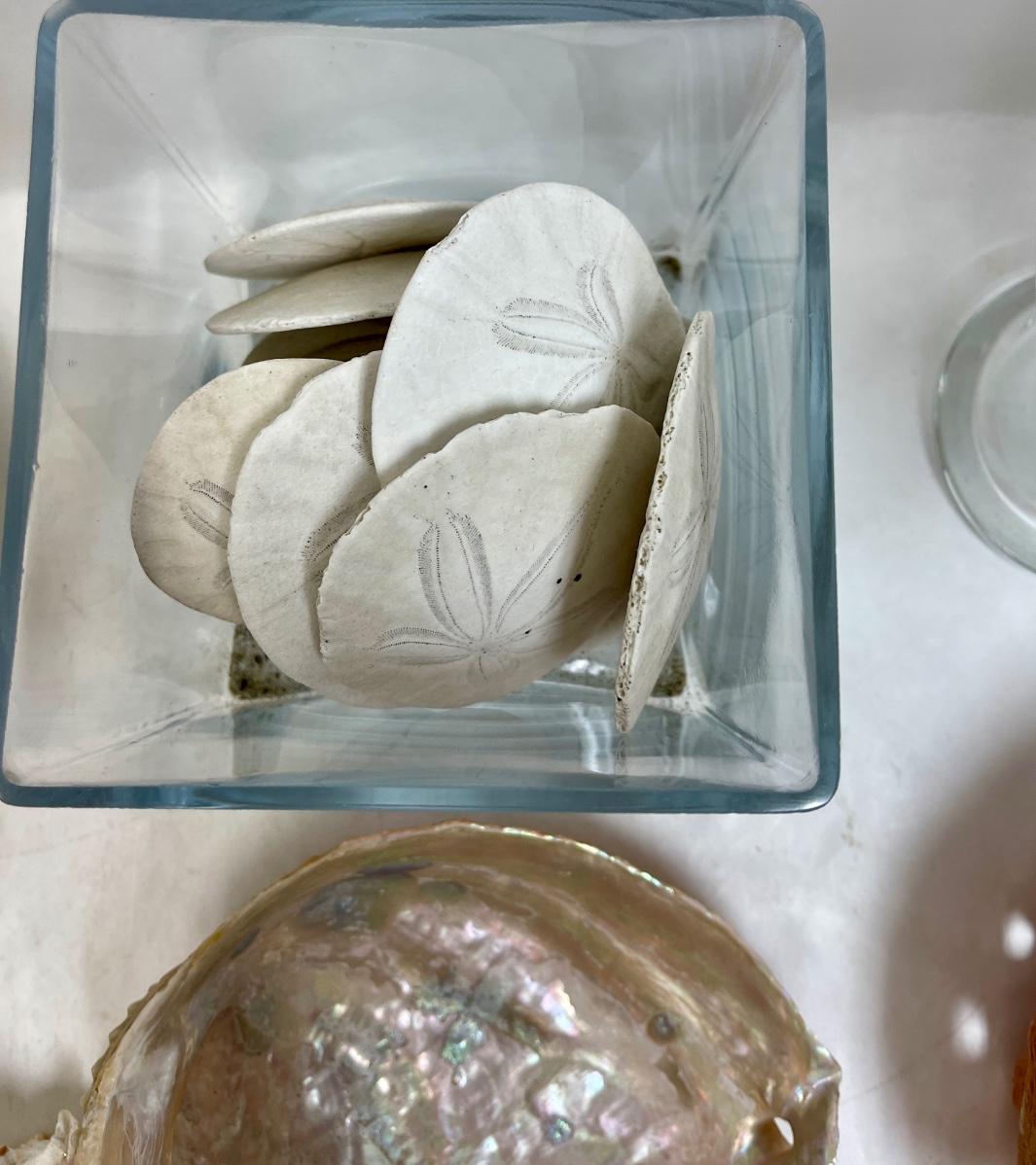 Sea Shell Lot - various types and sizes, including Sand Dollars with three glass containers