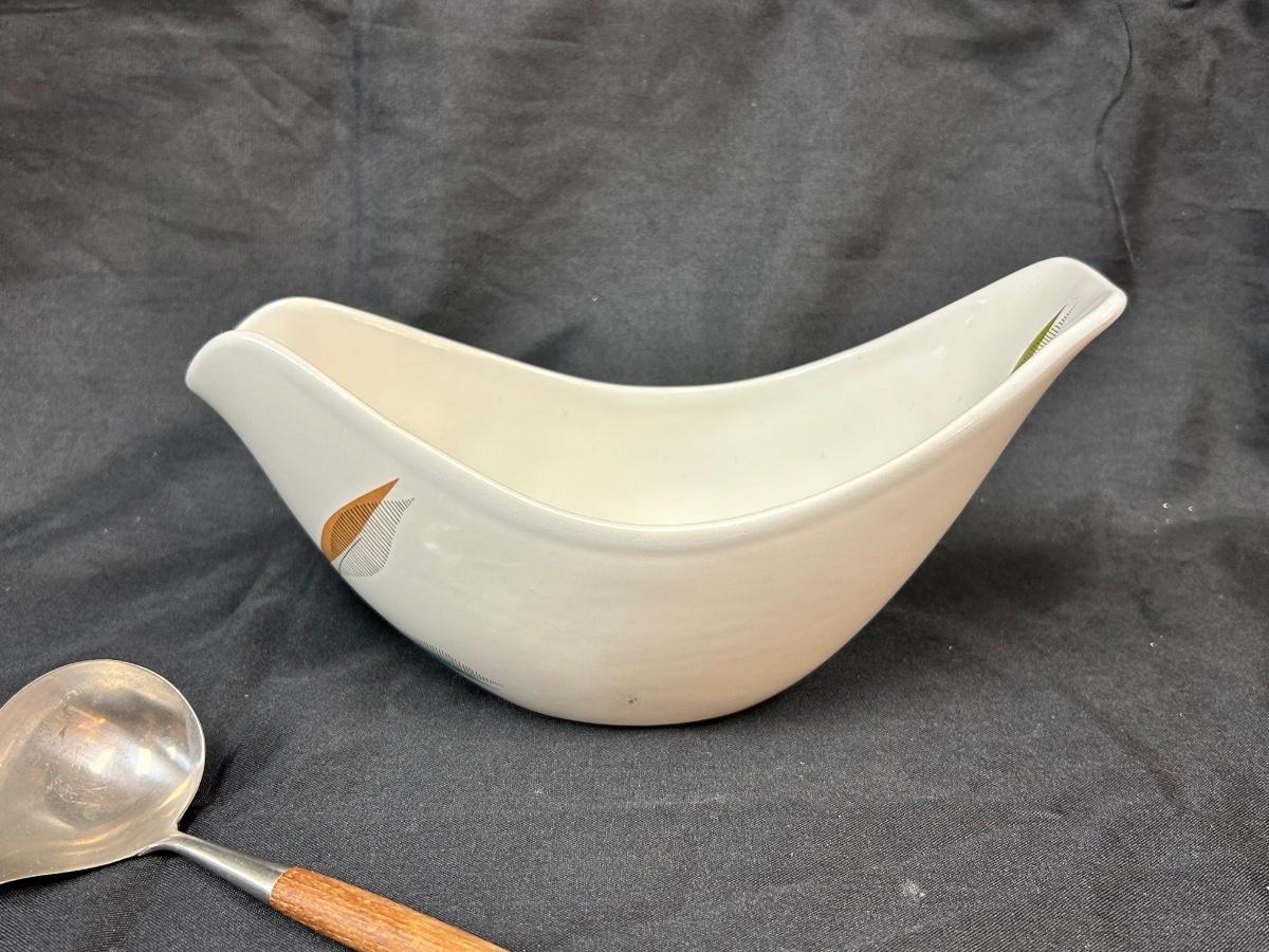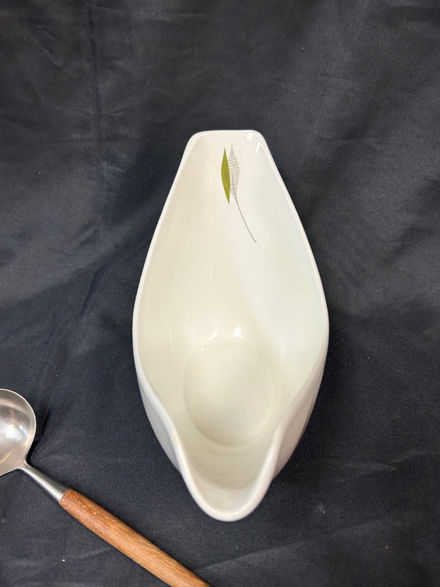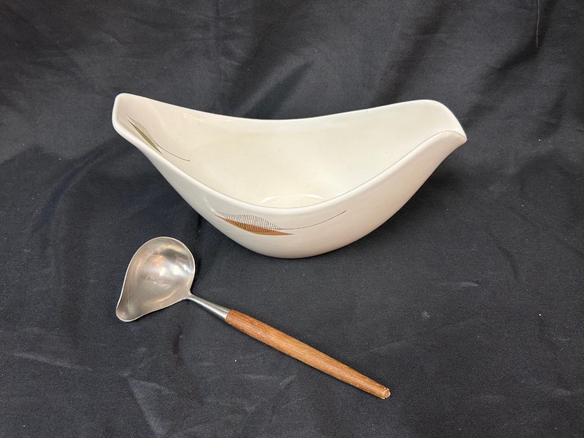 Vintage Midcentury Festive Leaves Raymor Universal Ben Seibel Design Serving Gravy Sauce Bowl with Teak Handle Ladle Spoon