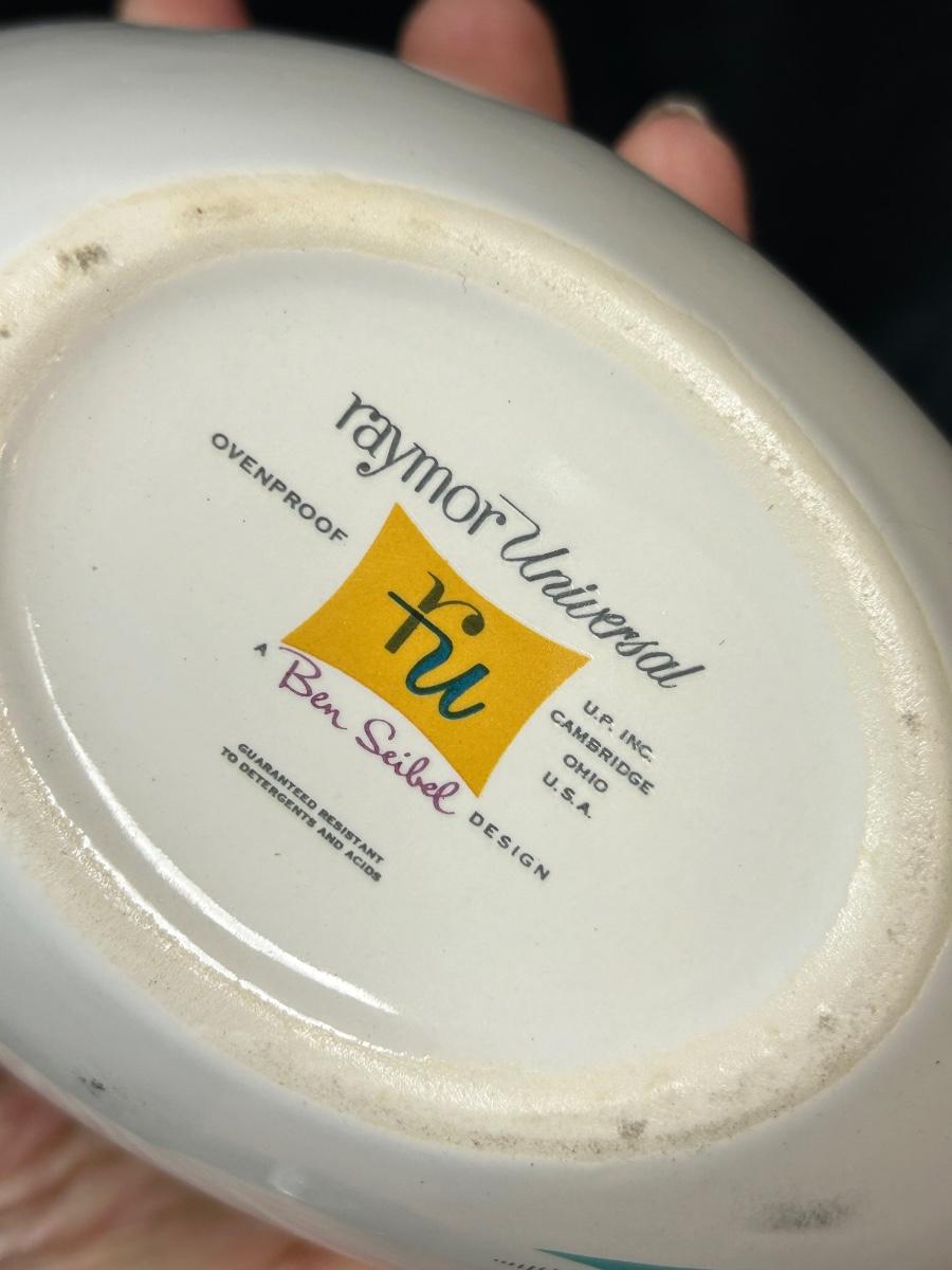 Vintage Midcentury Raymor Universal Ben Seibel Design Serving Gravy Sauce Bowl with Teak Handle Ladle Spoon. Festive Leaves pattern. In good vintage condition. Unfortunately, the end of ladle has been broken.