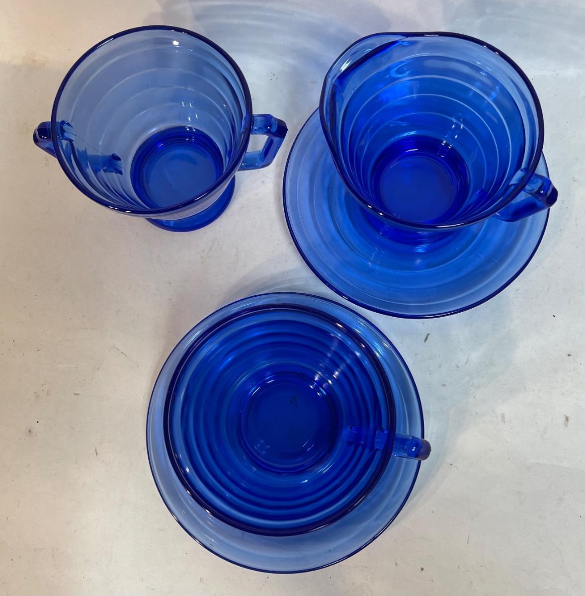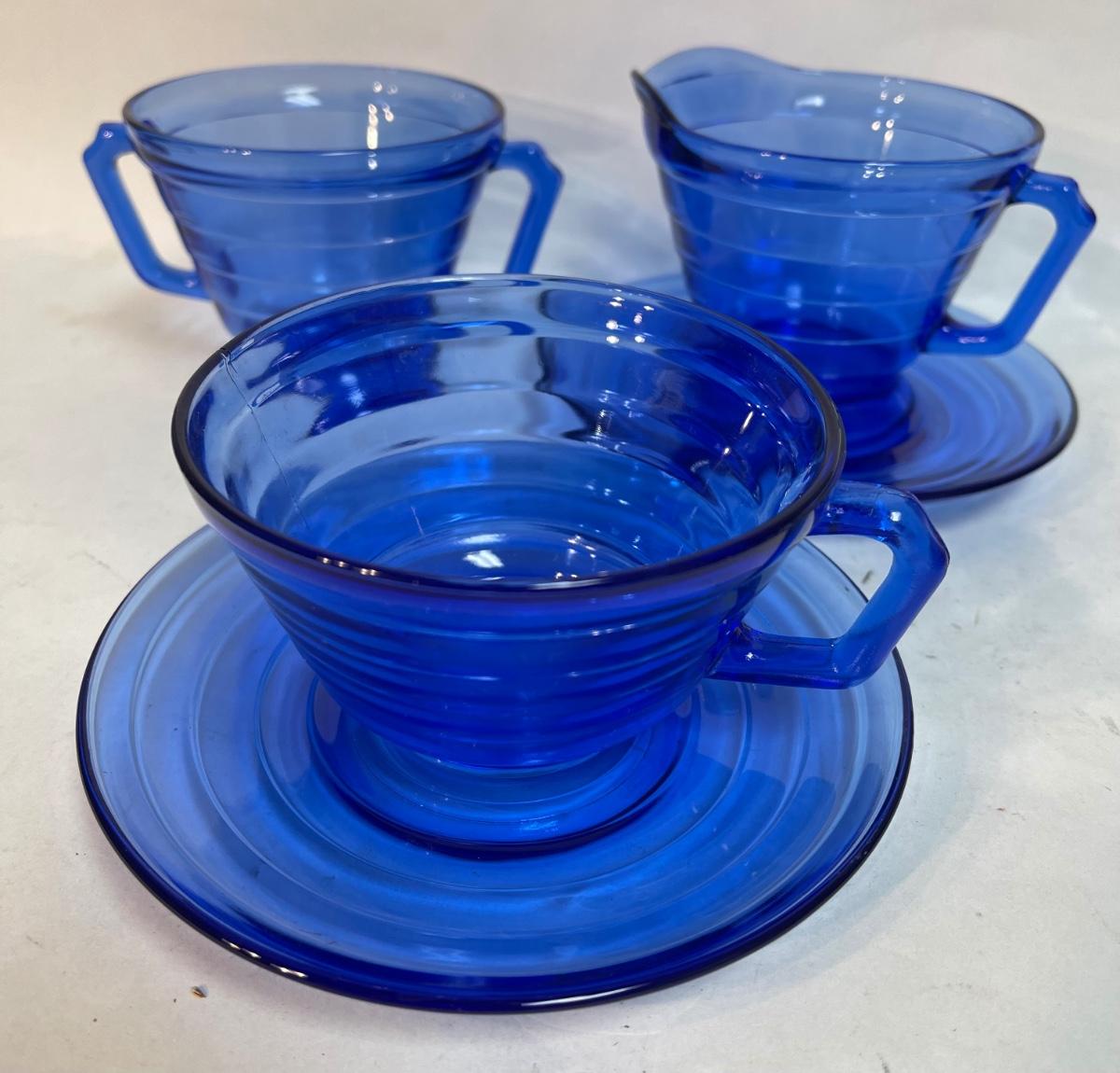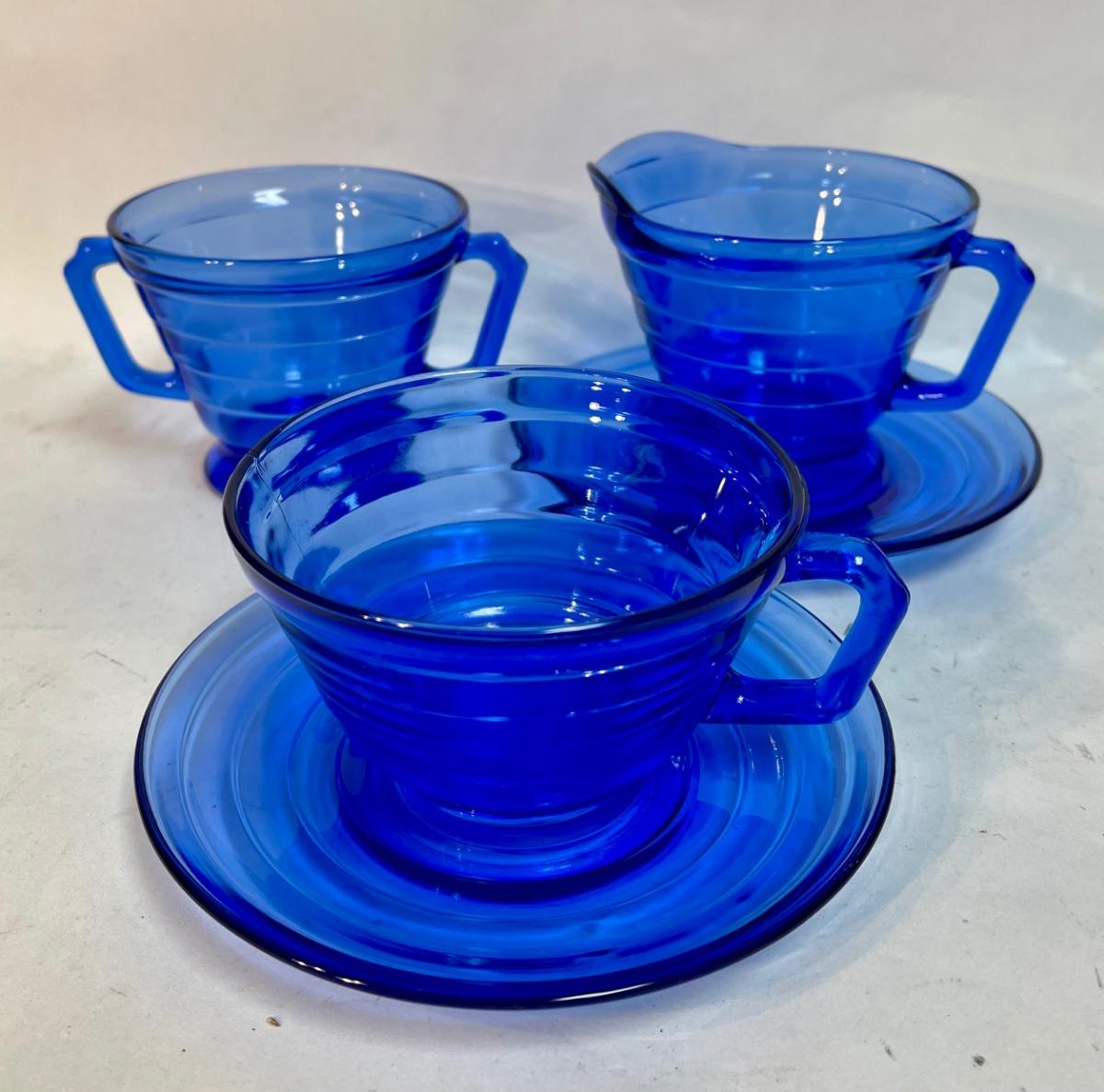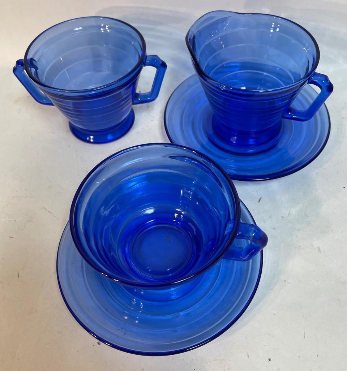 Hazel Atlas Cobalt Blue Moderntone 1940's Depression Glass Sugar, Creamer, & cup with saucer