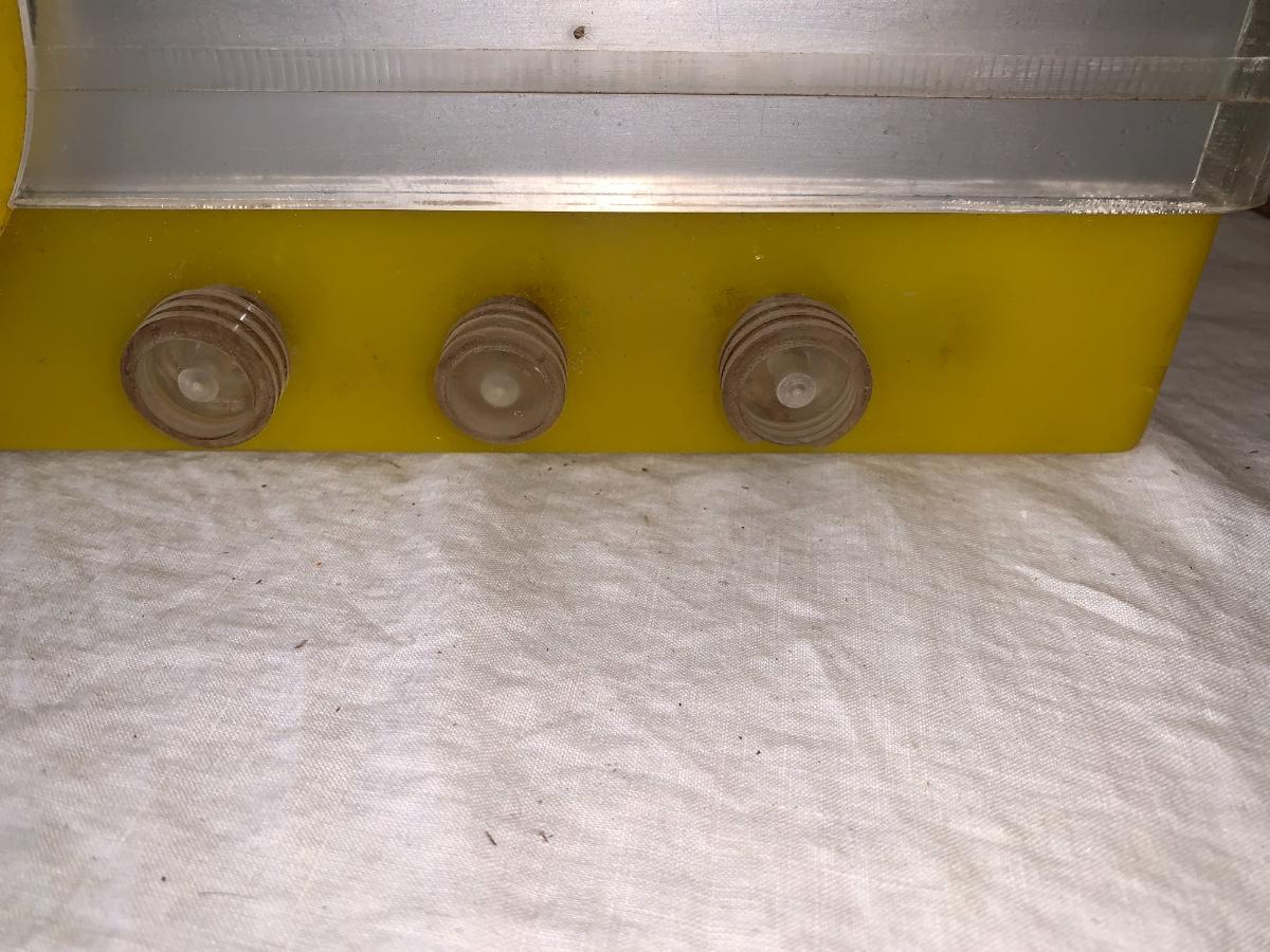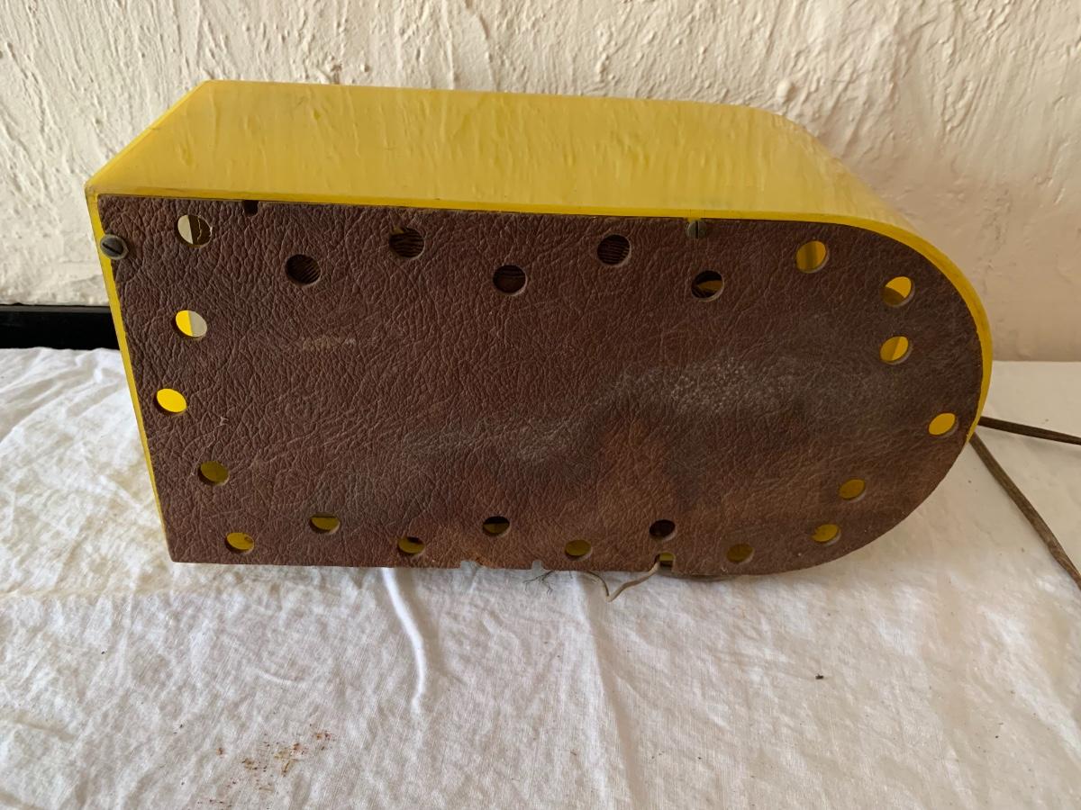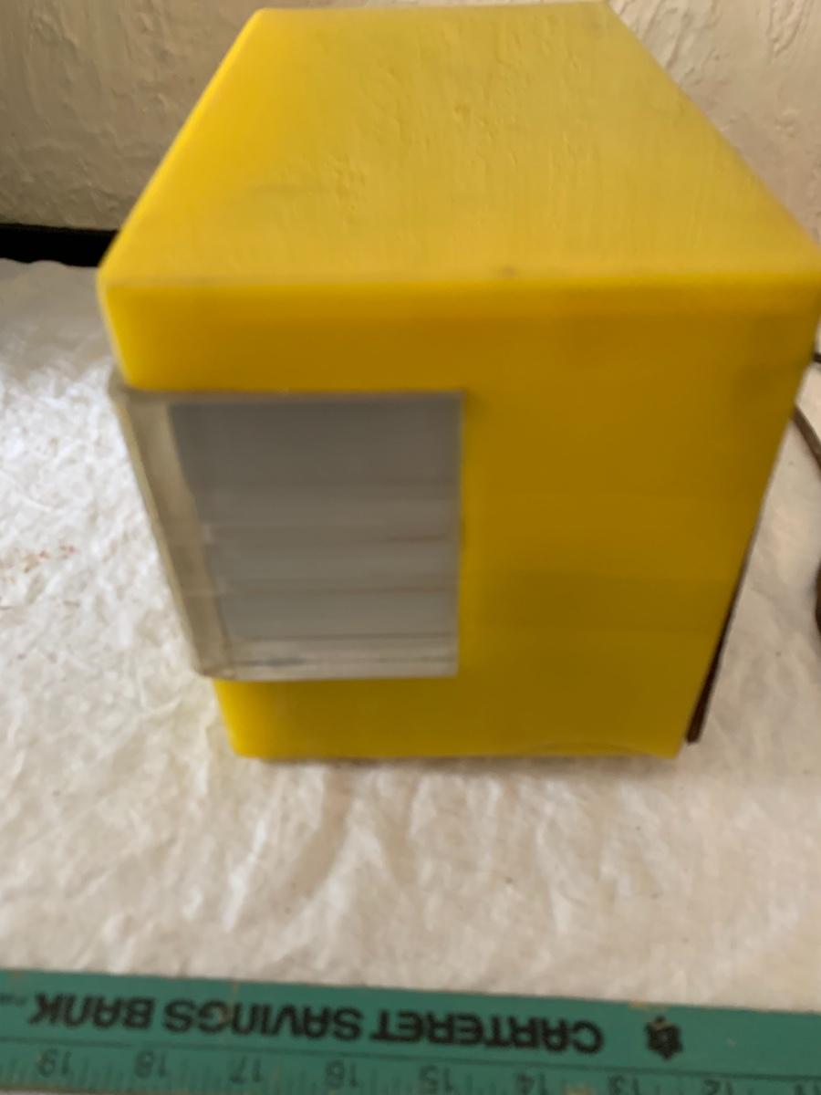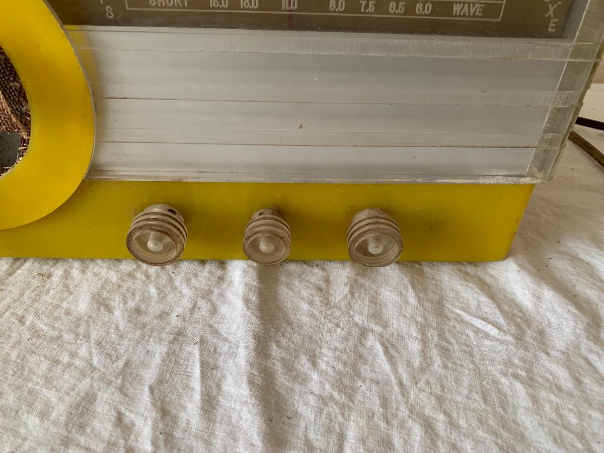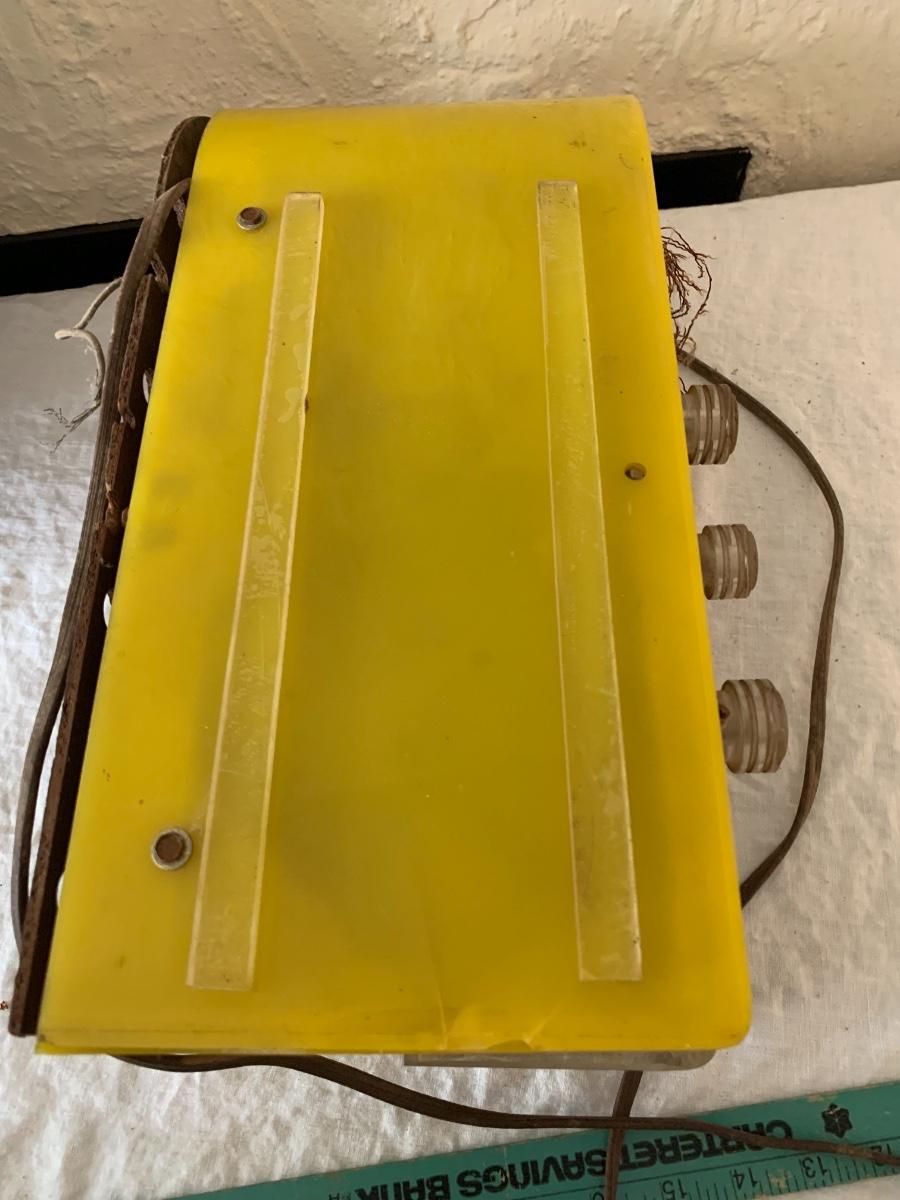 This model was advertised as the 'Moderne'. The cabinet is not molded but rather fabricated out of sheets of colored Plexon, making for an unusual radio. As you can see there are conditon issues. Has plug but has not been tested. BUt truly a one of a kind radio.