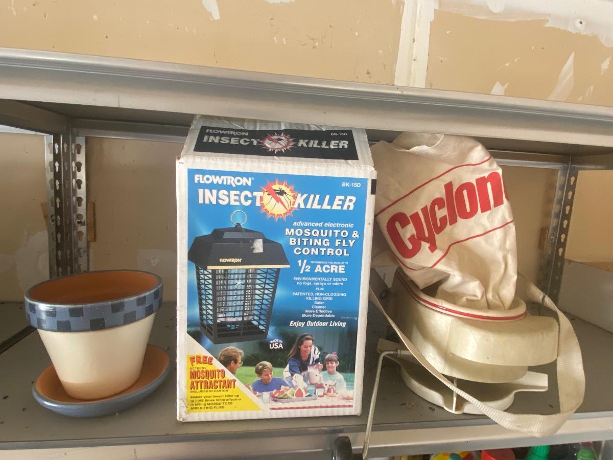 CYCLONE SPREADER, FLOWTRON BUG ZAPPER, CLAY FLOWER POT