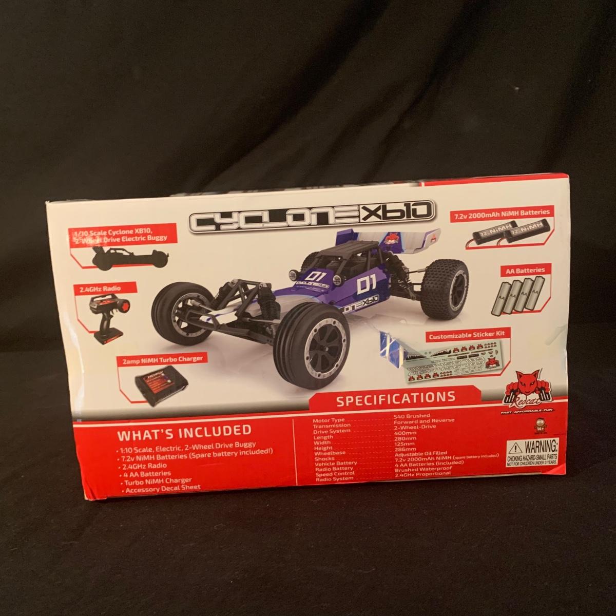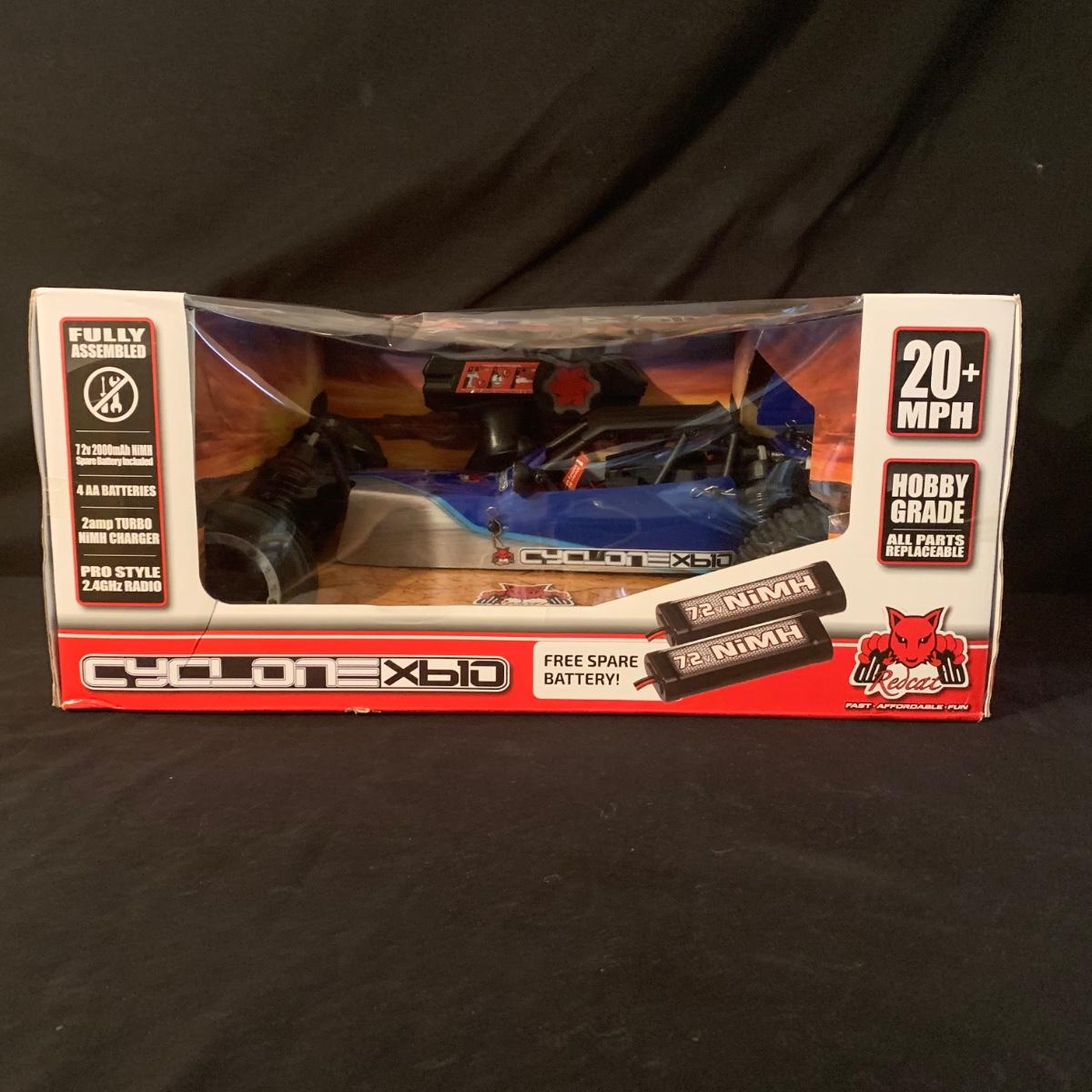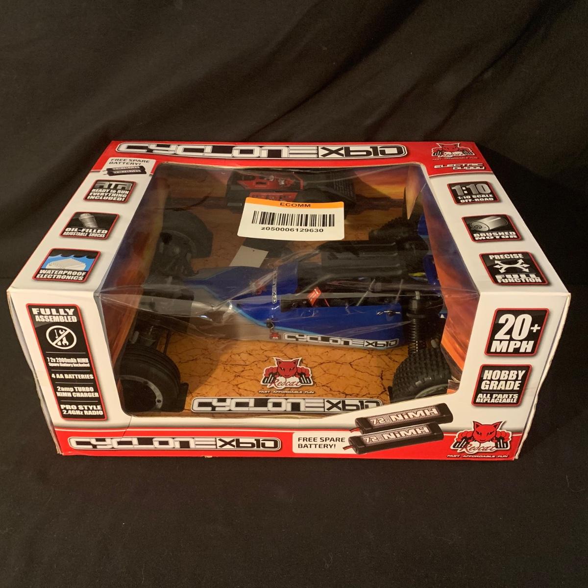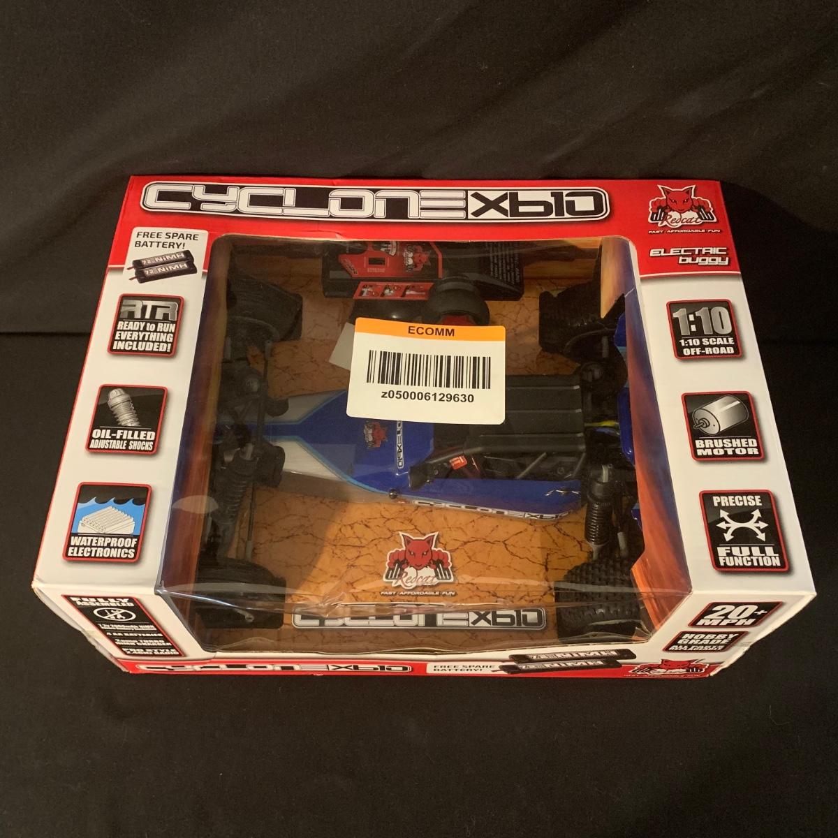 Fully assembled Cyclone xB10 remote controlled electric buggy. Completely unopened (not tested). This R/C car is hobby grade, features waterproof electronics, and is able to travel up to twenty mph. It also comes with a free spare battery. Item is for ages 14+. Box measures, 17”L x 12W x 8”H.