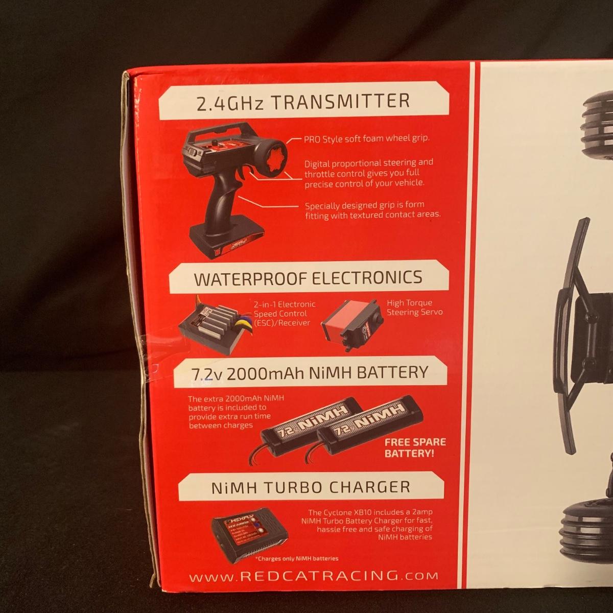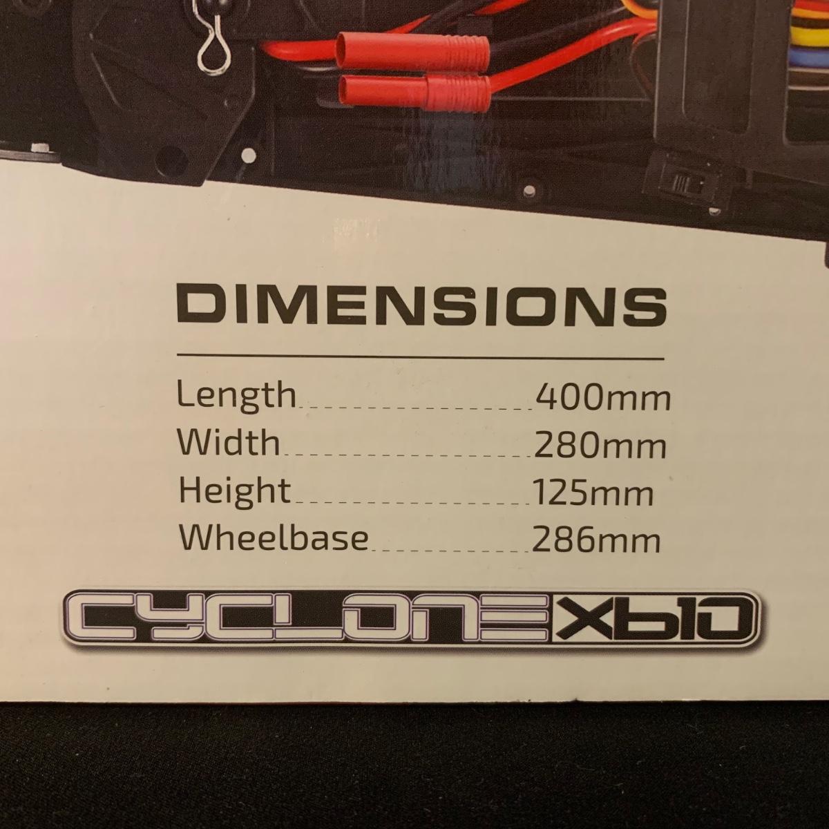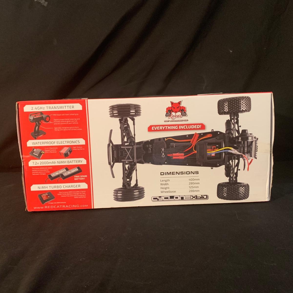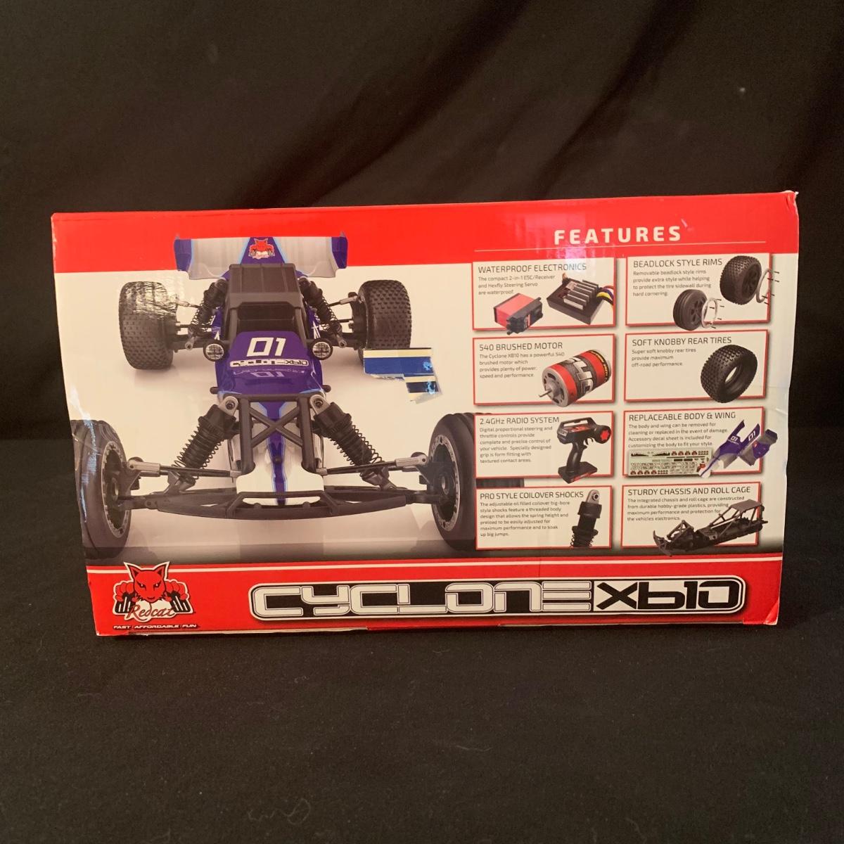 Fully assembled Cyclone xB10 remote controlled electric buggy. Completely unopened (not tested). This R/C car is hobby grade, features waterproof electronics, and is able to travel up to twenty mph. It also comes with a free spare battery. Item is for ages 14+. Box measures, 17”L x 12W x 8”H.
