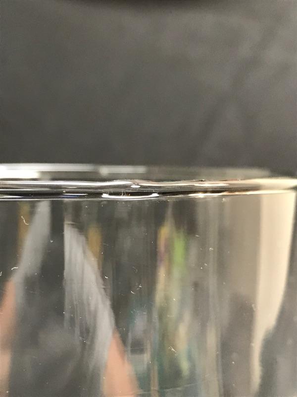 Glass has imperfections that look like they came from the factory, including bubbles and a deformation around the rim; see pictures.