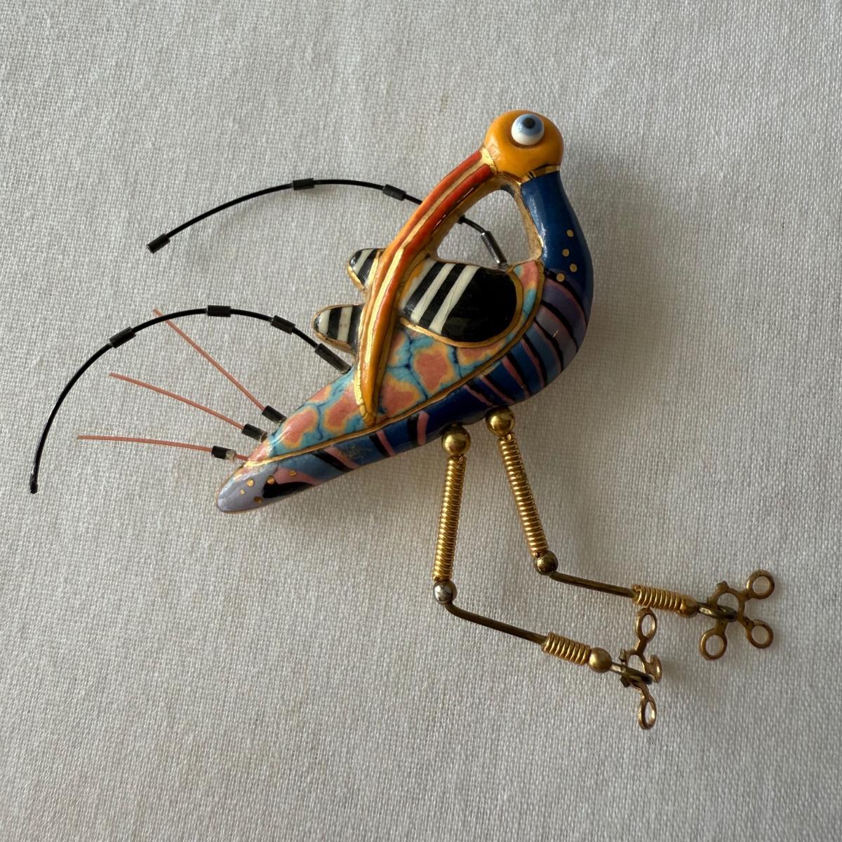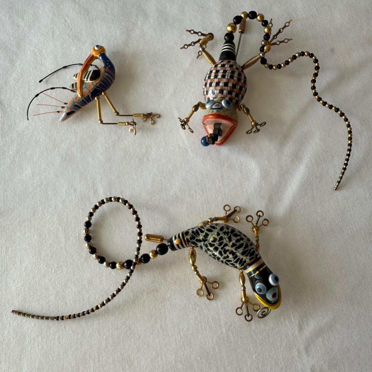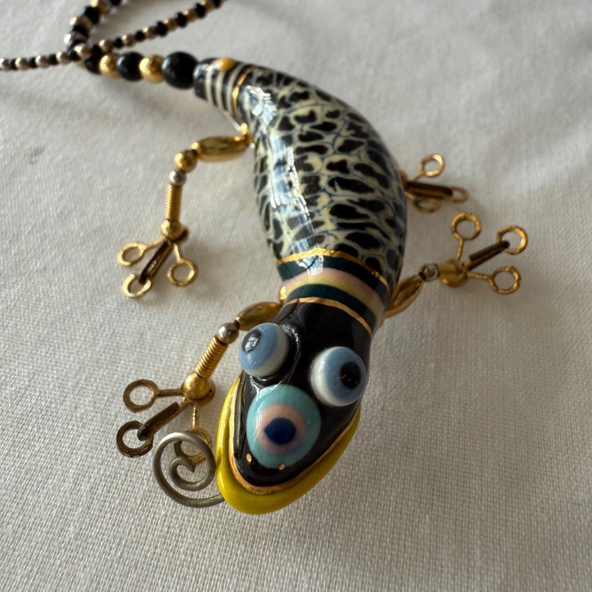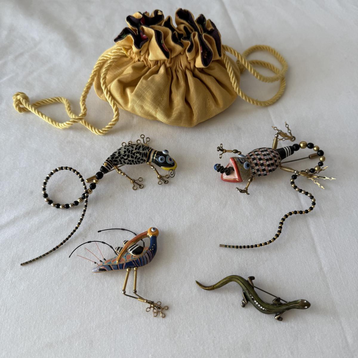 Three super fun porcelain animal brooches, marked with ‘Jewelry 10’, signifying artist Cynthia Chaung. The reptile with the spiral wire tongue is approximately 6” x 3” including the tail. It looks like his jaw broke off and was glued back on, but this is not seen from the side shown when worn. A small rhinestone adorned salamander pin is included too, as well as a fabric bag for storing.