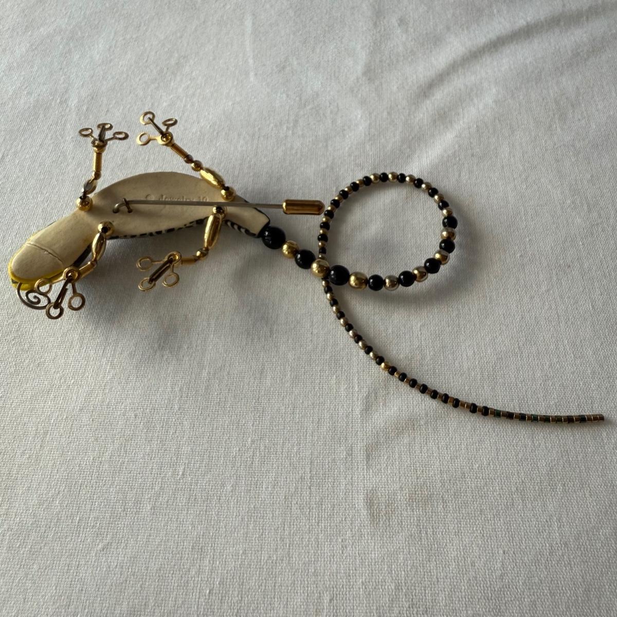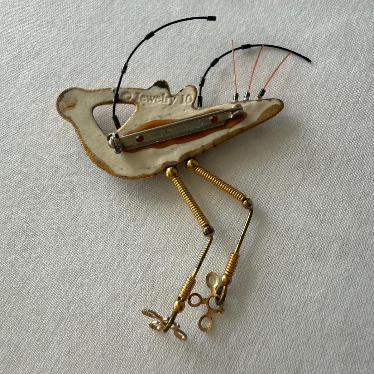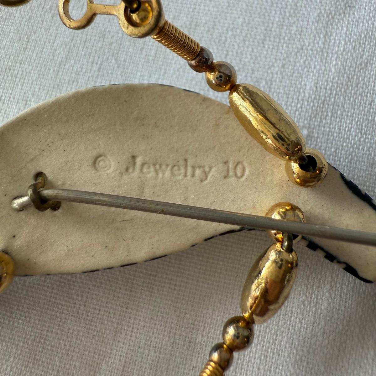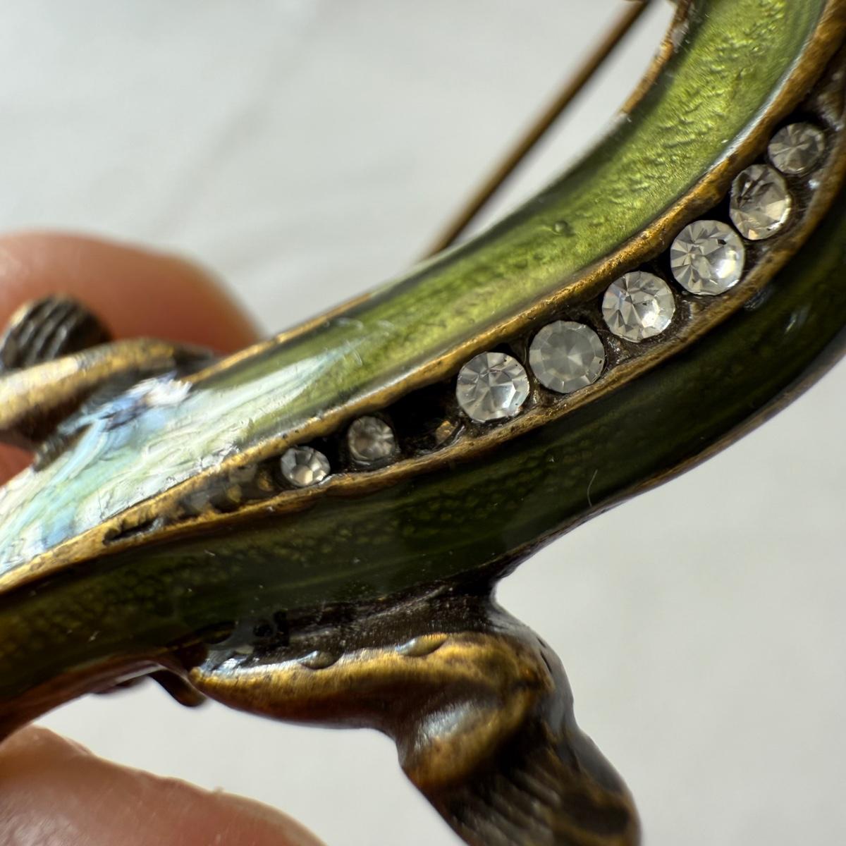 Three super fun porcelain animal brooches, marked with ‘Jewelry 10’, signifying artist Cynthia Chaung. The reptile with the spiral wire tongue is approximately 6” x 3” including the tail. It looks like his jaw broke off and was glued back on, but this is not seen from the side shown when worn. A small rhinestone adorned salamander pin is included too, as well as a fabric bag for storing.