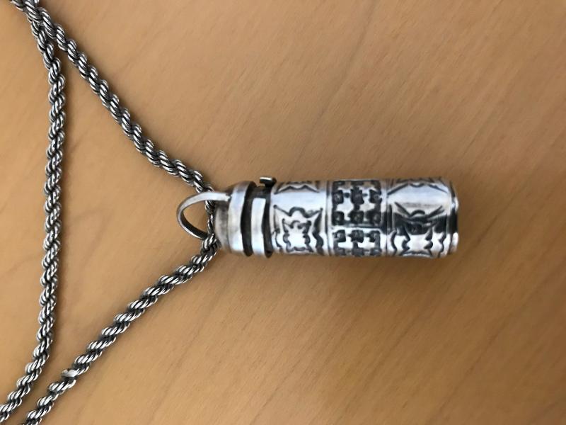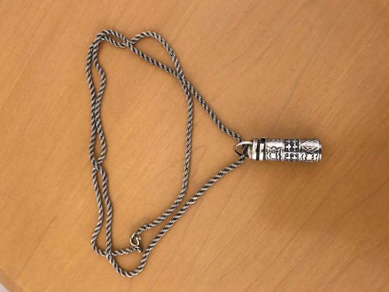 Lovely heavy sterling 26" rope chain, marked 925 on clasp. Includes Cynthia Gayle sterling message bottle with lid. All over geometric engraving, marked 925 on bottom. A blessing from the Washington National Cathedral is included inside.