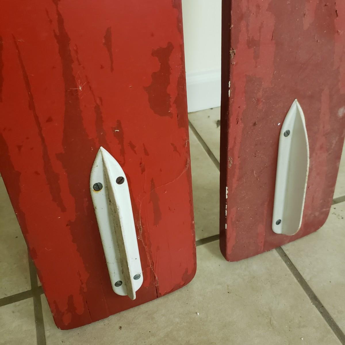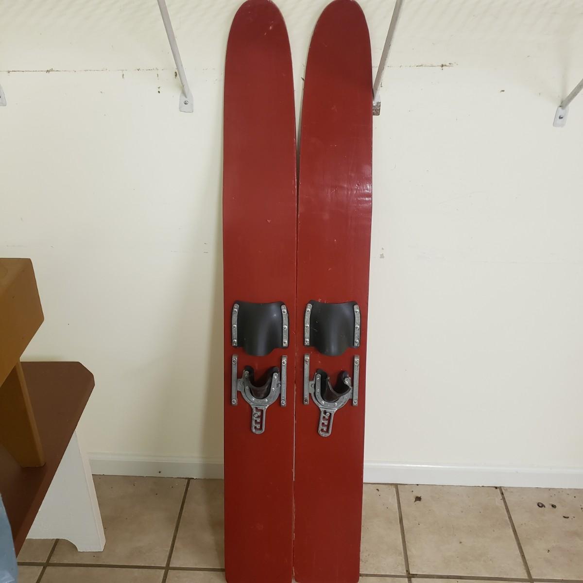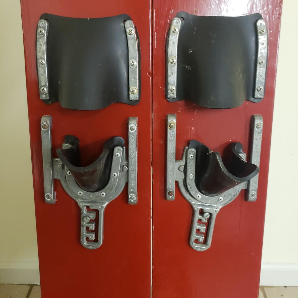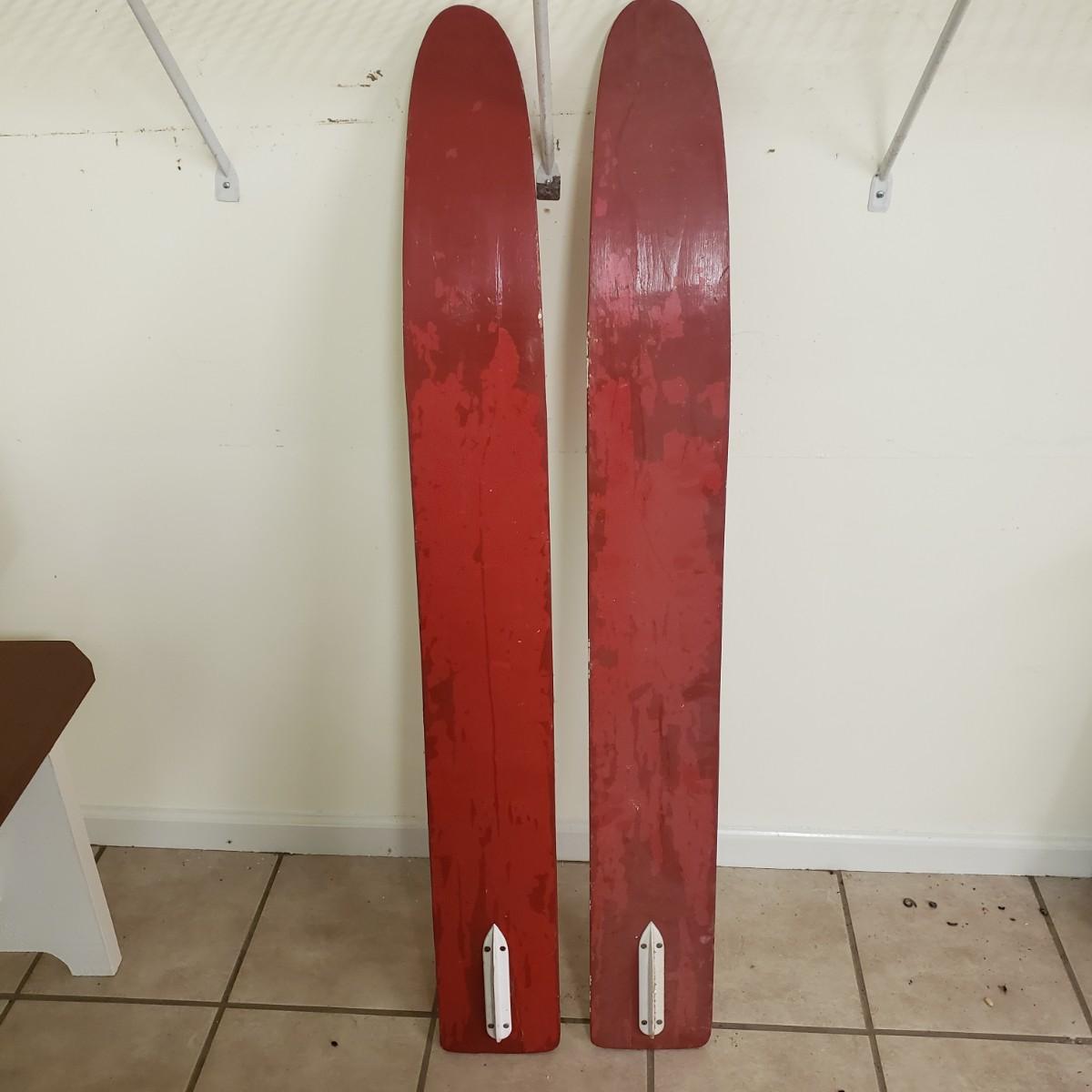 This is a pair of red wooden water skis with "Cypress Garden Skis" on the adjustable metal foot brackets, see picture. The skis measure 7" x 54"H. There is discoloration on the paint, but it's smooth to the touch, so it appears not to be chipping. One ski at the end has a small dent, but the paint is not chipped, see last picture.
