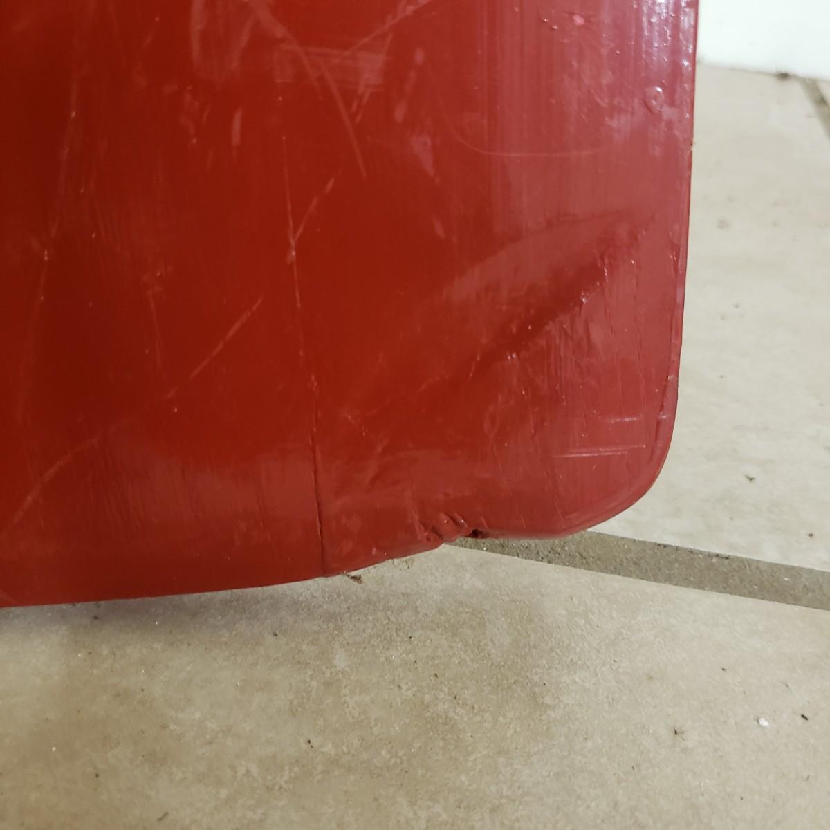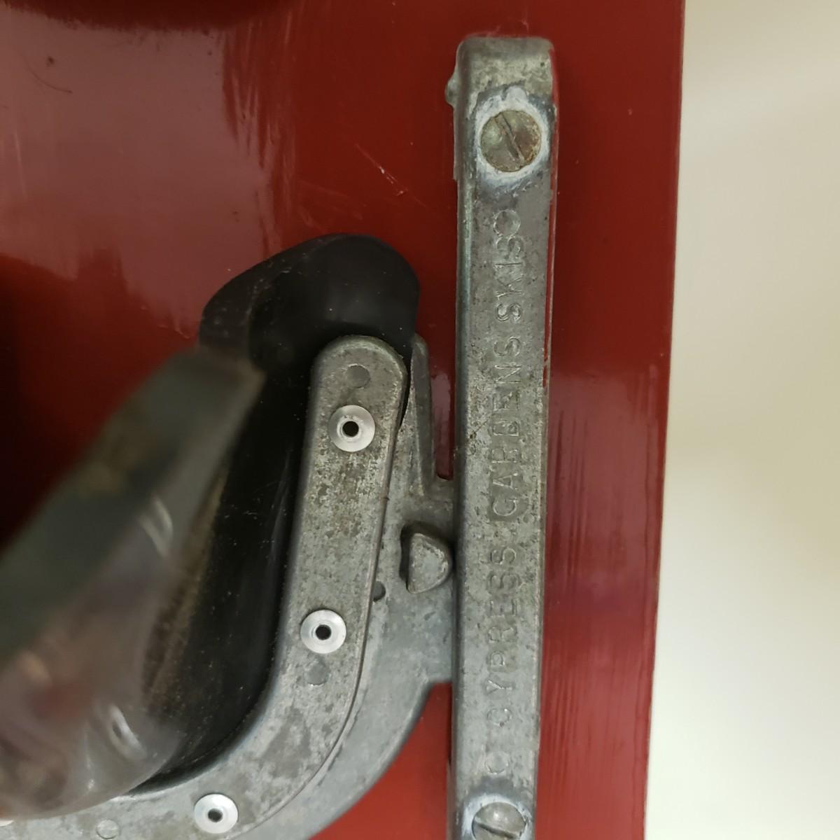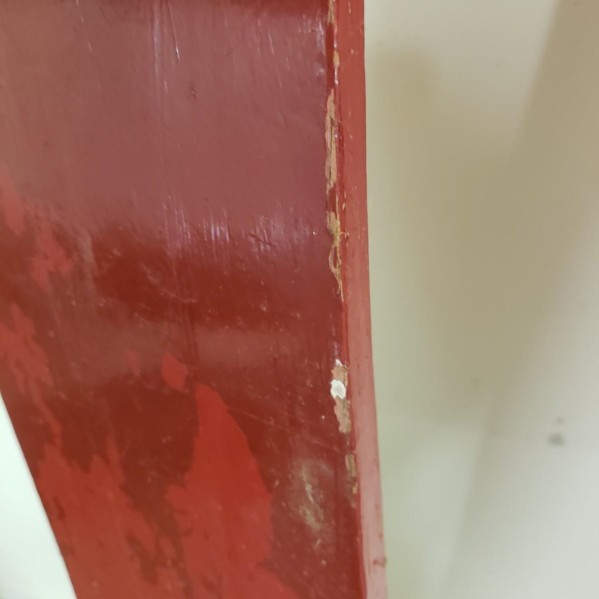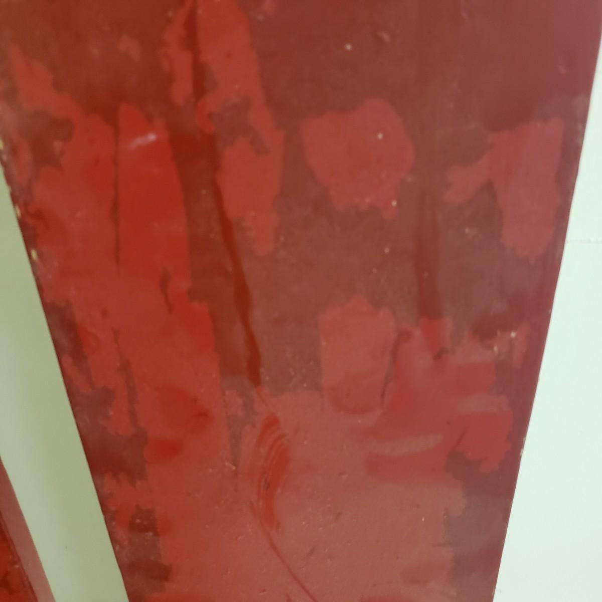 This is a pair of red wooden water skis with "Cypress Garden Skis" on the adjustable metal foot brackets, see picture. The skis measure 7" x 54"H. There is discoloration on the paint, but it's smooth to the touch, so it appears not to be chipping. One ski at the end has a small dent, but the paint is not chipped, see last picture.