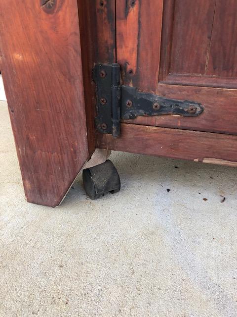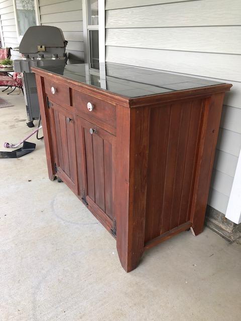 47 1/2”X 24” X 36”. Tiled surface. Two drawers with custom knobs. Three shelves for storage on behind left cabinet door. Trash bin tips out for easy use. Cabinet on 4 castors. Towel