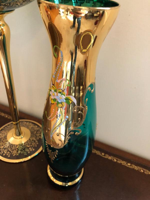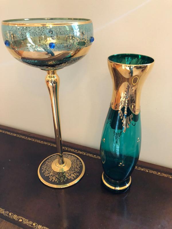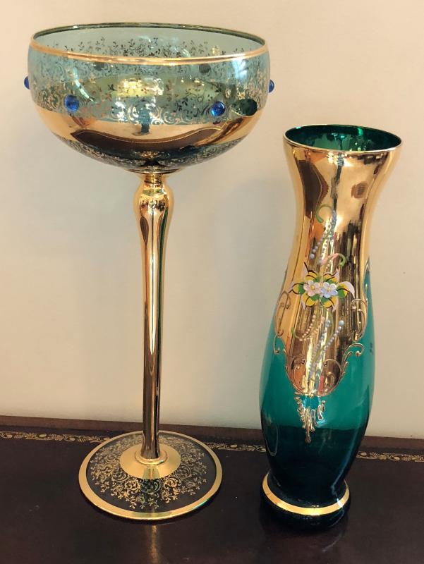 Czechoslovakian or Bohemian Glass Gold Overlay Vase, Tall Dish