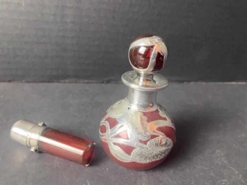 1 ) Cranberry Glass Bottle & Stopper with Sterling Silver