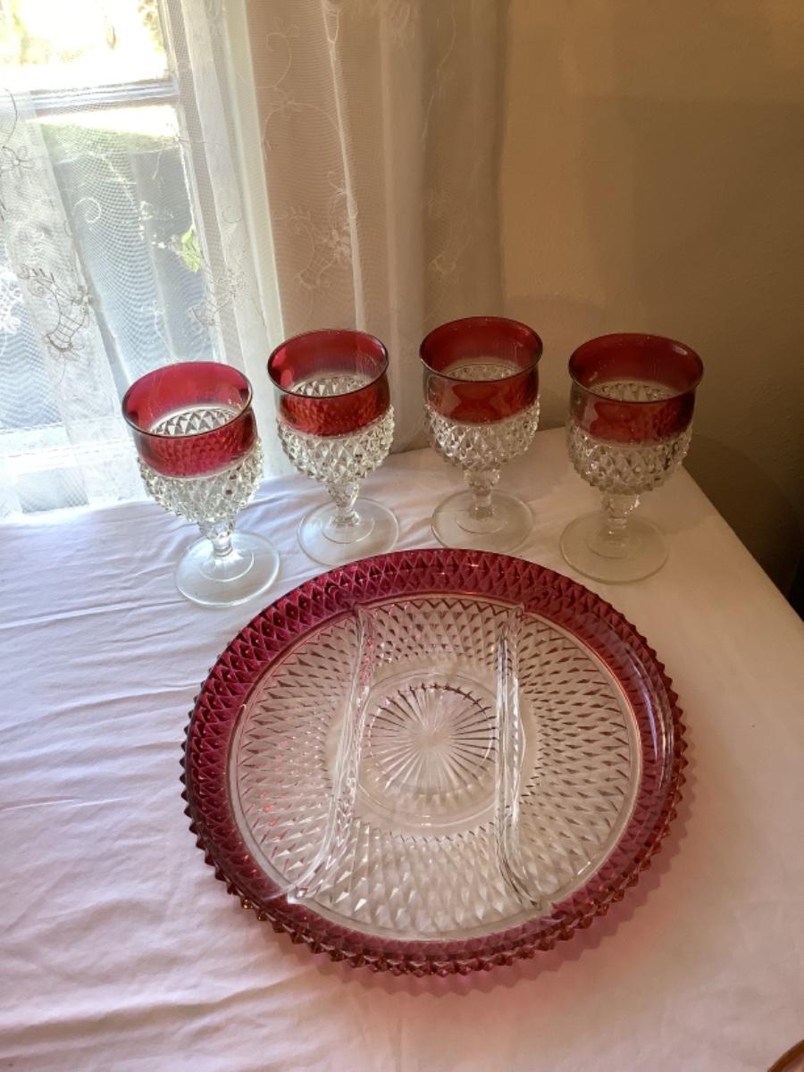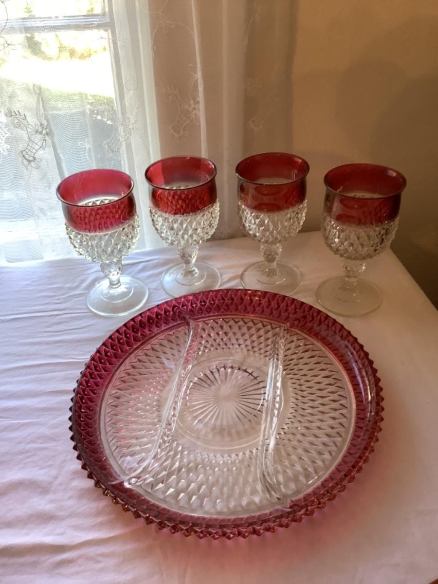 D - 1020 Vintage Ruby Flash Glass Tiffin Thumbprint Goblets & Sectional Tray