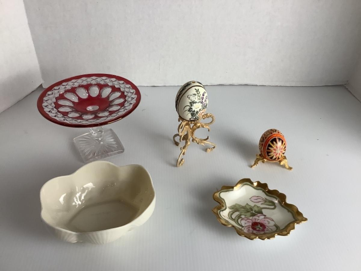 D. 1254. Decorative Eggs, Irish Belleek, Limoges, Flash Glass