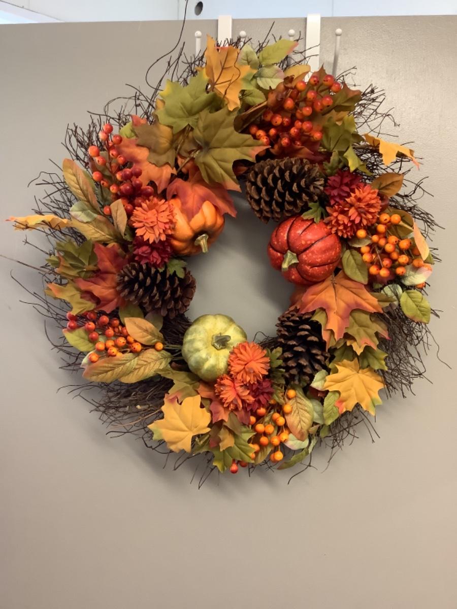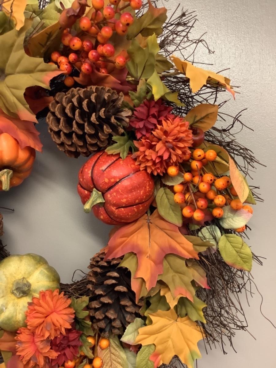 Beautiful Fall Wreath with pumpkins, pine ones, berries and more -