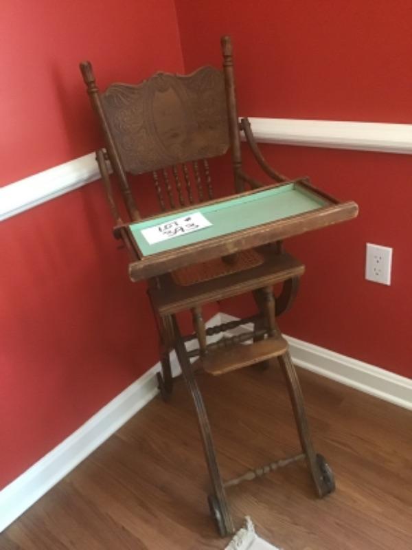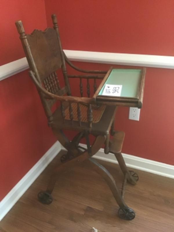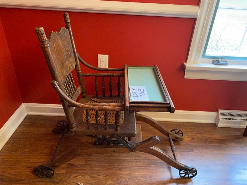 D - 393. Antique Child Wooden Folding High Chair and Cart