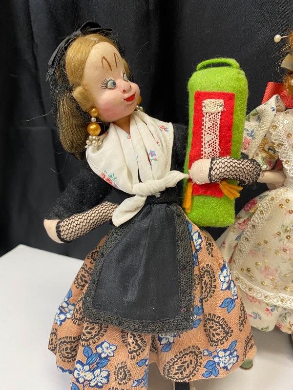 Vintage 1950s Klumpe Roldan dolls. 5 dolls total. 2 matadors, the bull, and two ladies watching. Cloth/felt bodies with wire inside. Faces are cloth but have been hardened. Painted facial expressions. Under 11" size. In very good condition. One still has an original Klumpe tag attached. Display nicely, stand on their own but would be better if they had a stand for support.