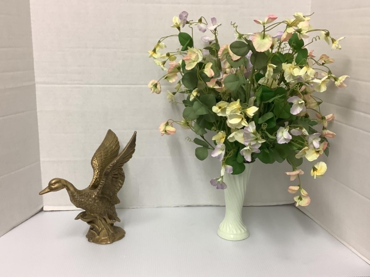 D - 569  Brass Mallard Duck Figure with Silk Flowers in Vase