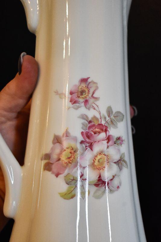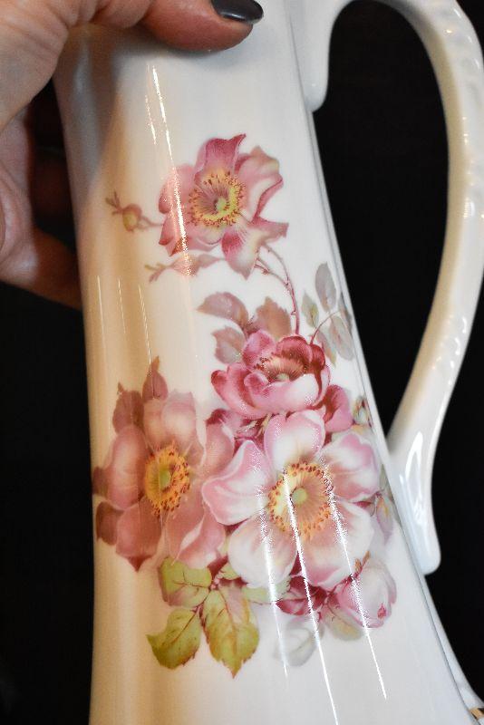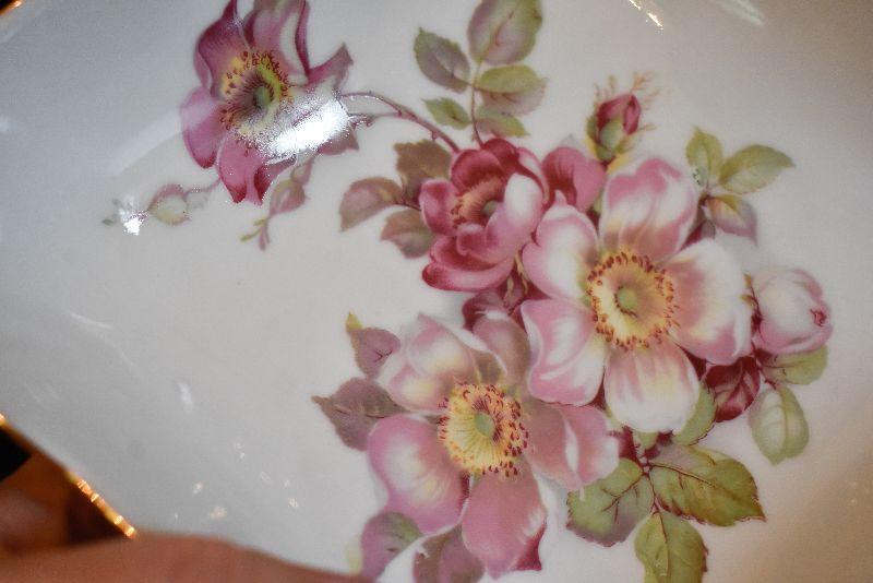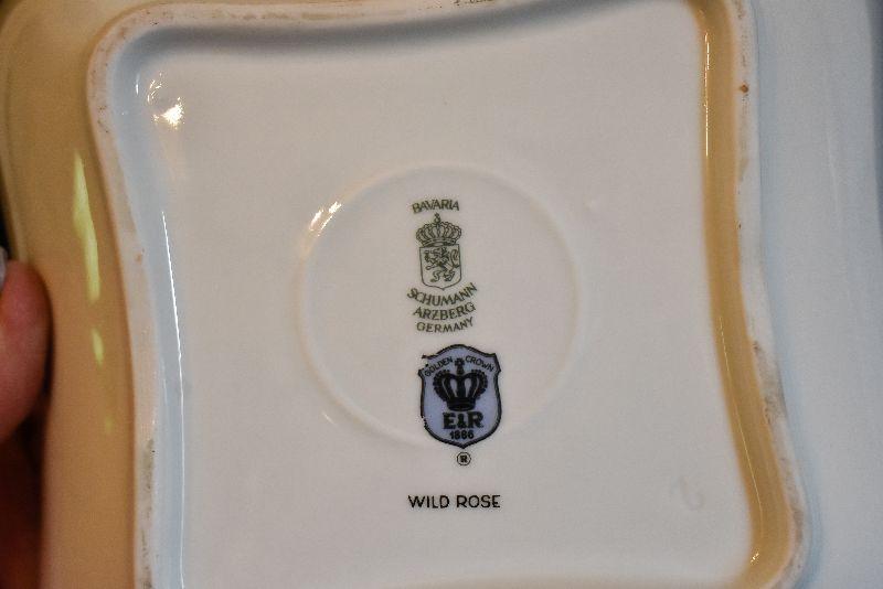 Schumann Arzberg Germany Golden Crown E&R 1886 dish and Gerold Porzellan Tettau Bavaria, made in West Germany pitcher; both in Wild Rose pattern.